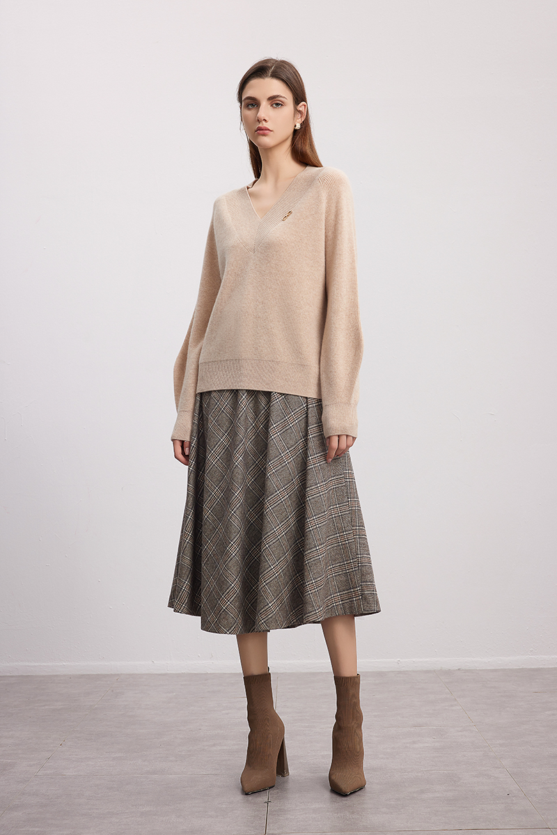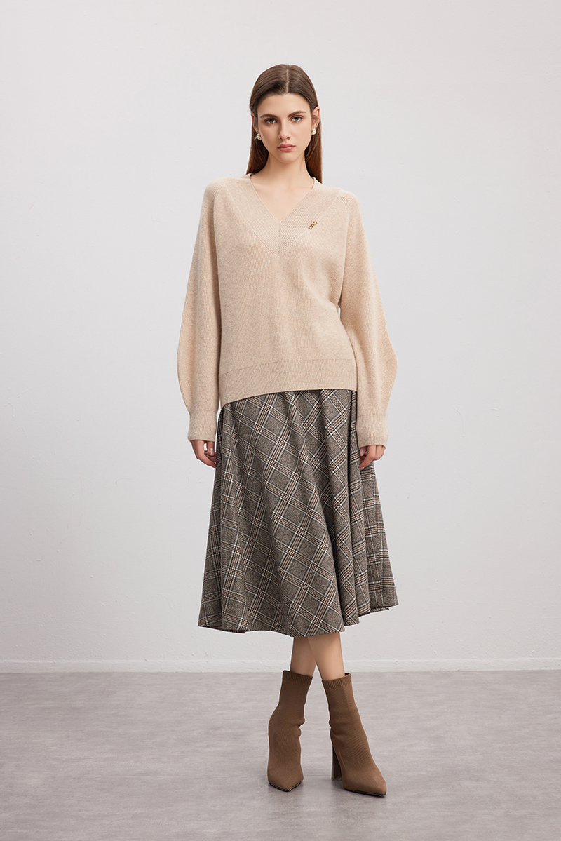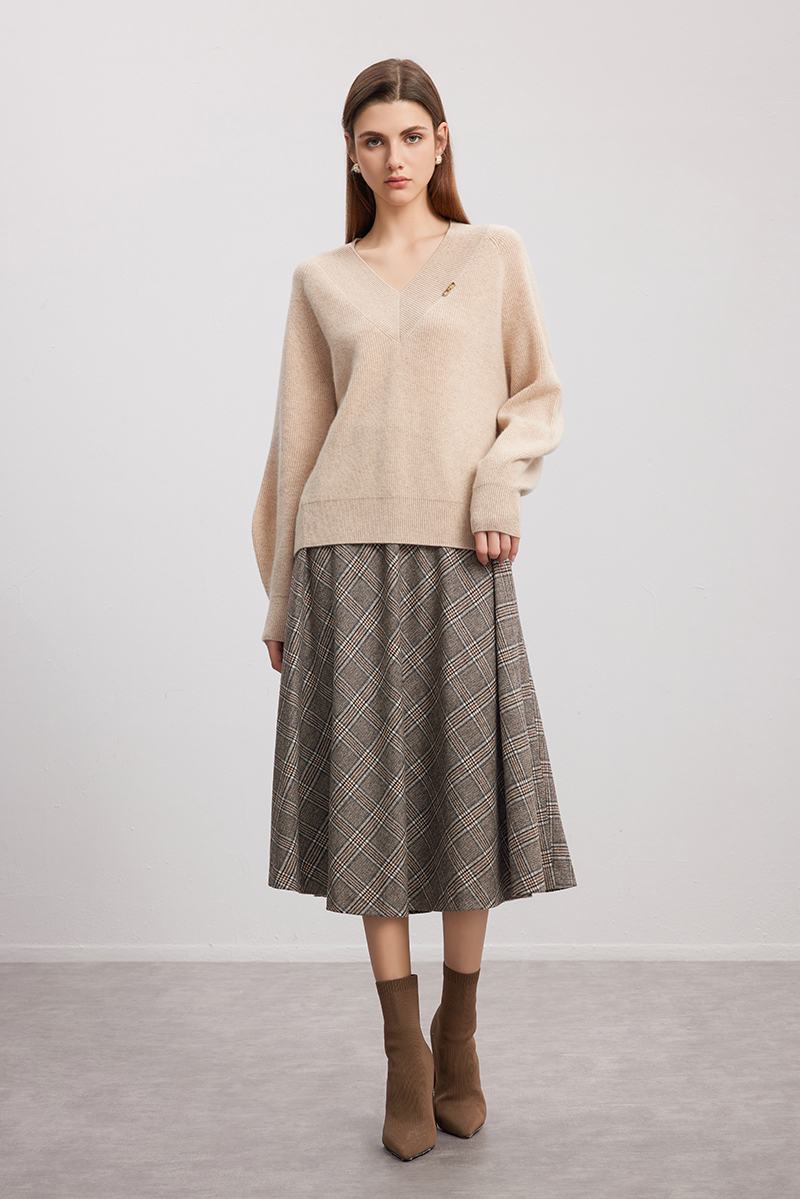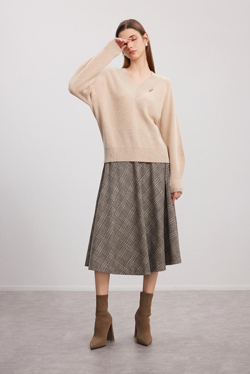 【咖格纹路羊毛百褶半裙】24年秋冬新品女士羊毛百搭直筒显瘦包臀中长裙