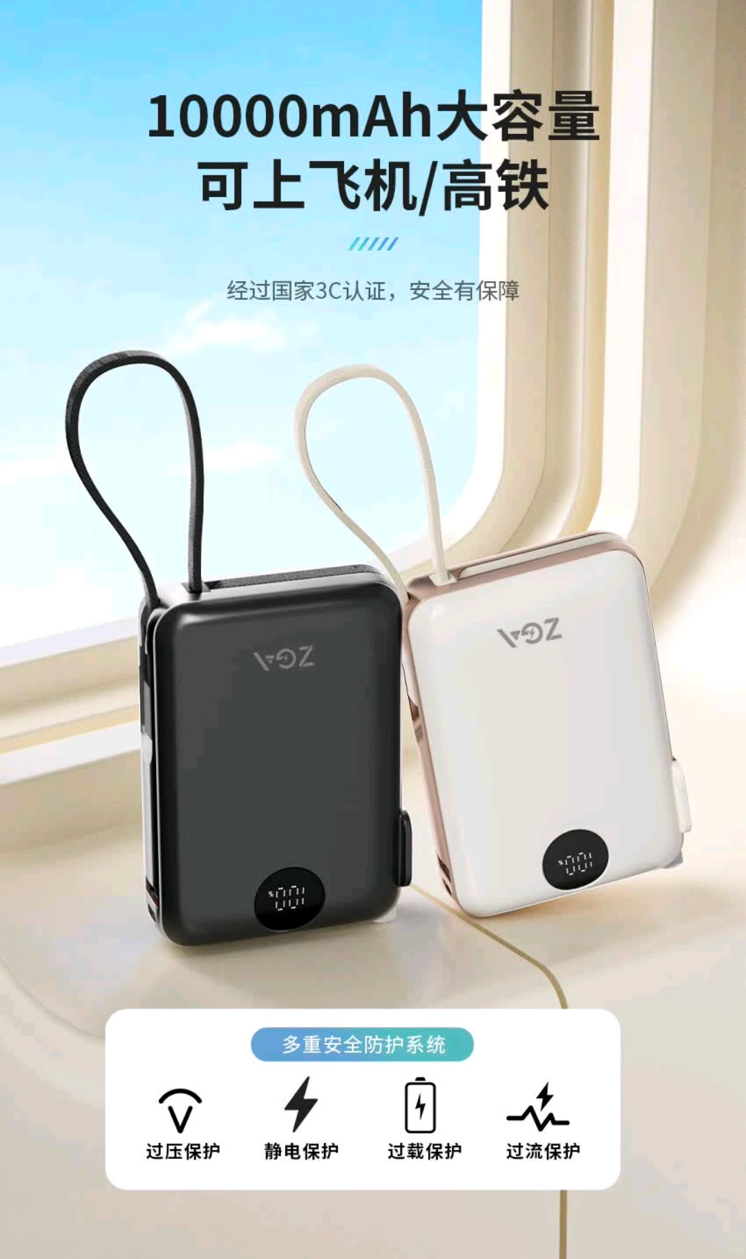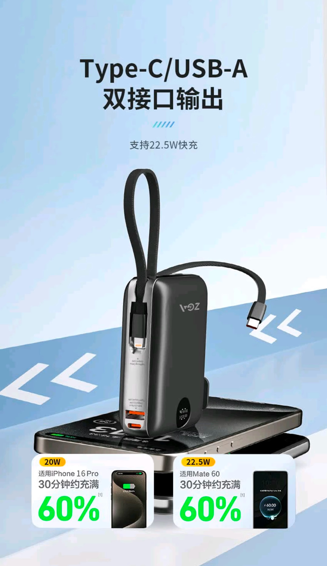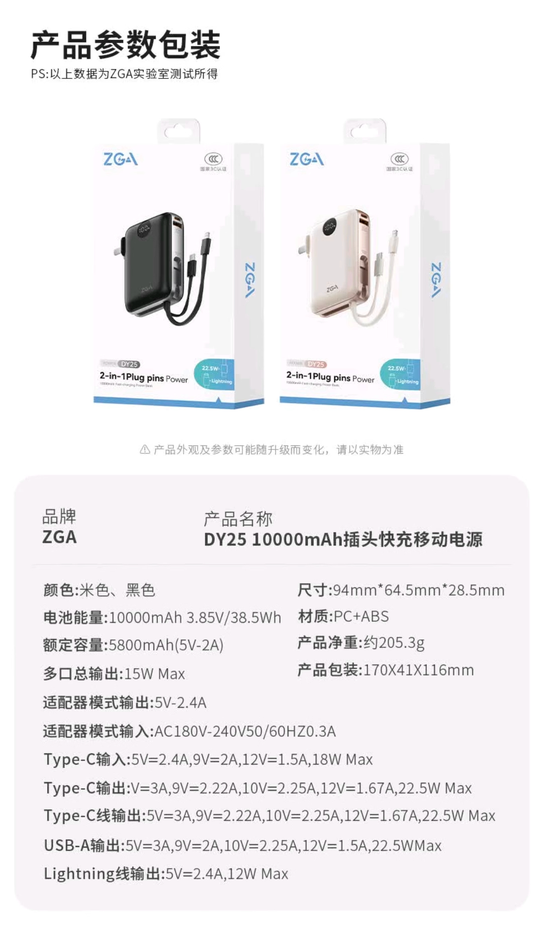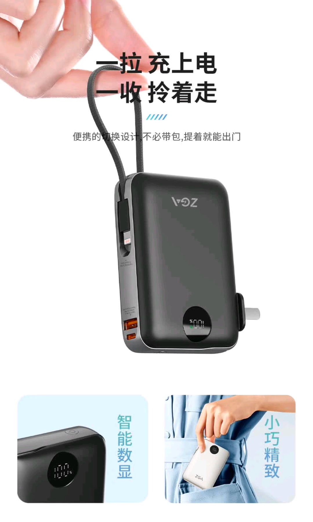 ZGA DY25 10000mAh插头快充移动电源Type-C双线合一充电宝自带线