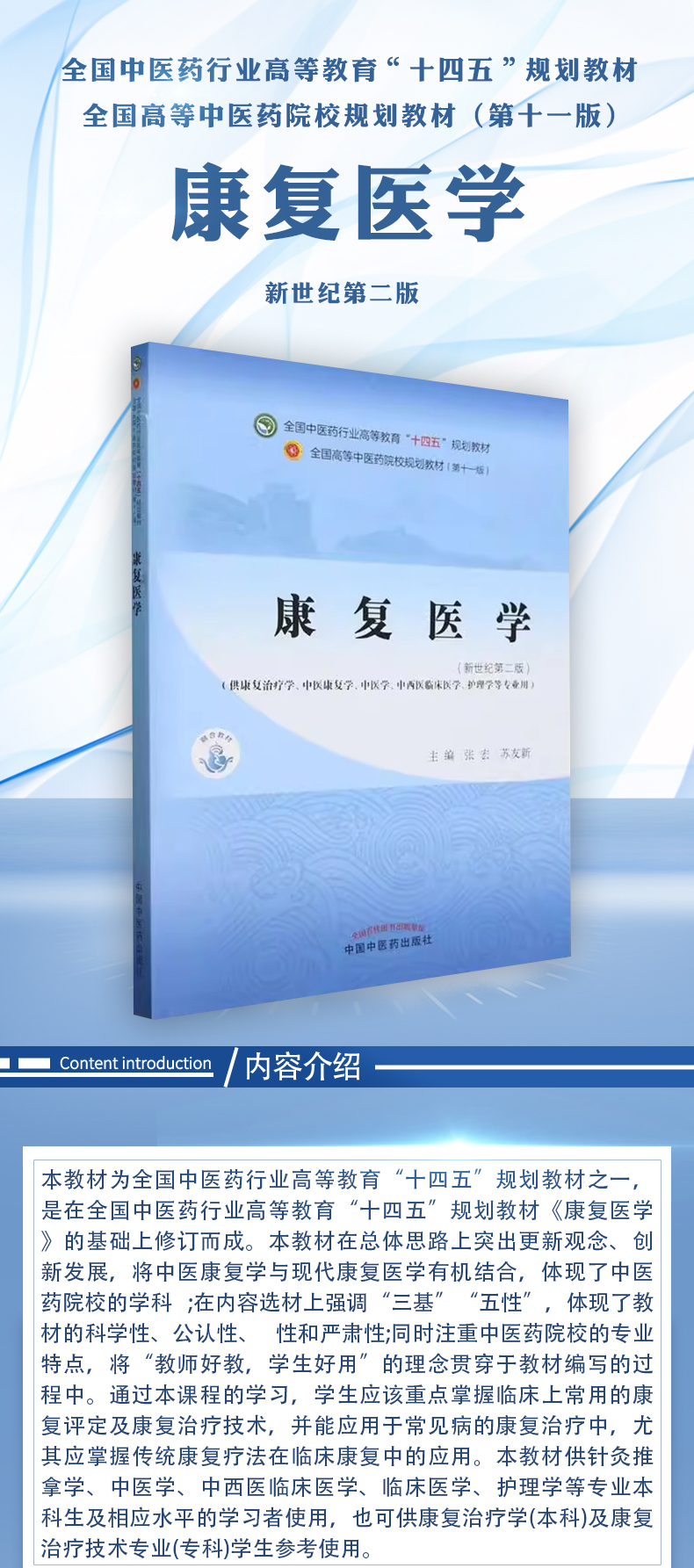 本教材为全国中医药行业高等教育“十四五”规划教材之一,是在全国中医药行业高等教育“十四五”规划教材《康复医学》的基础上修订而成。本教材在总体思路上突出更新观念、创新发展,将中医康复学与现代康复医学有机结合,体现了中医药院校的学科 ;在内容选材上强调“三基”“五性”,体现了教材的科学性、公认性、 性和严肃性;同时注重中医药院校的专业特点,将“教师好教,学生好用”的理念贯穿于教材编写的过程中。通过本课程的学习,学生应该重点掌握临床上常用的康复评定及康复治疗技术,并能应用于常见病的康复治疗中,尤其应掌握传统康复疗法在临床康复中的应用。本教材供针灸推拿学、中医学、中西医临床医学、临床医学、护理学等专业本科生及相应水平的学习者使用,也可供康复治疗学(本科)及康复治疗技术专业(专科)学生参考使用。