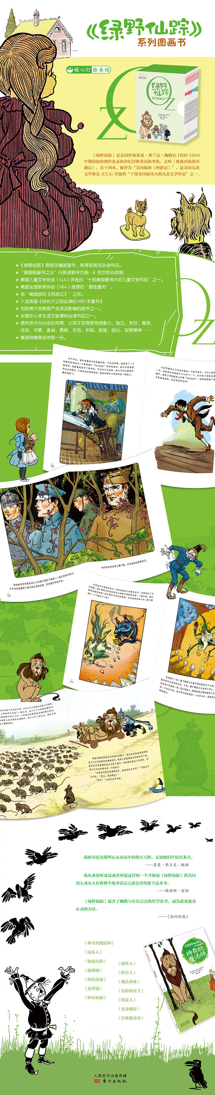 《绿野仙踪》是美国作家莱曼·弗兰克·鲍姆在1900-1919年期间陆续创作发表的奇幻冒险童话故事集,又叫《奥兹国仙境奇遇记》,共十四本,被誉为“美国版的《西游记》”,是美国儿童文学协会(CLA)评选的“十部美国最伟大的儿童文学作品”之一。本系列图书问世之后,引起了巨大反响,百年来兴盛不衰,是世界级经典童话。