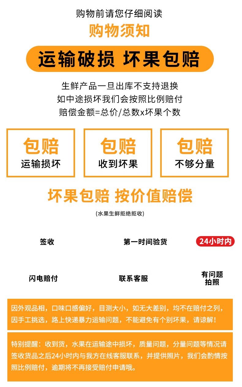 注:水果生鲜售后有保障,但不接受退货(拒签,延迟签收不售后),资料提交齐全,及时反馈,就能快速理赔。