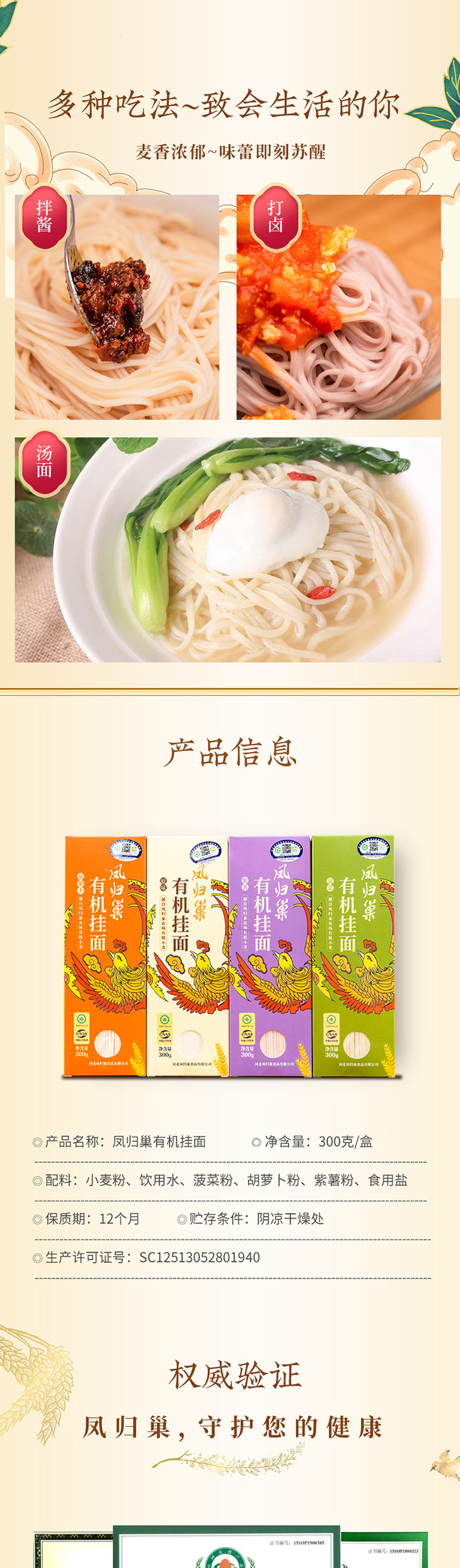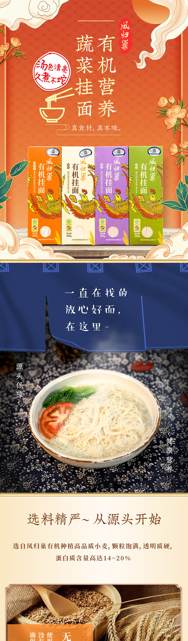 营养有机面粉与蔬菜汁精调配比,不仅营养丰富还柔韧劲道顺滑,不混汤易入味带给您家的味道。