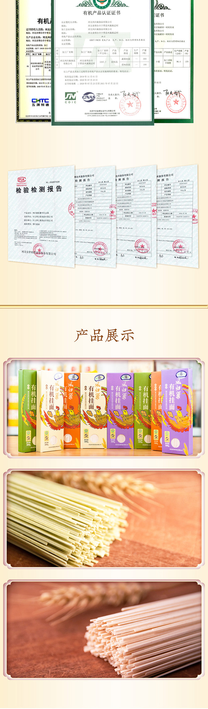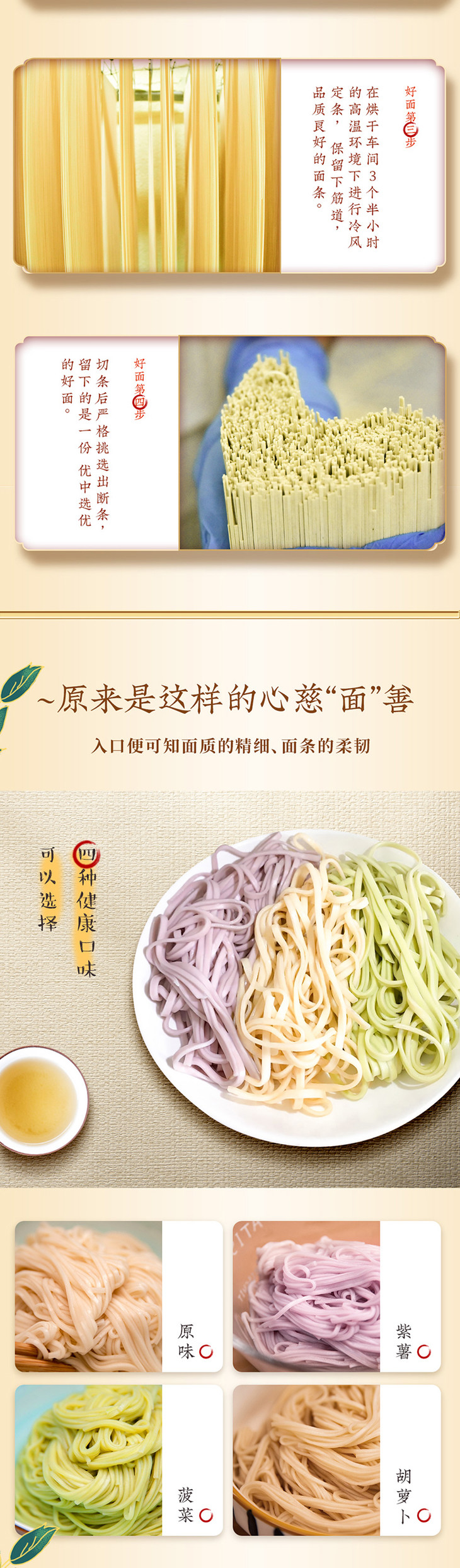 有机石磨面粉和纯净水、蔬菜粉汁按比例调配,除了盐,无额外添加。采用恒温恒湿烘干,3个半小时的高温环境后冷风定条,面条更劲道,切条后严格筛选为您呈现高品质面条。