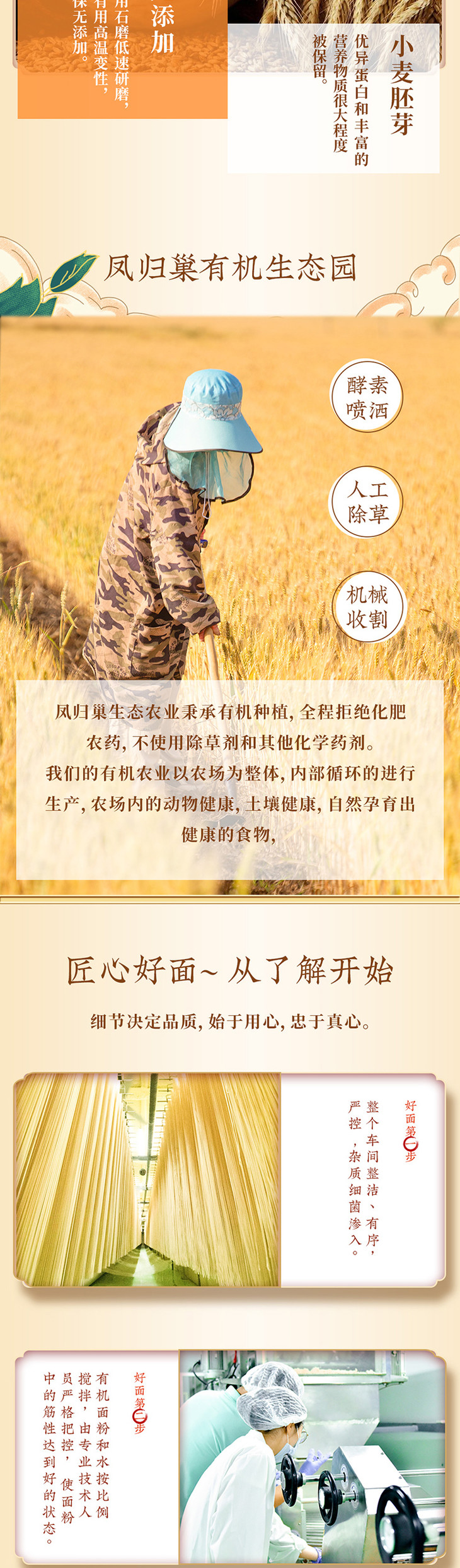 原材料选自凤归巢农场有机小麦,经低温低速研磨的有机石磨面粉制作而成,完整的保留了小麦胚芽,蛋白质含量高达14-20%。富含淀粉、蛋白质、脂肪、钙、铁、维生素A等多种营养成分。