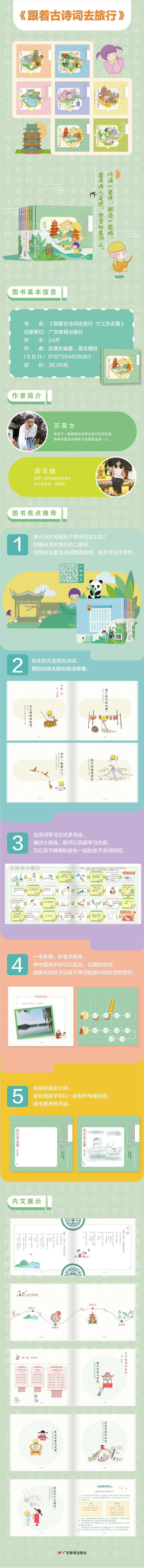 《跟着古诗词去旅行.大江东去篇》(主要包含湖南省和湖北省)以湖南省和湖北省的旅行路线为线索,各个旅行目的地的内容分为旅行和古诗词两部分,旅行部分的内容包含旅行地推荐等,古诗词部分内容包含诗人简介、词语解释、诗意解读、名人典故等。