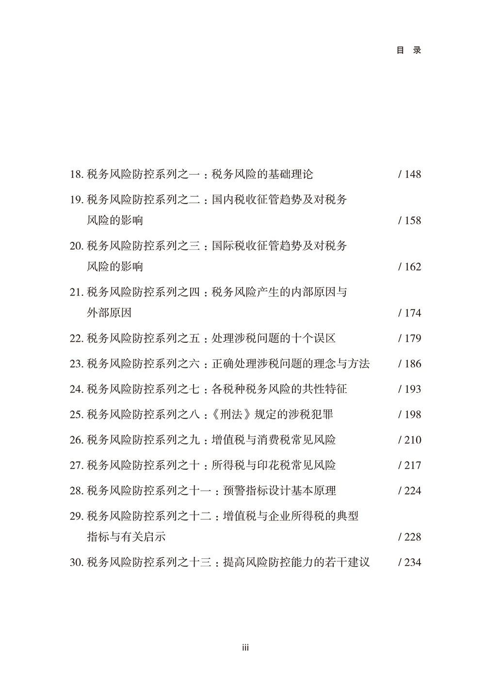 2023—2024年,延续、优化、完善并落实好减税降费政策,是党中央、国务院高瞻远瞩作出的重大决策部署。相关政策既有扶助中小微企业发展、支持先进制造业发展和企业创新研发的,也有减轻广大纳税人负担的。同时,税收征管大步走向智能化,从“以票控税”到“以数治税”,再到“智慧税务”,在极大便利税收征纳双方的同时,也潜存着税务风险爆发的隐患,如何认识和防控税务风险,已成为纳税人面临的紧迫问题。此外,国务院国资委发布指导意见指出,企业要“强化税务管理,实现规范高效”,对所有企业提高财务管理水平都有指导意义。