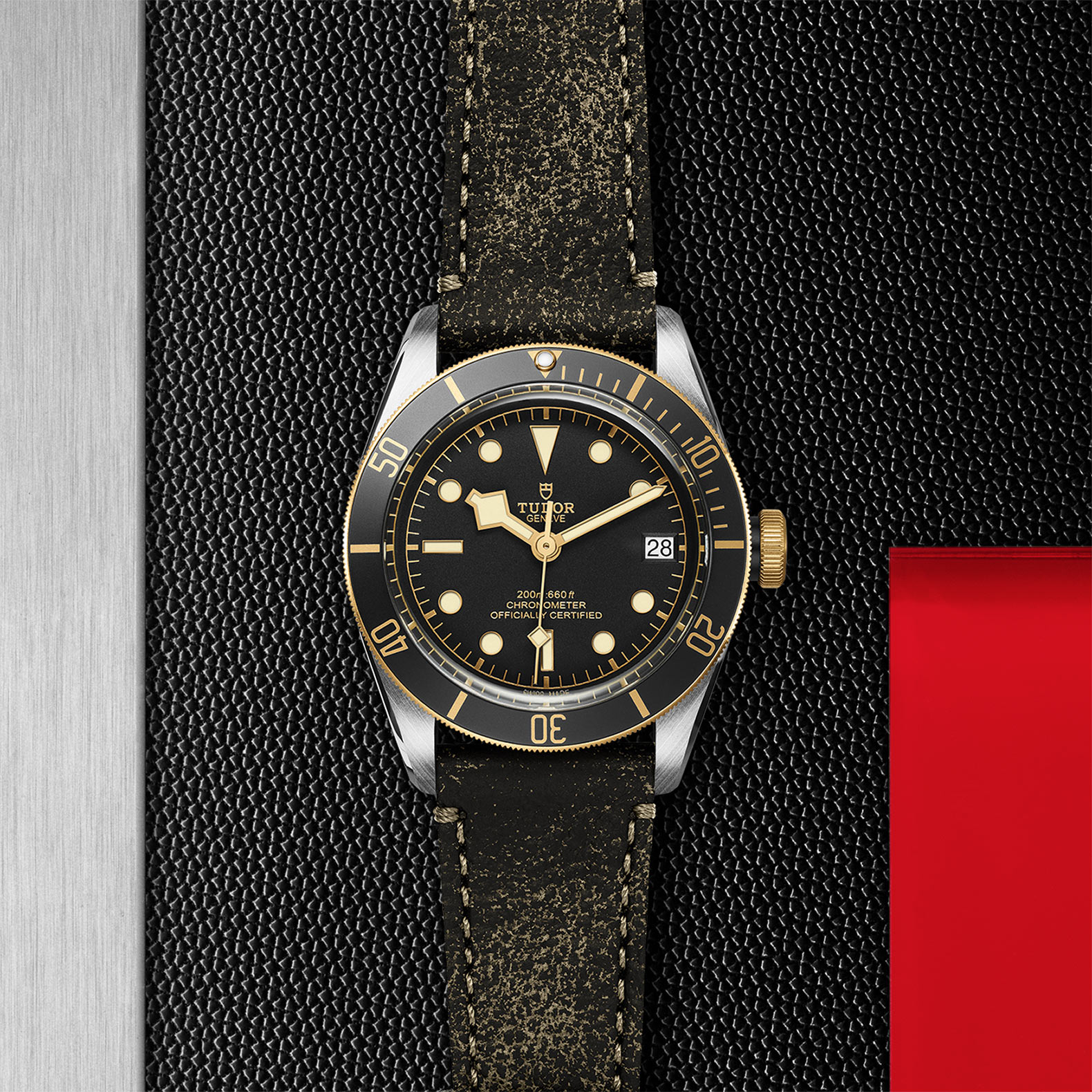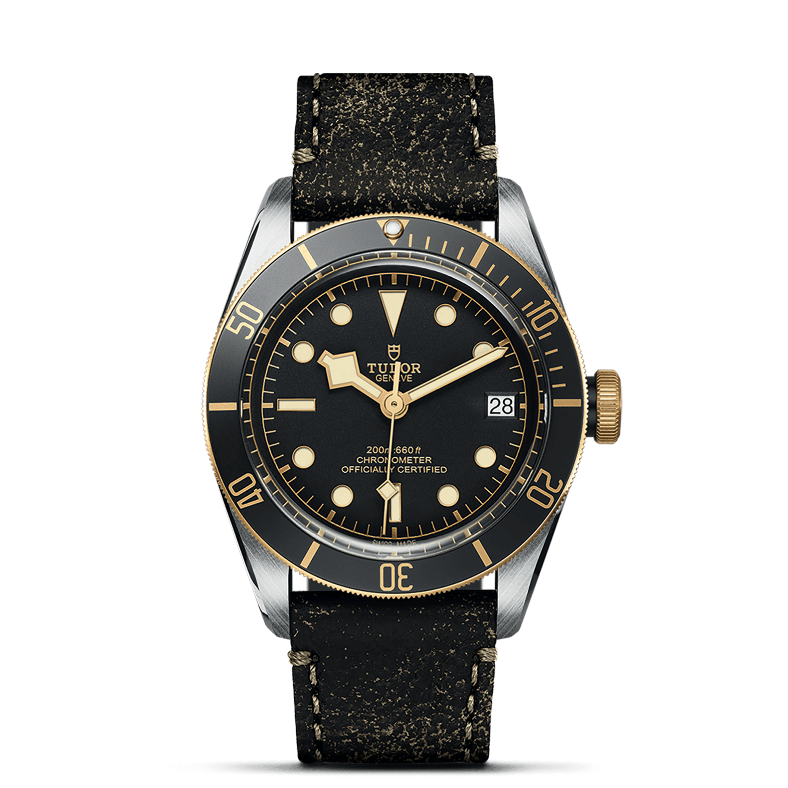 旋入式上链表冠,刻有帝舵表玫瑰标志,黑色漆面,配黑色阳极氧化铝上链表冠轴;精钢覆有0.3毫米18K黄金薄层