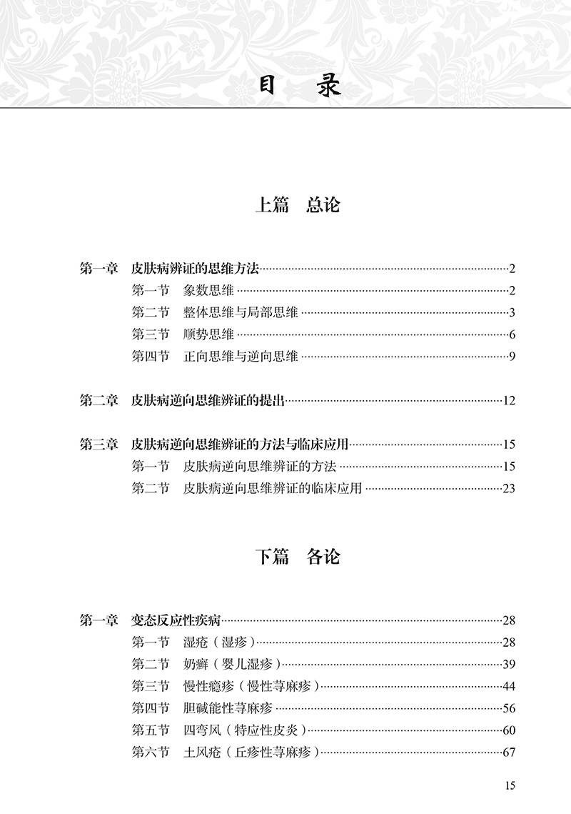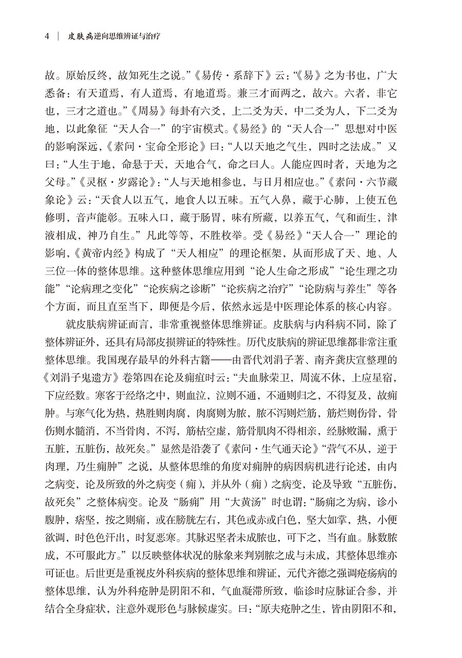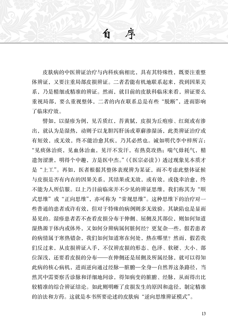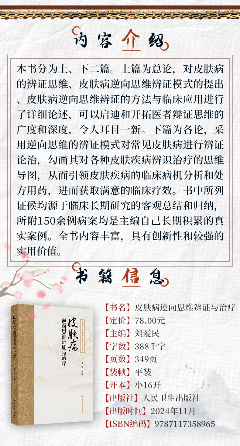本书分为上、下二篇。上篇为总论,对皮肤病的辨证思维、皮肤病逆向思维辨证模式的提出、皮肤病逆向思维辨证的方法与临床应用进行了详细论述,可以启迪和开拓医者辩证思维的广度和深度,令人耳目一新。下篇为各论,采用逆向思维的辨证模式对常见皮肤病进行辨证论治,勾画其对各种皮肤疾病辨识治疗的思维导图,从而引领皮肤疾病的临床病机分析和处方用药,进而获取满意的临床疗效。书中所列证候均源于临床长期研究的客观总结和归纳,所附150余例病案均是主编自己长期积累的真实案例。全书内容丰富,具有创新性和较强的实用价值。