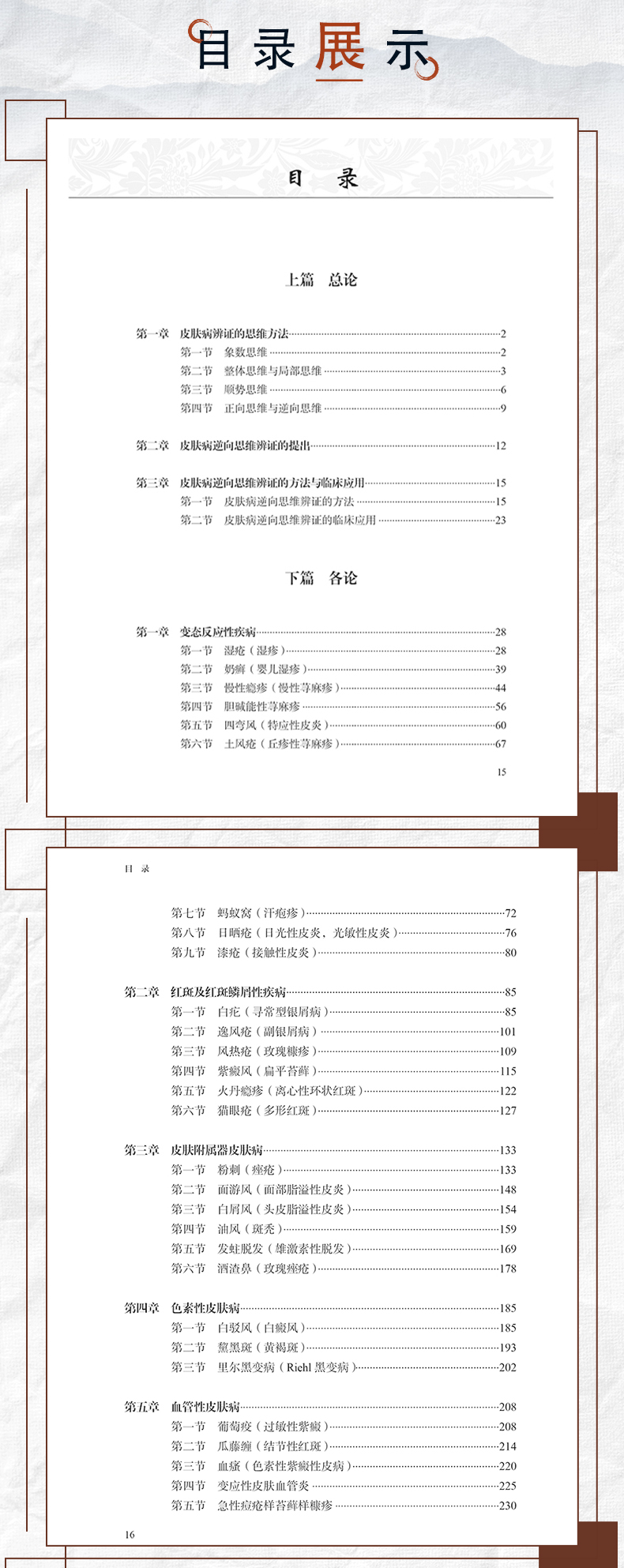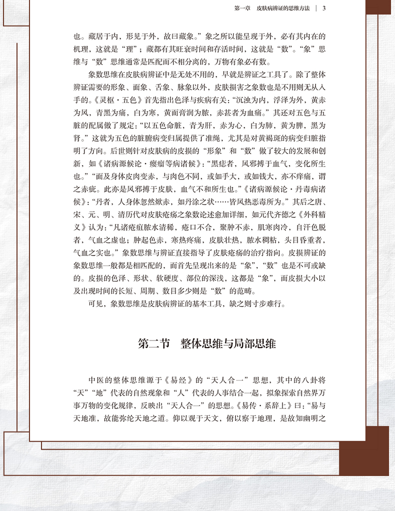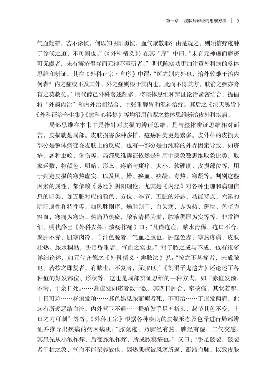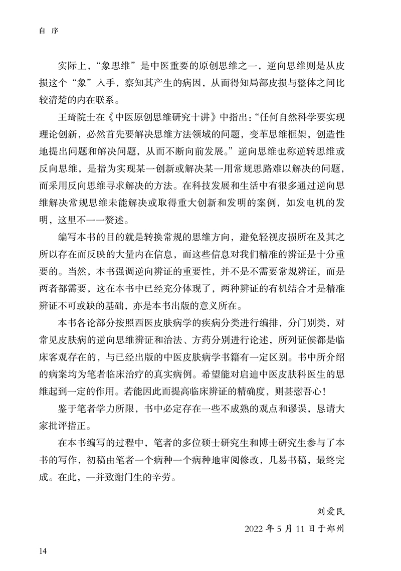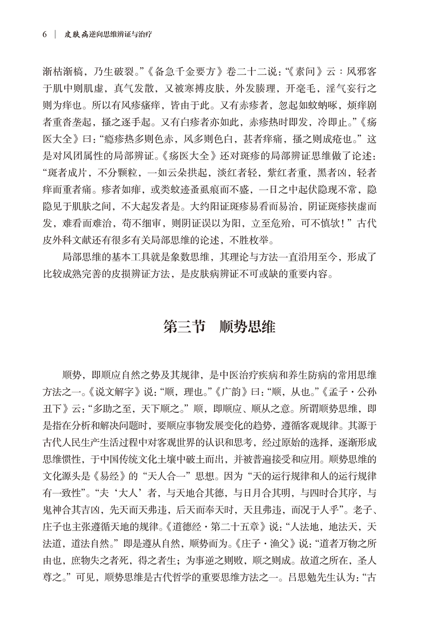 本书分为上、下二篇。上篇为总论,对皮肤病的辨证思维、皮肤病逆向思维辨证模式的提出、皮肤病逆向思维辨证的方法与临床应用进行了详细论述,可以启迪和开拓医者辩证思维的广度和深度,令人耳目一新。下篇为各论,采用逆向思维的辨证模式对常见皮肤病进行辨证论治,勾画其对各种皮肤疾病辨识治疗的思维导图,从而引领皮肤疾病的临床病机分析和处方用药,进而获取满意的临床疗效。书中所列证候均源于临床长期研究的客观总结和归纳,所附150余例病案均是主编自己长期积累的真实案例。全书内容丰富,具有创新性和较强的实用价值。