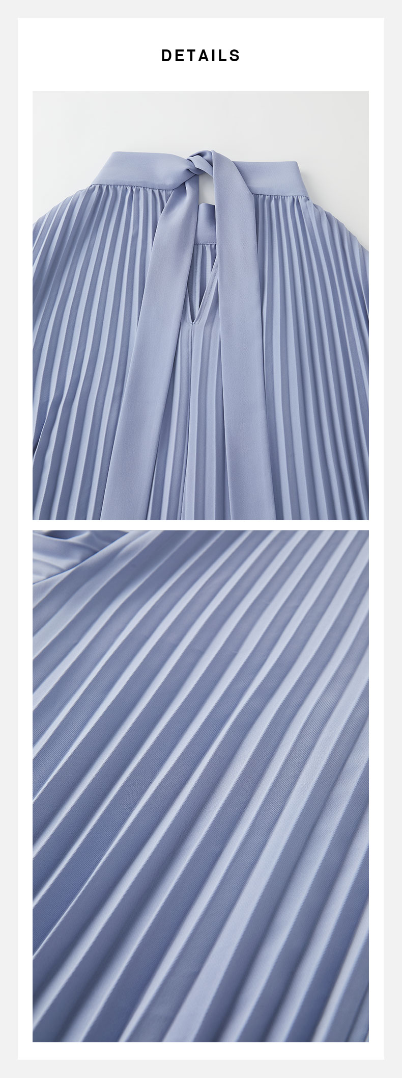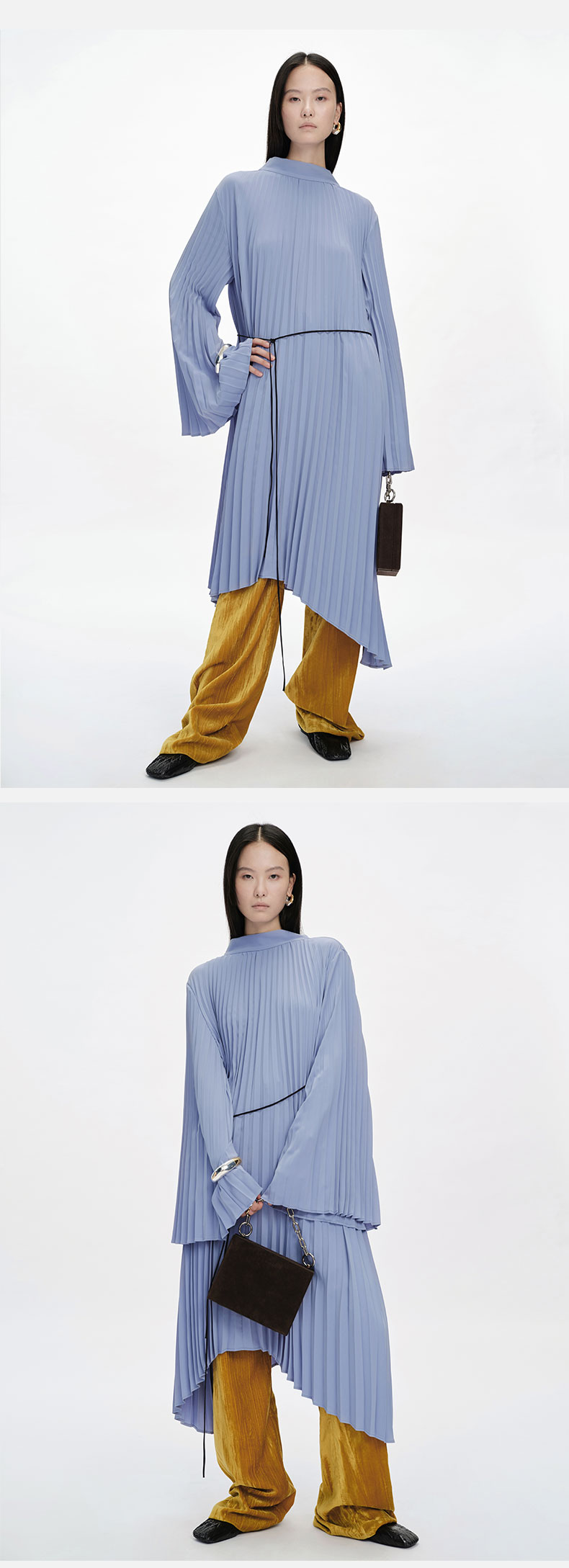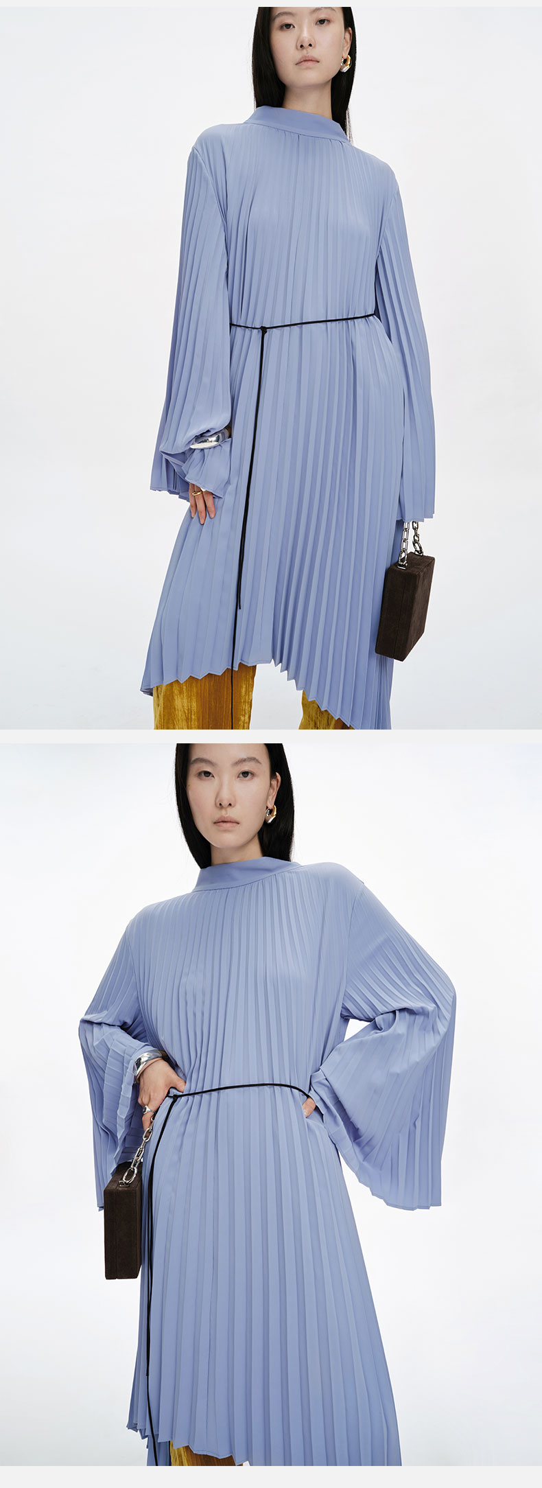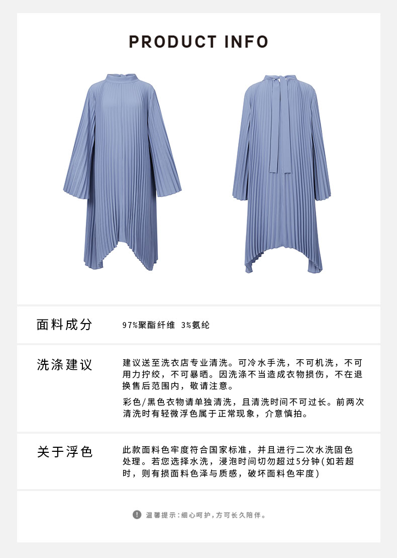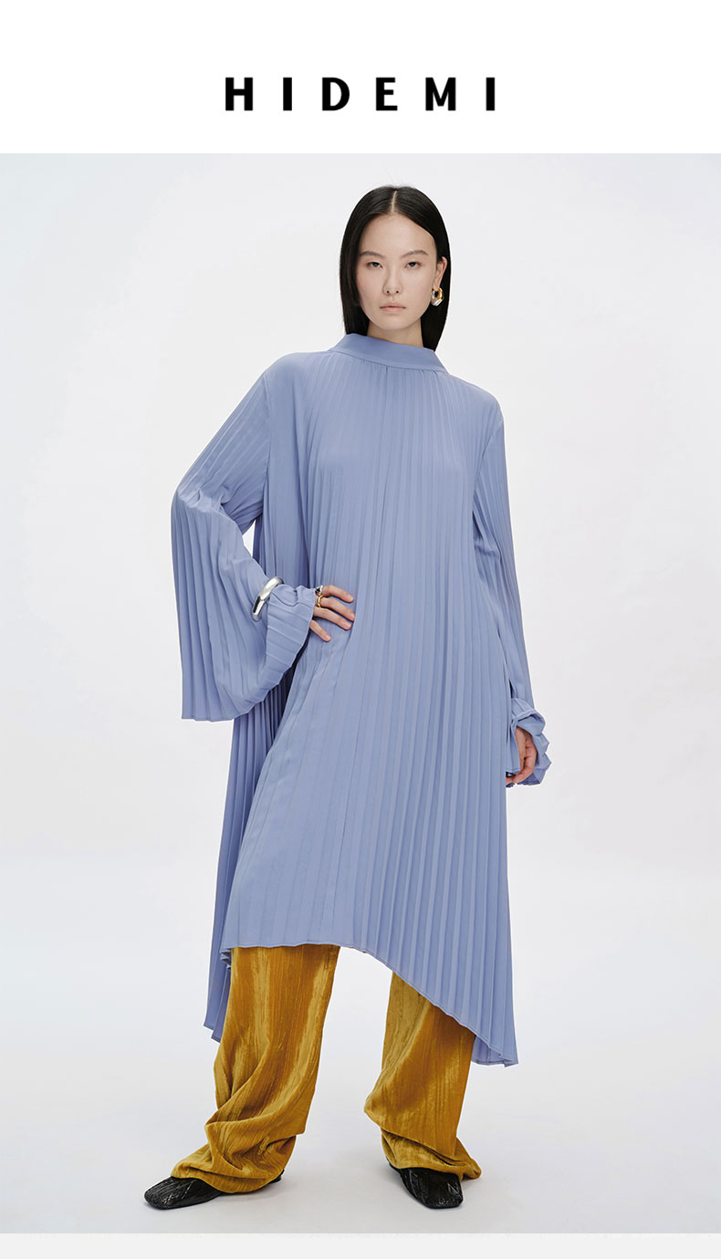 HIDEMI 风铃蓝立领设计感百褶风琴不规则下摆连衣裙