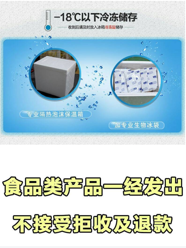 请您在下单前核对清楚收件地址!冷冻产品不支持7天无理由退换货。如因拒签造成的损失,由买家承担。
