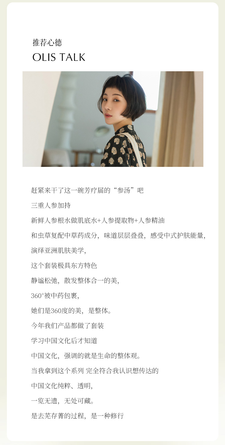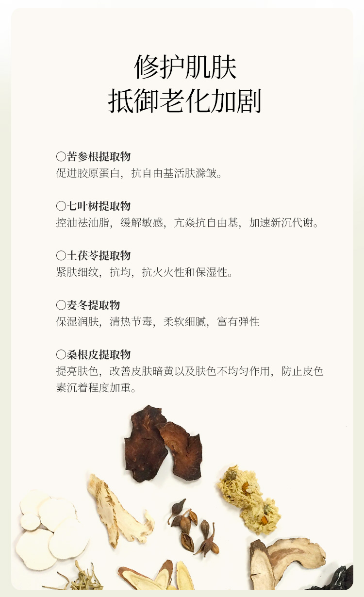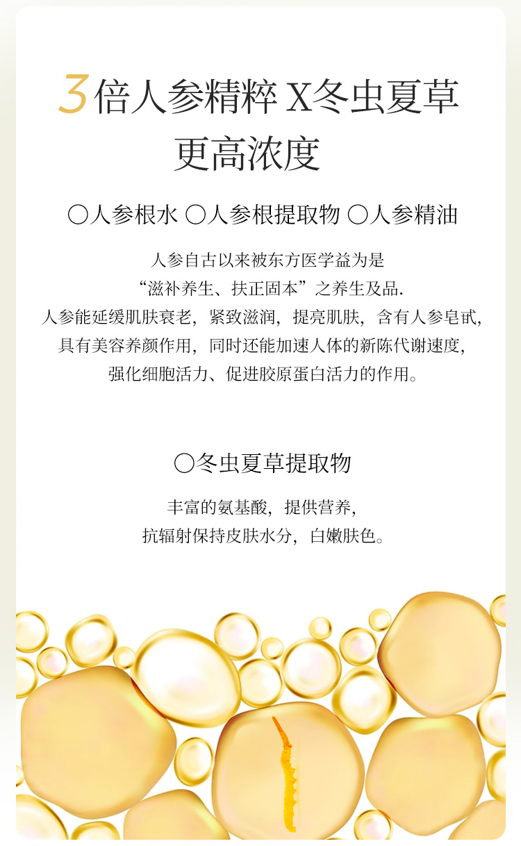 人参(PANAX GINSENG)根水、人参(PANAX GINSENG)根提取物、丁二醇、甘油、海藻糖、烟酰胺、3-o-乙基抗坏血酸、甘油葡糖苷、冬虫夏草(CORDYCEPS SINENSIS)提取物、苦参(SOPHORA ANGUSTIFOLIA)根提取物、七叶树(AESCULUS CHINENSIS)提取物、土茯苓(SMILAX GLABRA)提取物、麦冬(OPHIOPOGON JAPONICA)提取物、桑(MORUS ALBA)根皮提取物、甘草酸二钾、对羟基苯乙酮、1,2 戊二醇、透明质酸钠交联聚合物、透明质酸钠、乙酰化透明质酸、水解透明质酸、人参精油。
