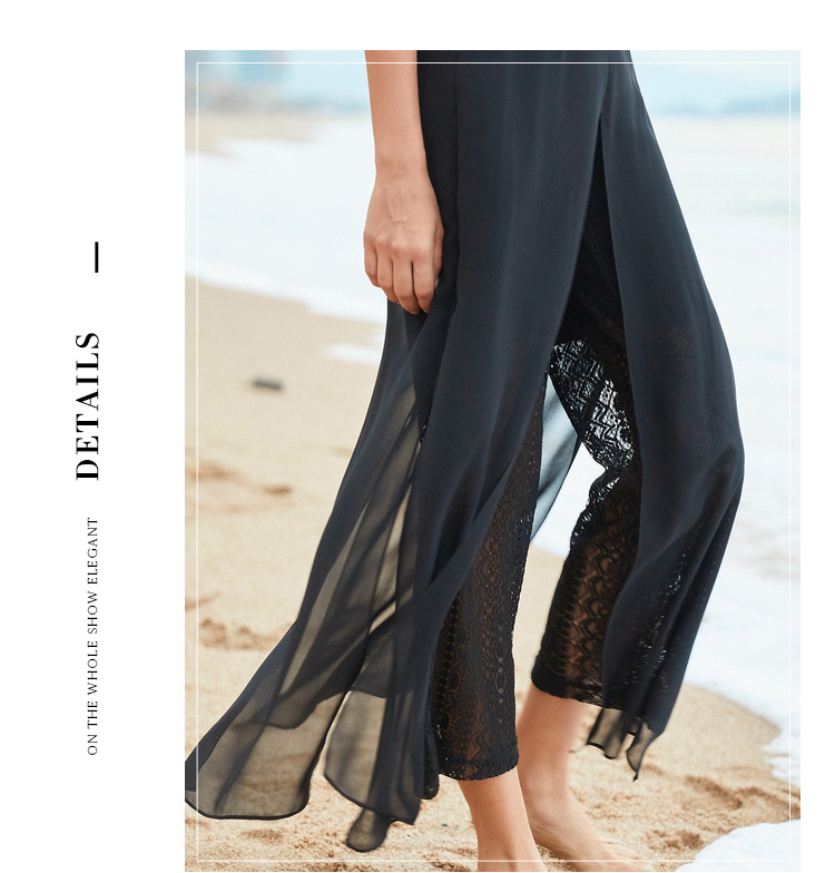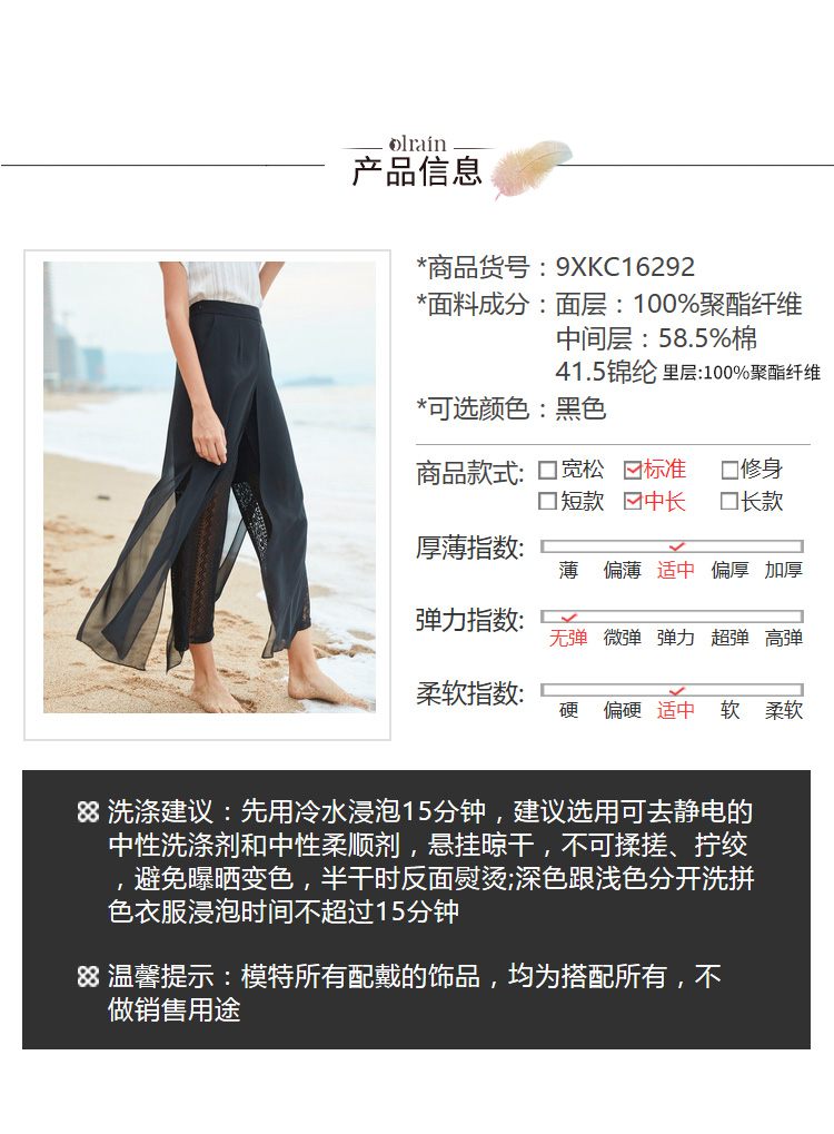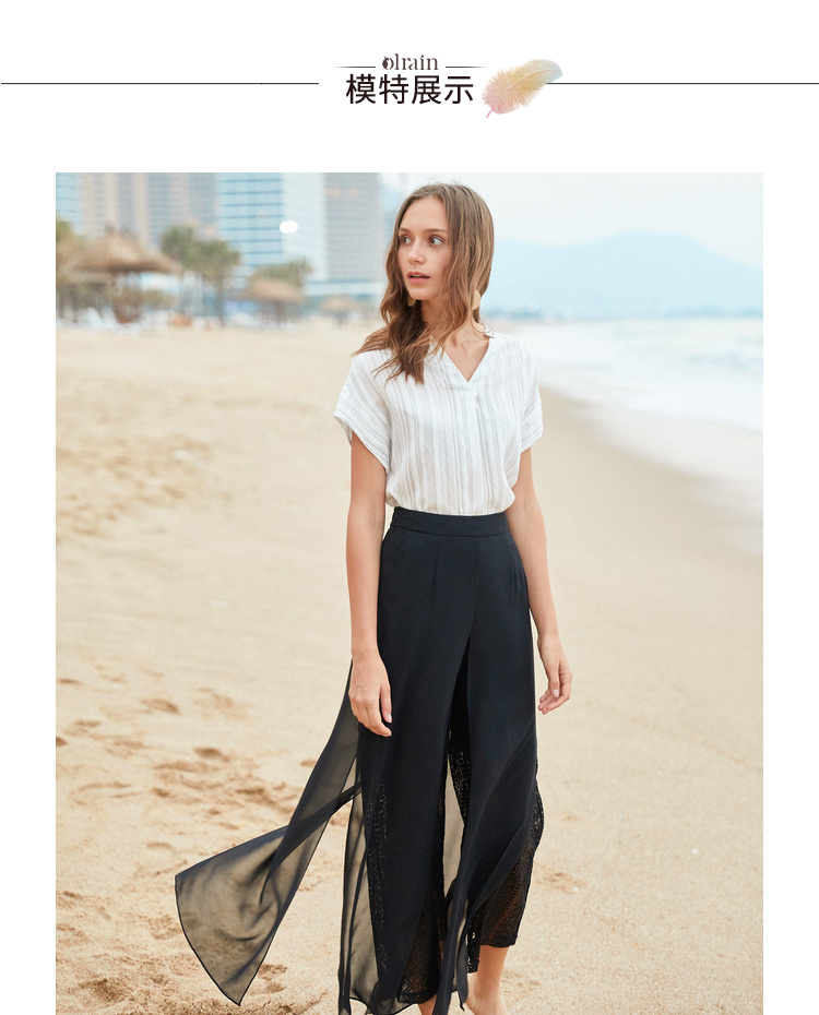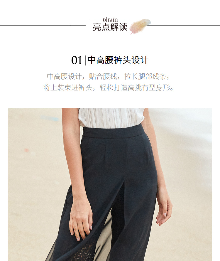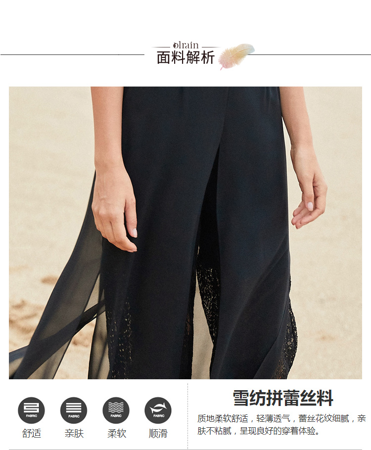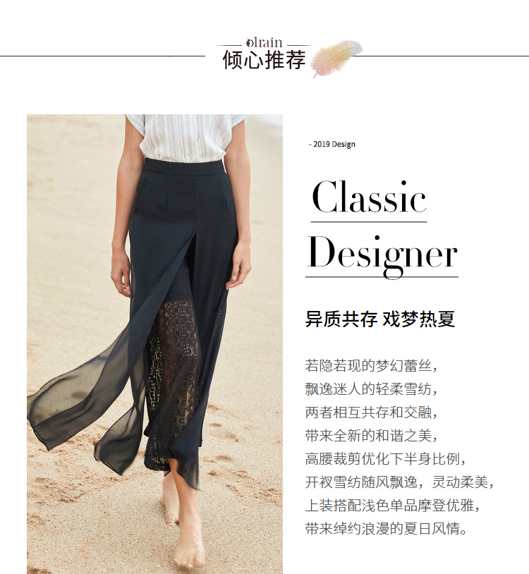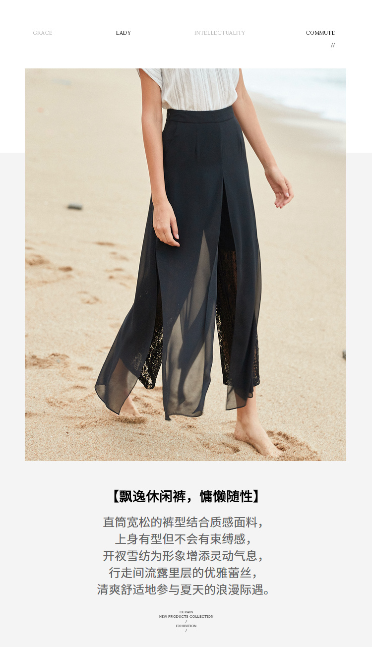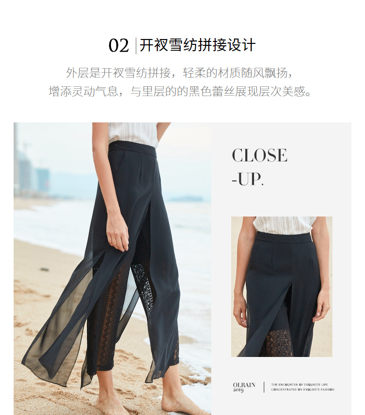 欧芮儿2019夏装新款高腰显瘦黑色休闲裤女不规则蕾丝女裤子网纱裤