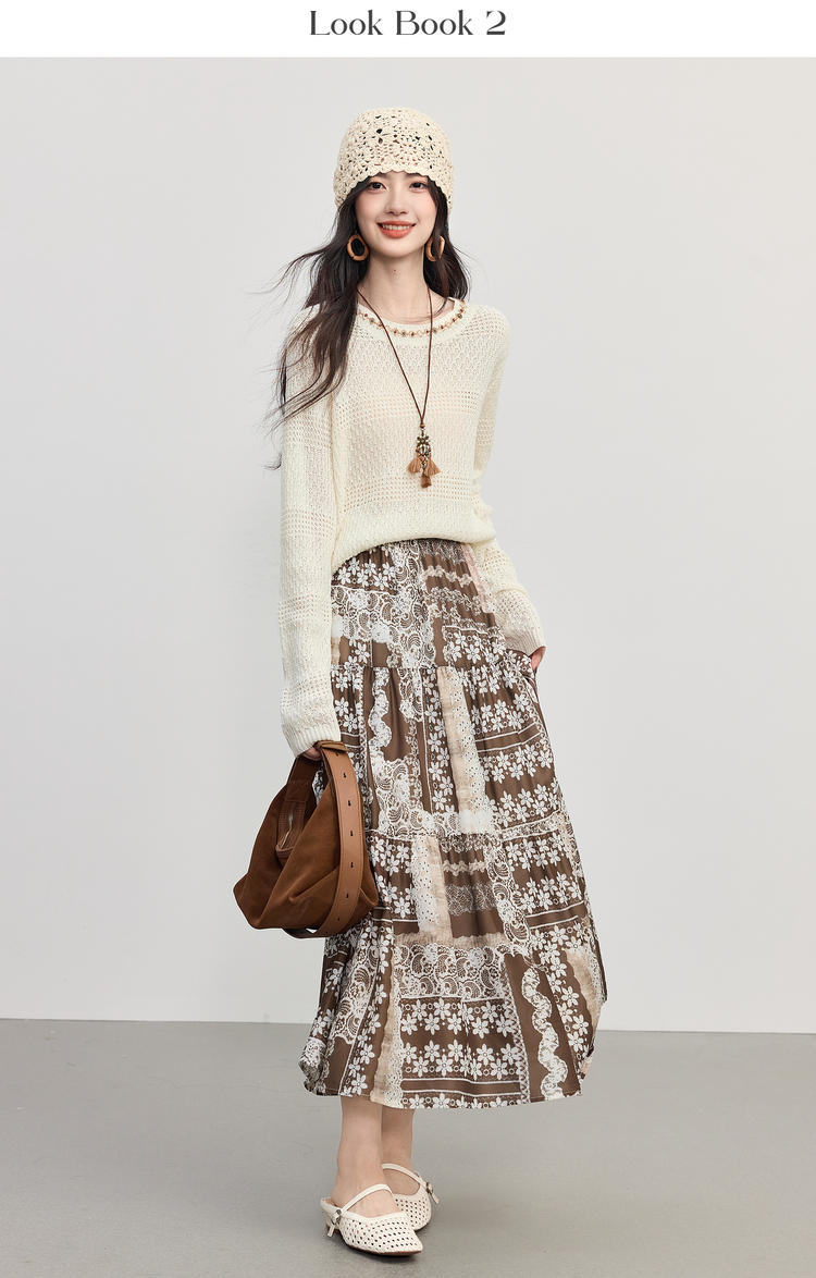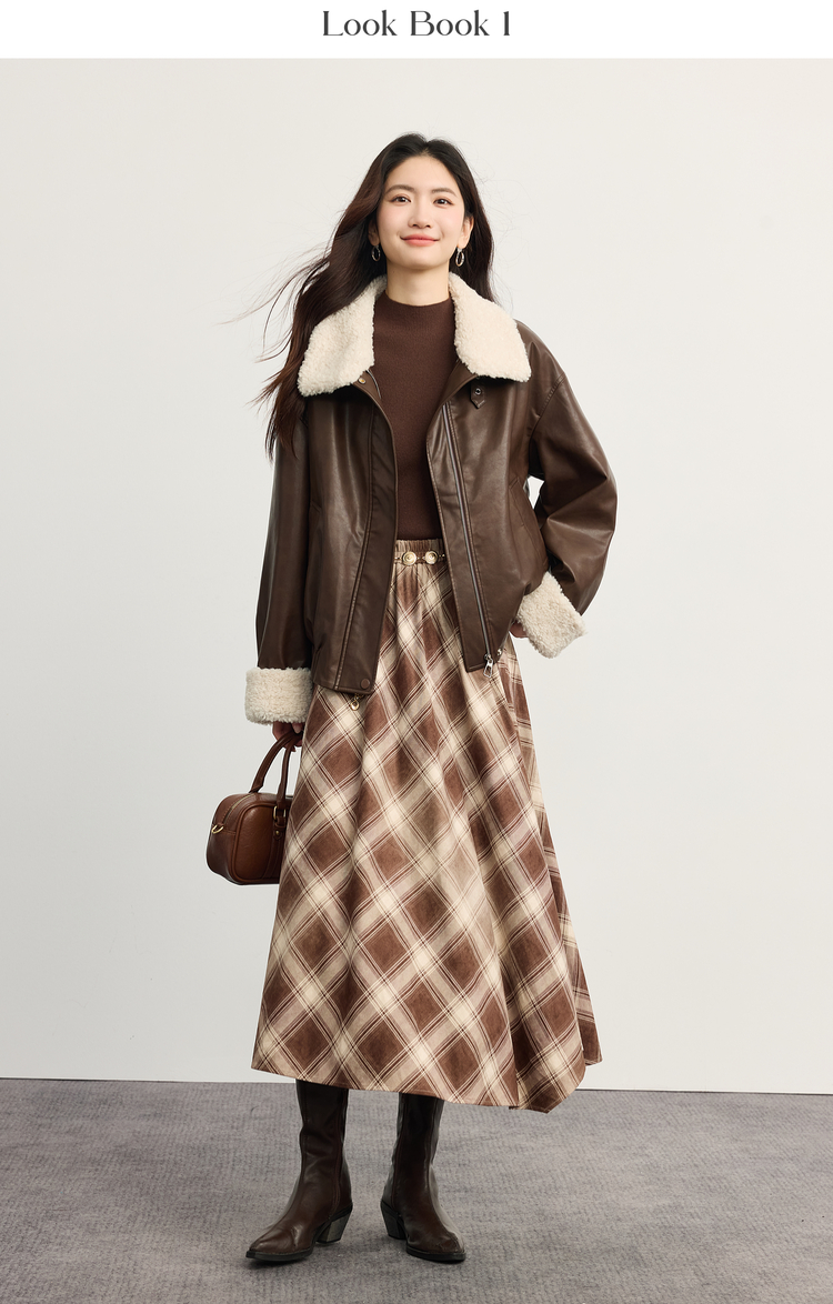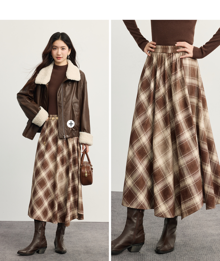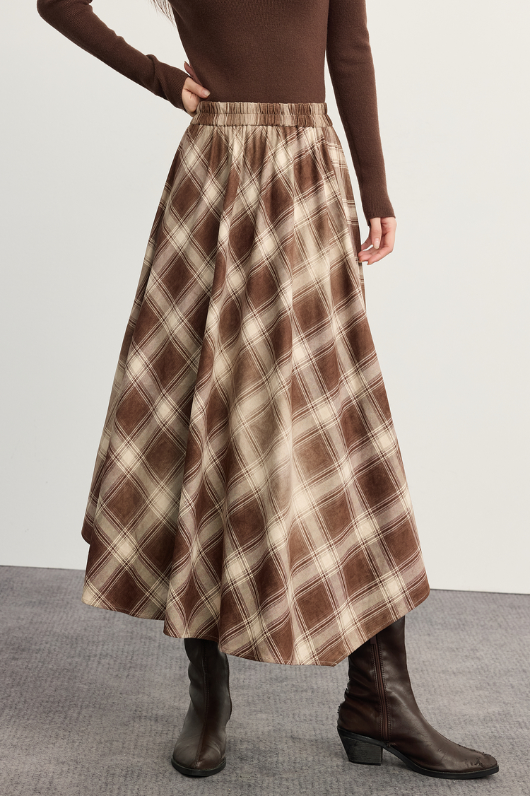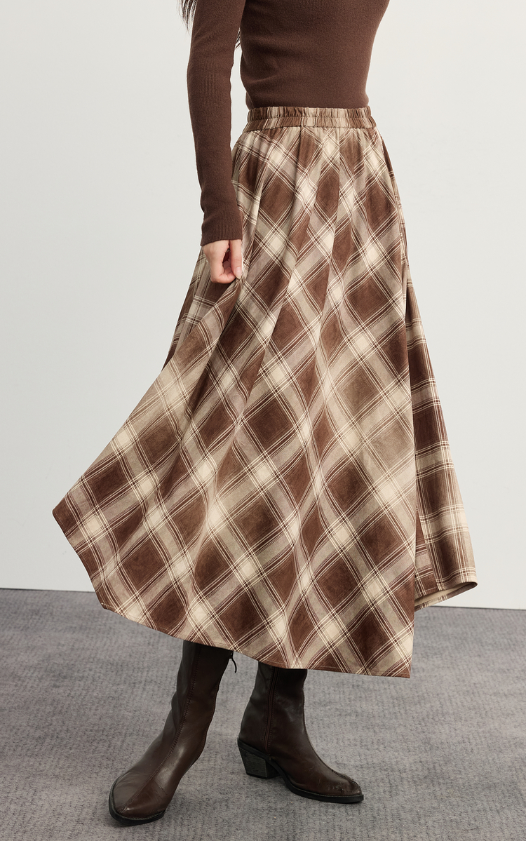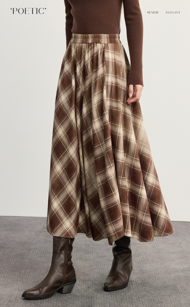 【09/17新品】熙世界复古咖色格子半身裙女2025秋装新款垂坠飘逸不规则高腰伞裙