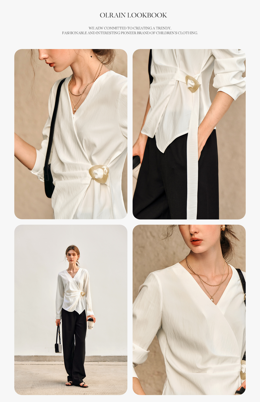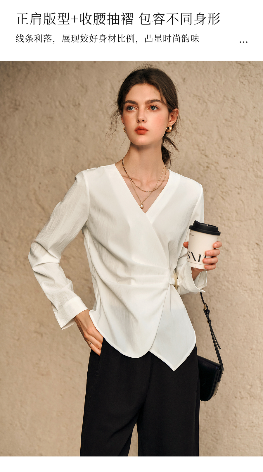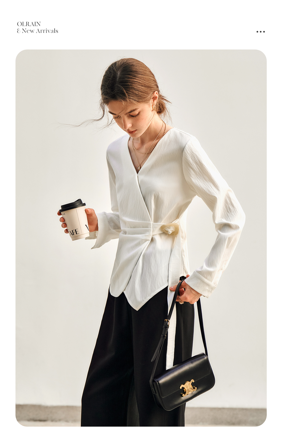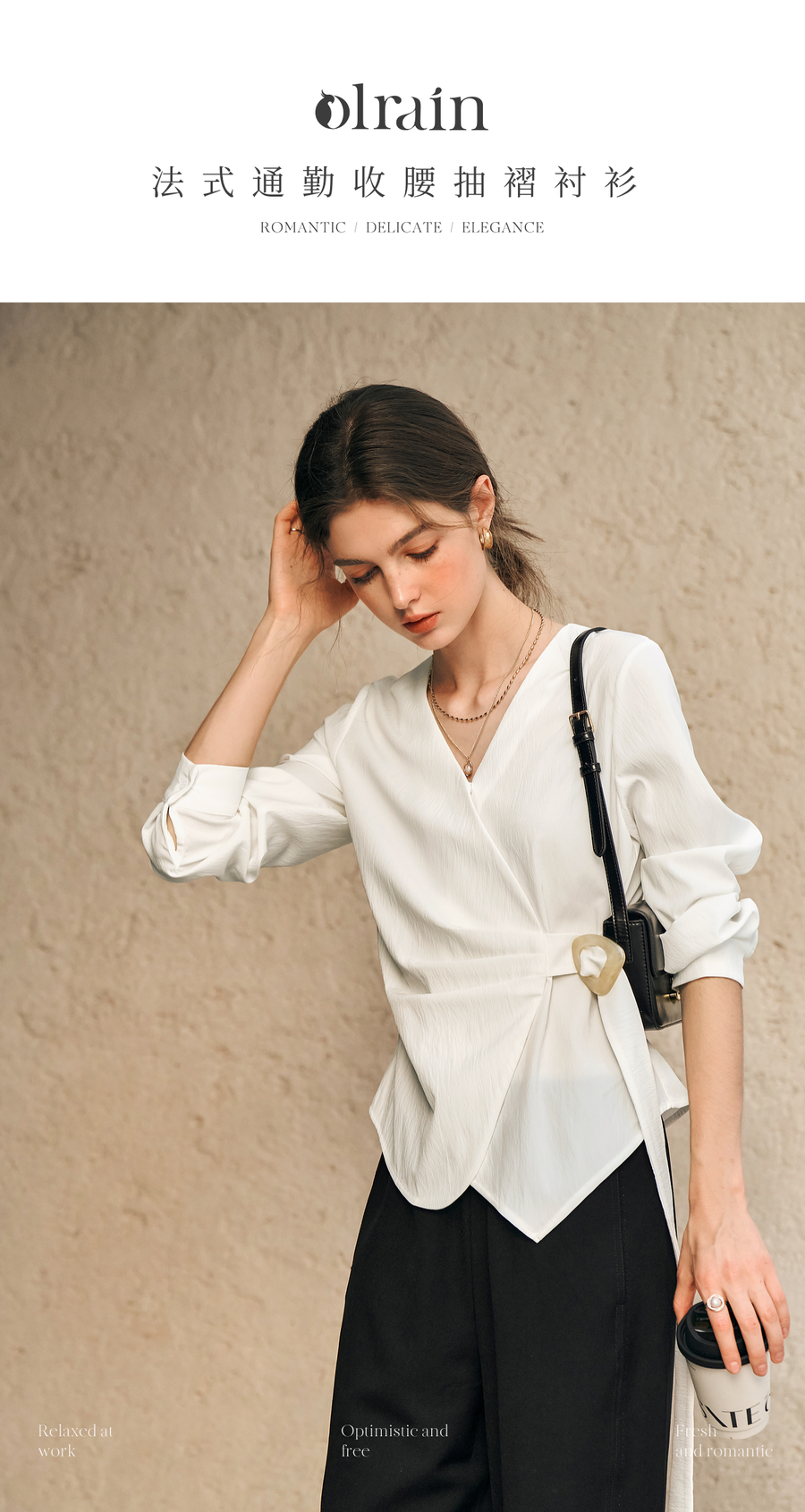 OLrain欧芮儿法式白色雪纺衫女冬季2024年新款通勤收腰抽褶衬衣