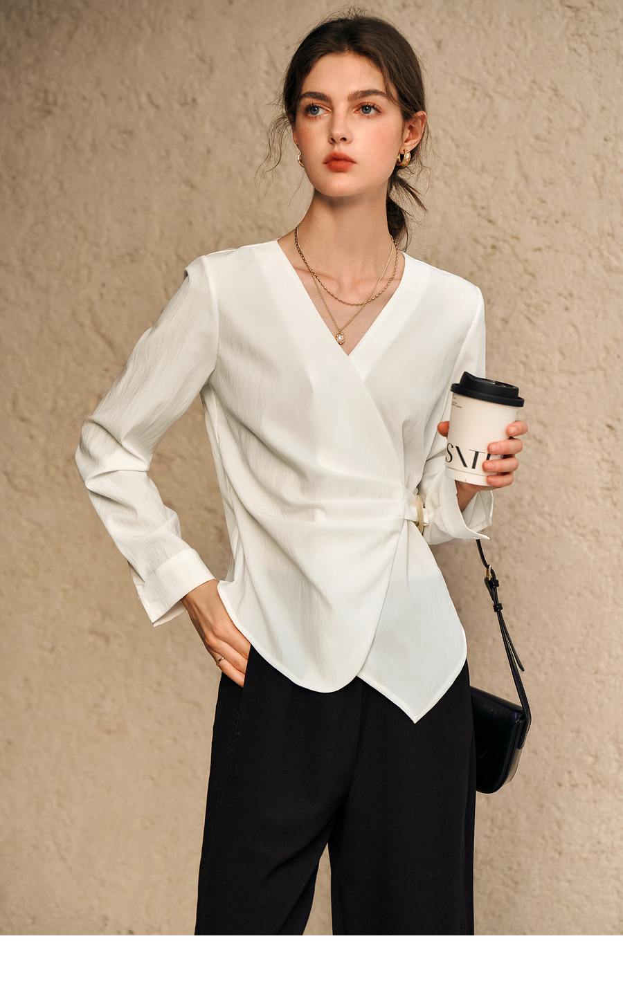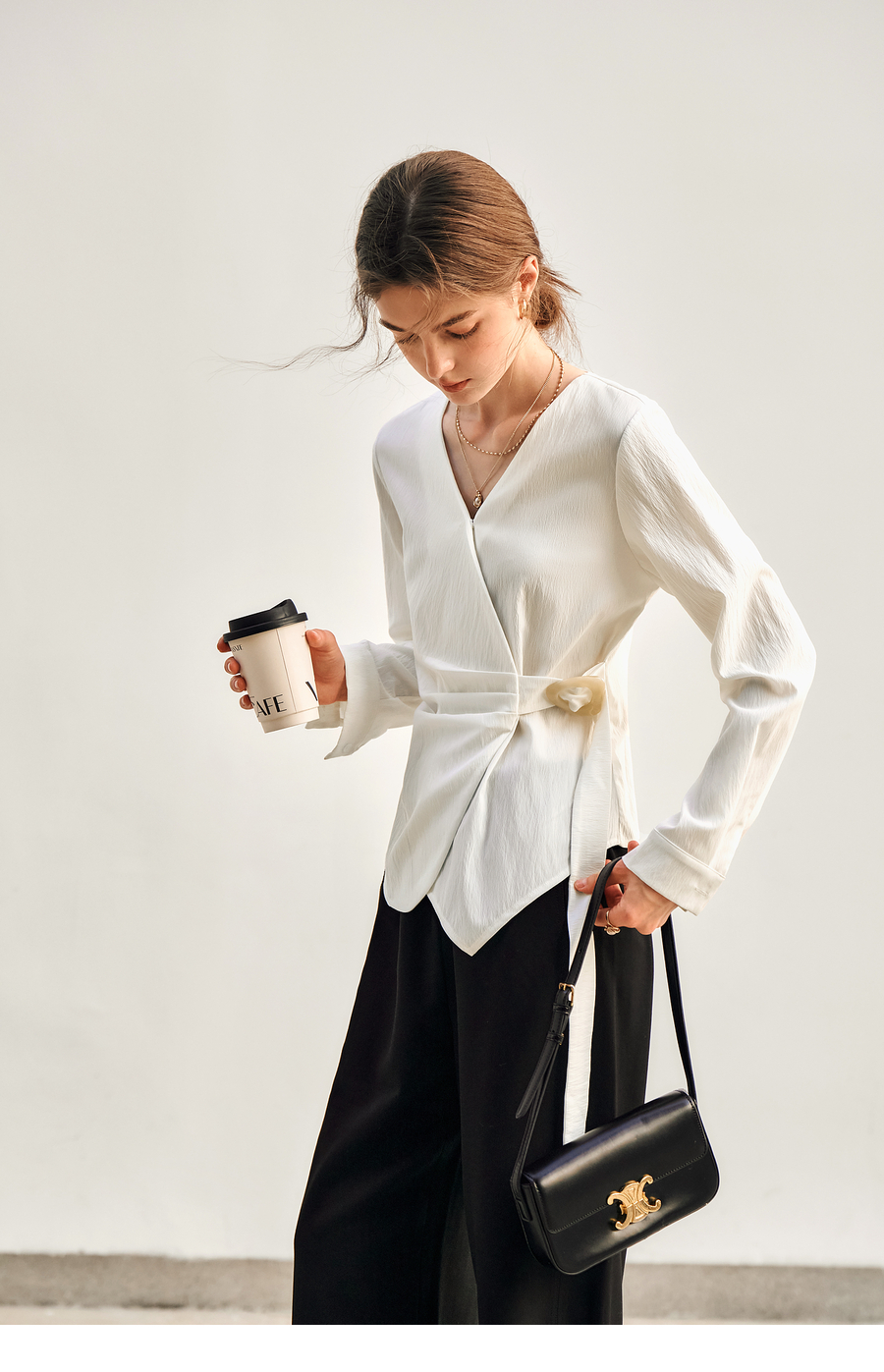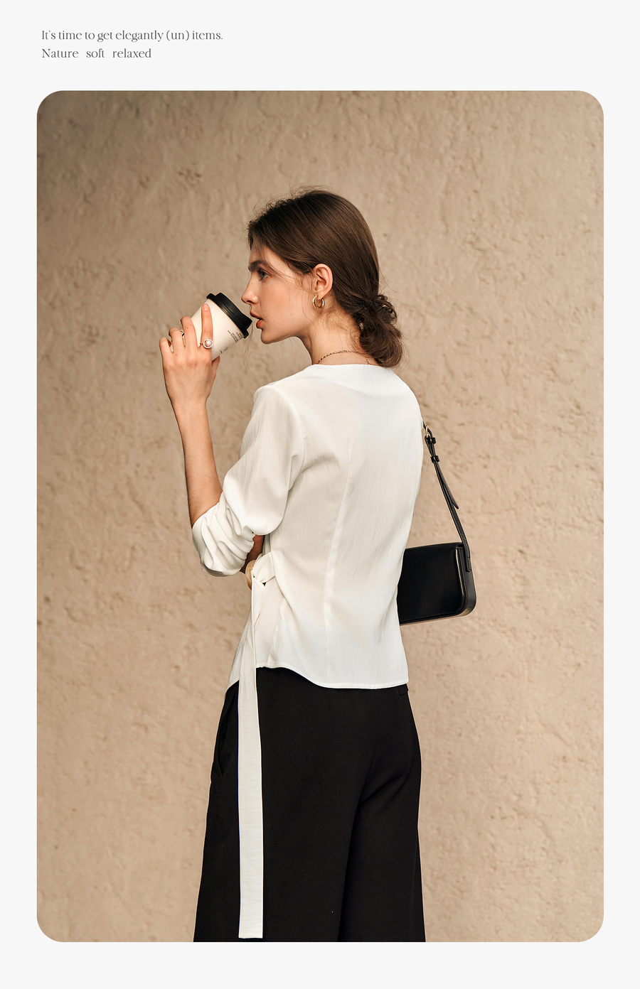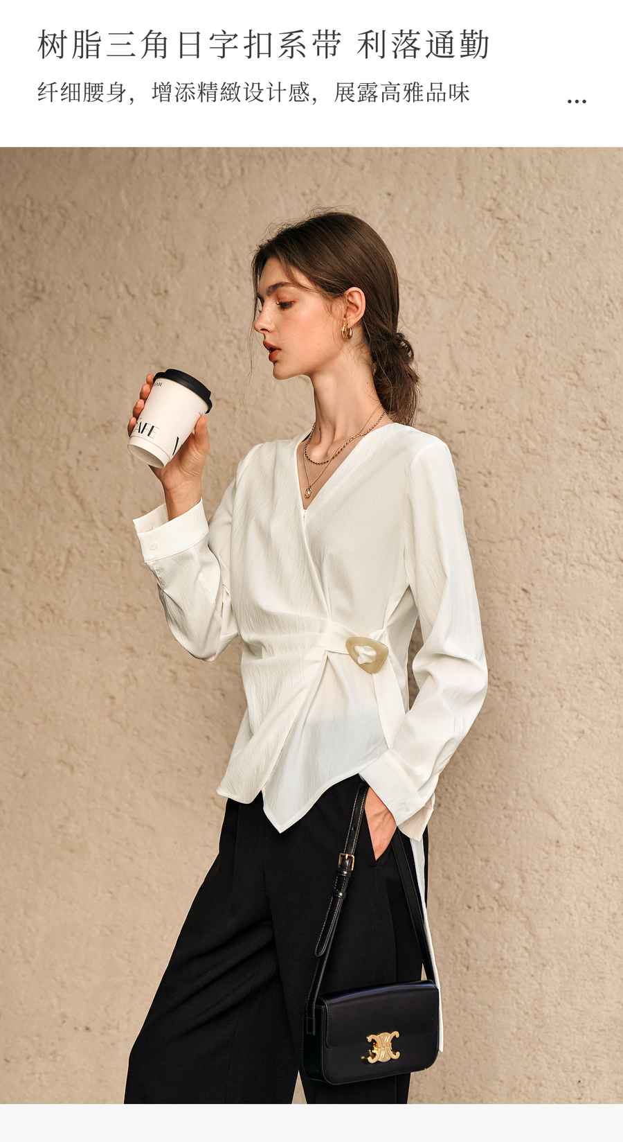 OLrain欧芮儿法式白色雪纺衫女冬季2024年新款通勤收腰抽褶衬衣