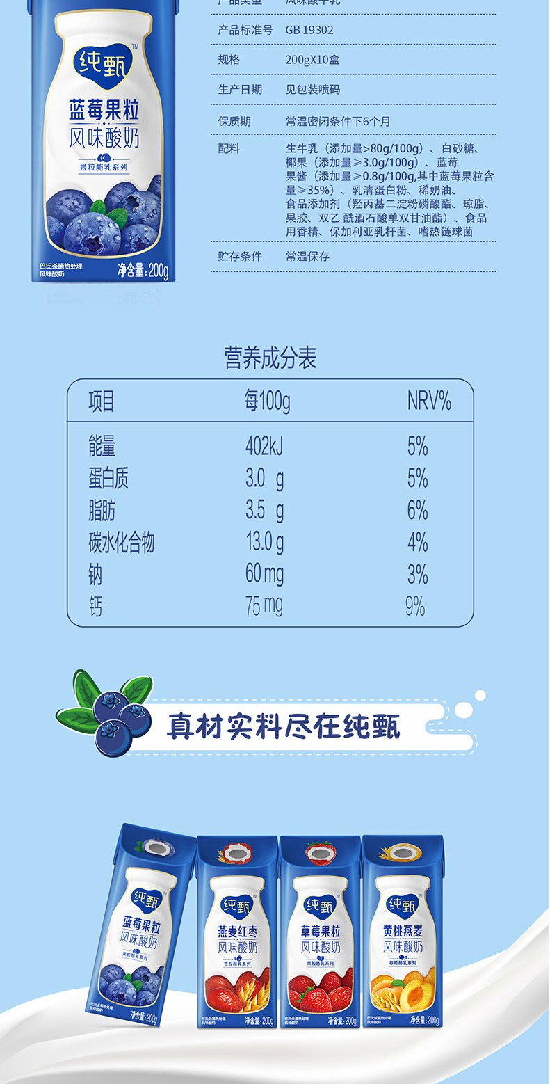 【大日期】纯甄0添加巴氏杀菌热处理原味风味酸奶利乐钻200g×10包