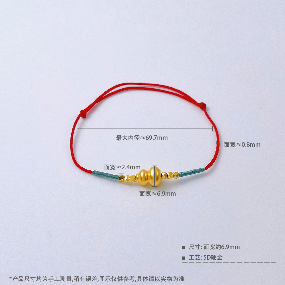 【限时7.5折】【定价黄金】足金 #微硬金 #葫芦 无氰5D硬金古风福禄双至招财葫芦间蹦迪珠编织绳双向调节手链转运红绳成品手串(成人佩戴)(AA5DSC00068)