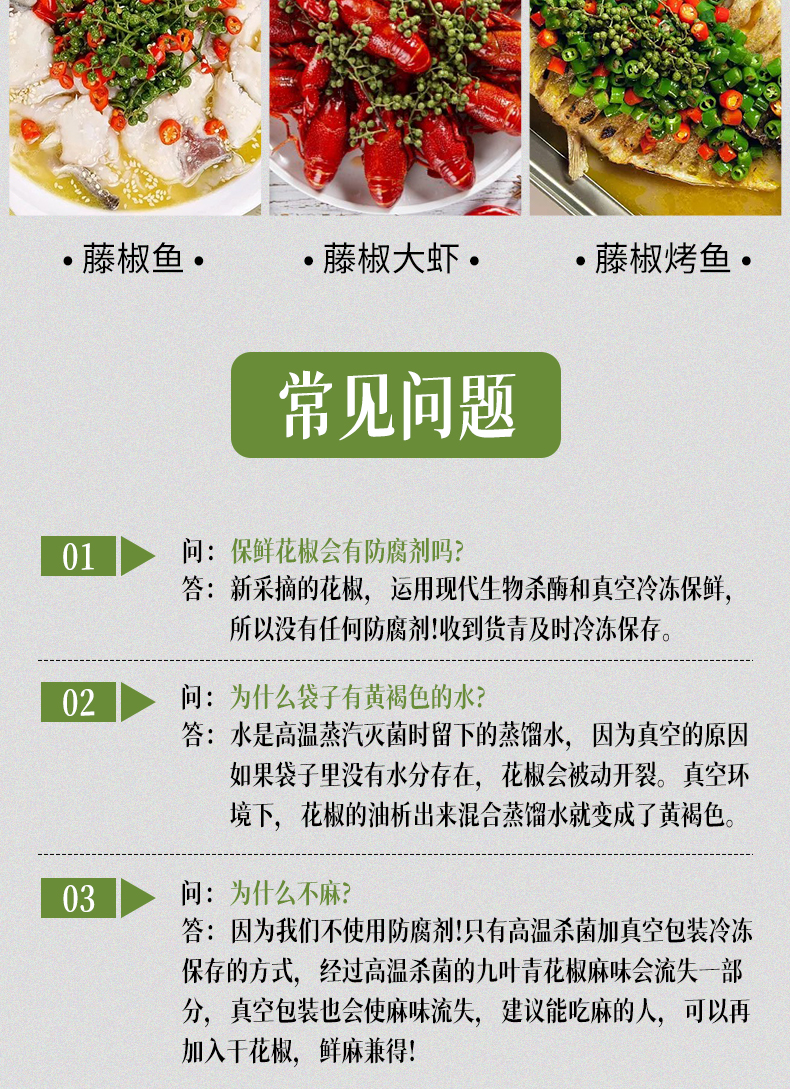 【生产日期/保质期】现摘现发;正常保质期18个月(-10℃到-18℃冷冻保存),开封后密封,冷冻3-6个月。收到货立刻放冰箱冷冻保存即可(切记不要放冷藏),保鲜花椒需解冻清洗去除杂质后使用。