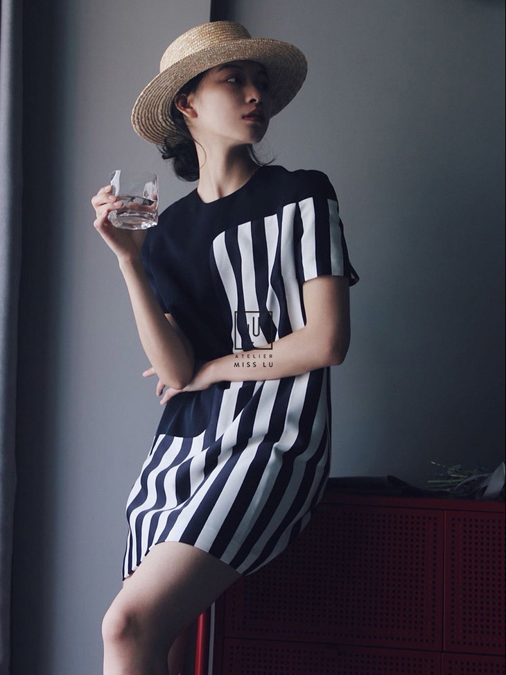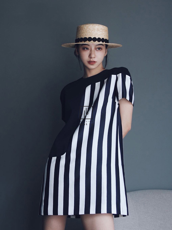 AtelierMissLu-「复古大气场」 藏青条纹复古宽身裙-0000619