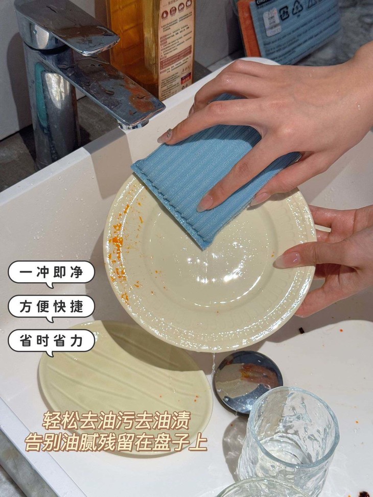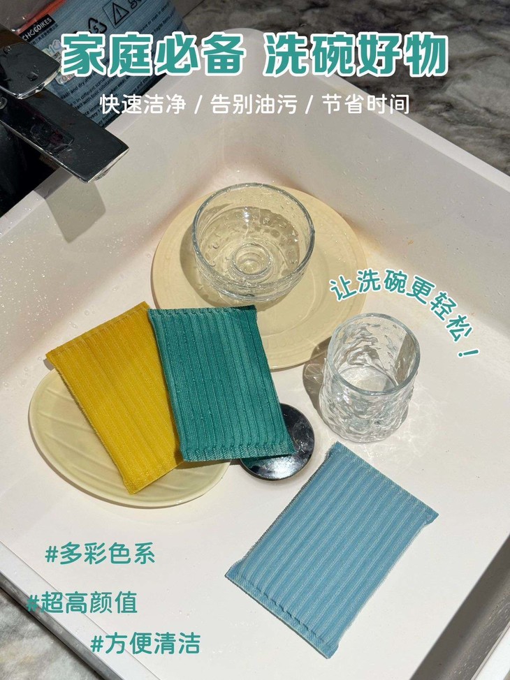 多种颜色可以选,拿在手上挺厚实一块 一点点洗洁精就能打出丰富的泡沫 轻轻松松擦几下立竿见影 非常好过水 洗后的碗碟🍽 是光亮光亮的 一晾就干!不容易藏细🦠jun 不留味