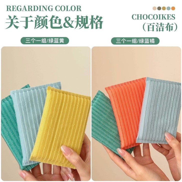下单备注:CHOCOIKES百洁布 CHOCOIKES百洁布 宜家同款 清洁力一级棒 亲水去油还护具,分类使用超安心! ✅材料扎实耐用 外层100%聚酯纤维 +内层聚氨酯海绵,手感好还结实 ✅3只装超实用,尺寸 大小刚好 握在手里舒服不硌手 符合人体工学! ✅绿蓝橘/绿蓝黄双色组合 按颜色分类用 擦碗擦灶不串味,减少交叉污染!