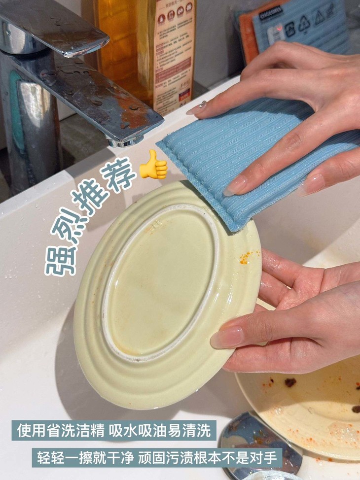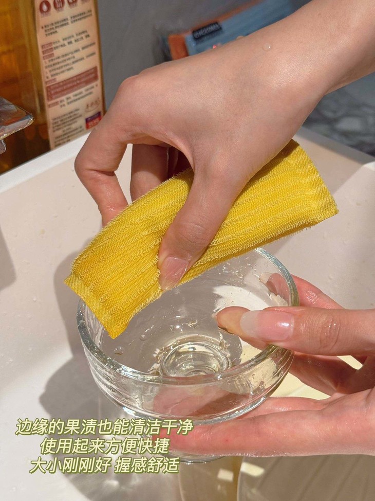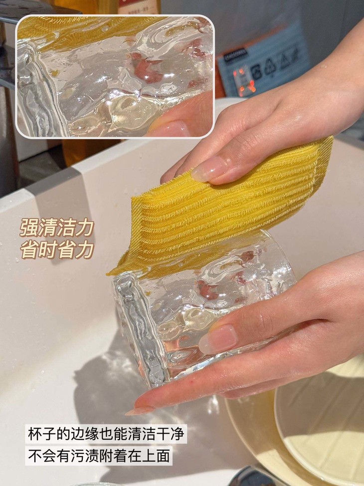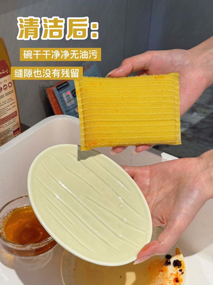 外面是100%聚酯纤维的摩擦面 对付锅边的焦渍、碗底的油污 轻轻一蹭就下来 顽固污渍根本不是对手~ 擦不粘锅、陶瓷碗啥的完全不担心刮花 用完餐具还是亮亮的 跟新的一样!