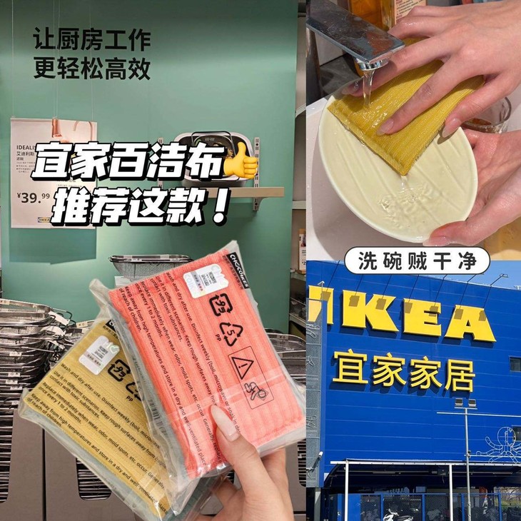 可是妥妥的宜家同款品质! 外层聚酯纤维摩擦面超给力 对付油污不费力 内层聚氨酯海绵柔软亲肤 擦不粘锅、陶瓷碗也不怕刮花 3只装配色清新,按颜色分着用特方便 擦碗擦灶不串味儿 吸水吸油还省洗洁精! 清洁厨房有它真省心!
