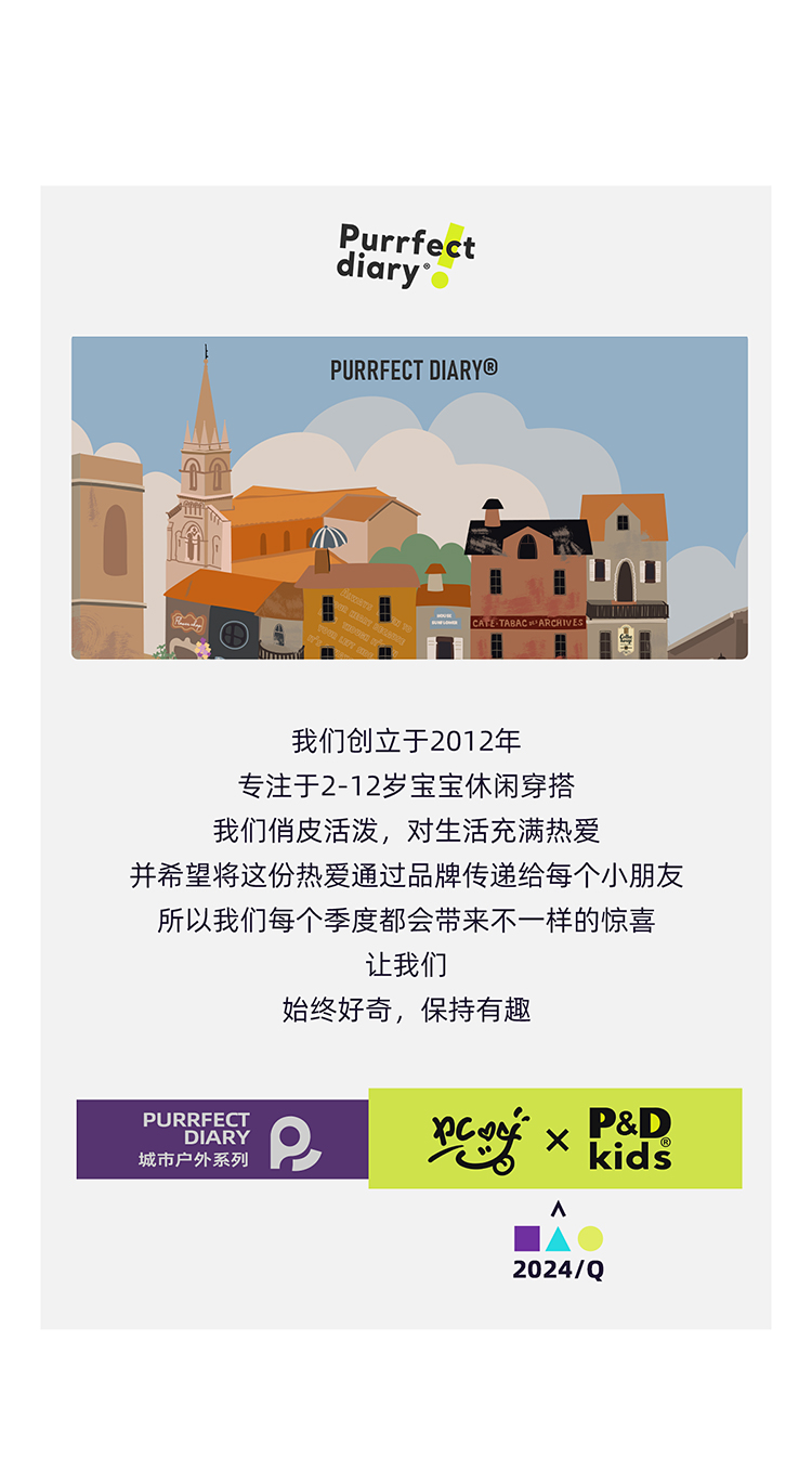- Purrfect-Diary专注于贴近自然随性的穿着概念,轻奢平价的童装文化传播,在产品设计上更加注重婴童穿着的舒适性、安全性、更出众的国际化品牌,将欧美的育婴文化在中国进行深入的传播与推广。