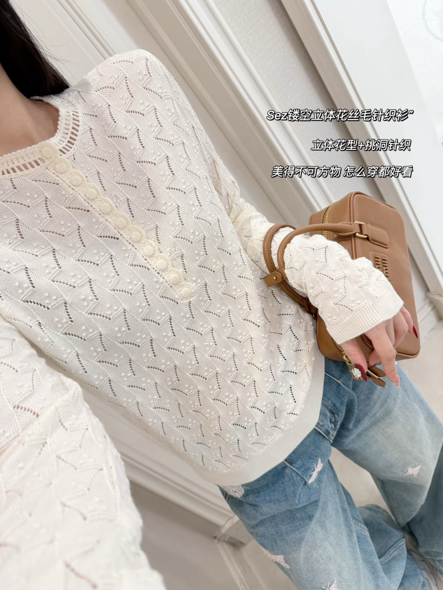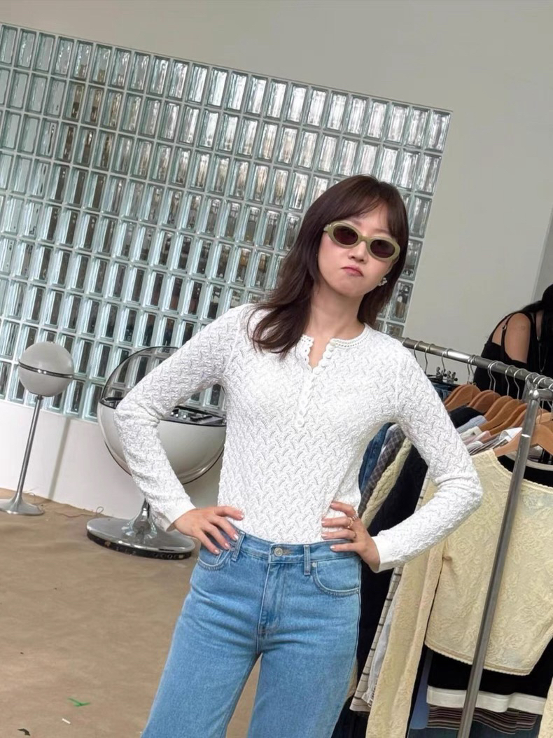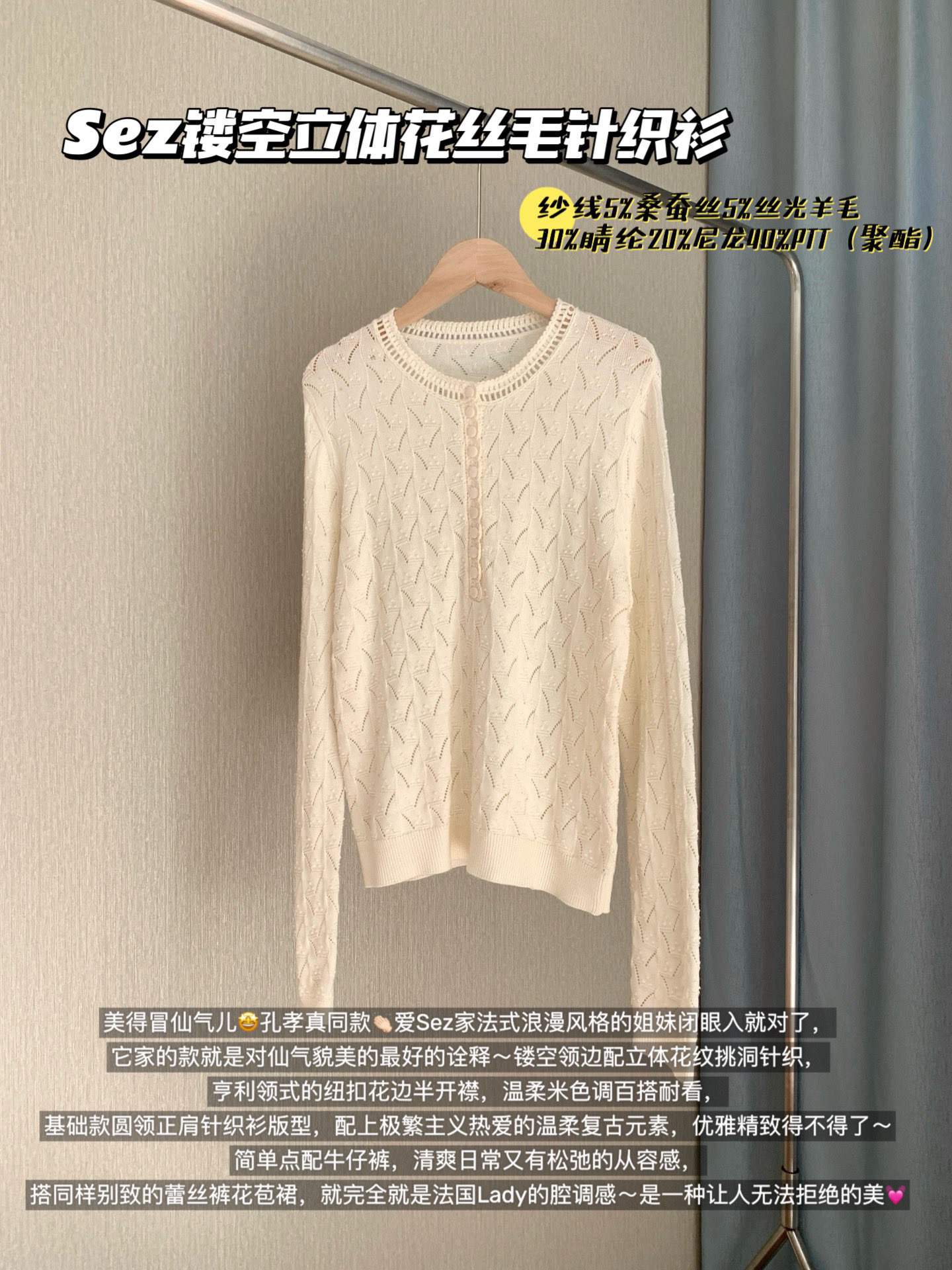 美得冒仙气儿🤩孔孝真同款👏🏻爱Sez家法式浪漫风格的姐妹闭眼入就对了,它家的款就是对仙气貌美的最好的诠释~镂空领边配立体花纹挑洞针织,亨利领式的纽扣花边半开襟,温柔米色调百搭耐看,基础款圆领正肩针织衫版型,配上极繁主义热爱的温柔复古元素,优雅精致得不得了~简单点配牛仔裤,清爽日常又有松弛的从容感,搭同样别致的蕾丝裤花苞裙,就完全就是法国Lady的腔调感~是一种让人无法拒绝的美💓