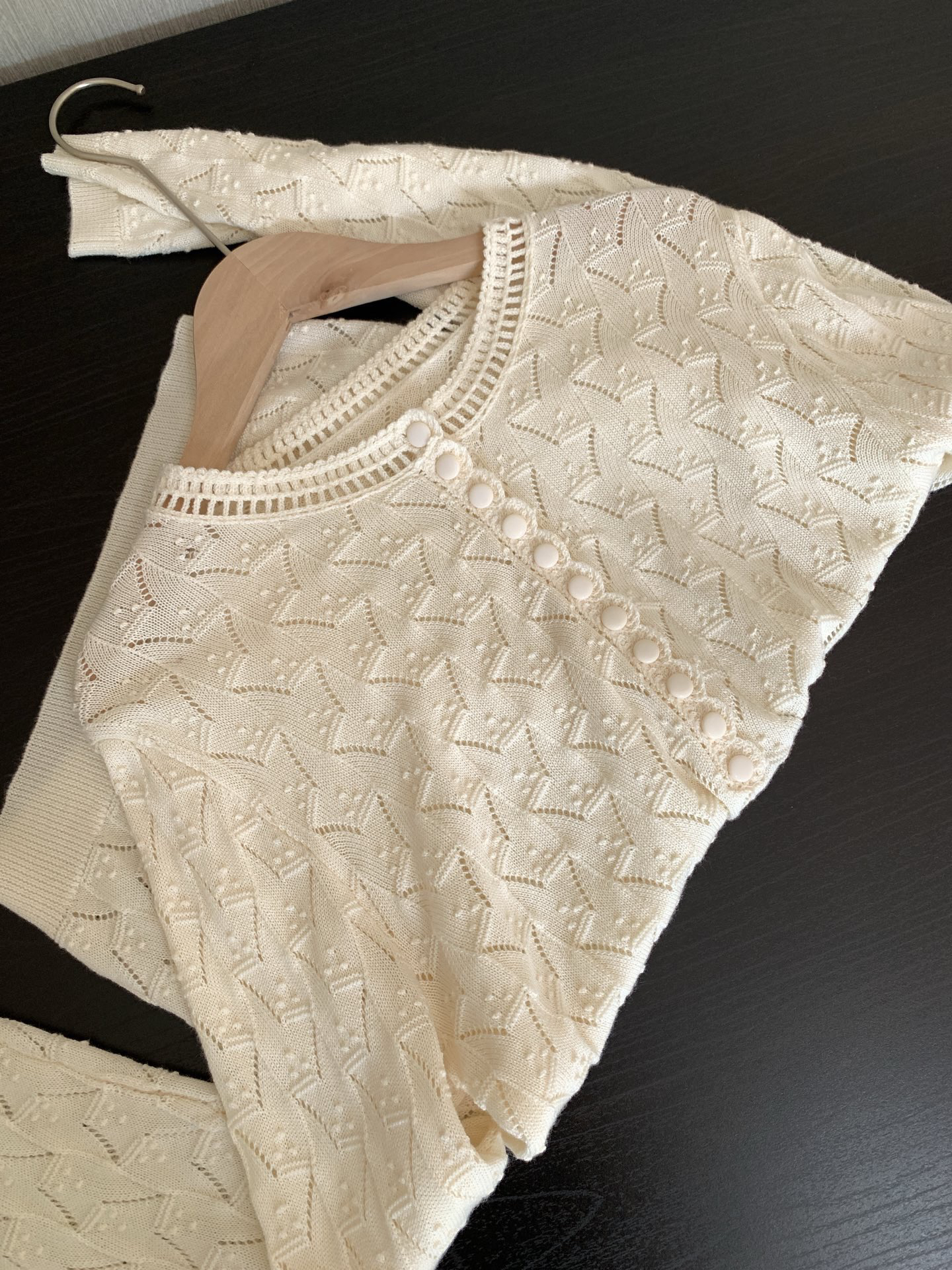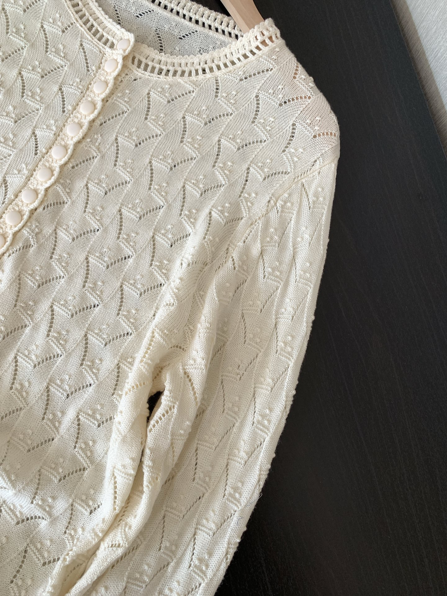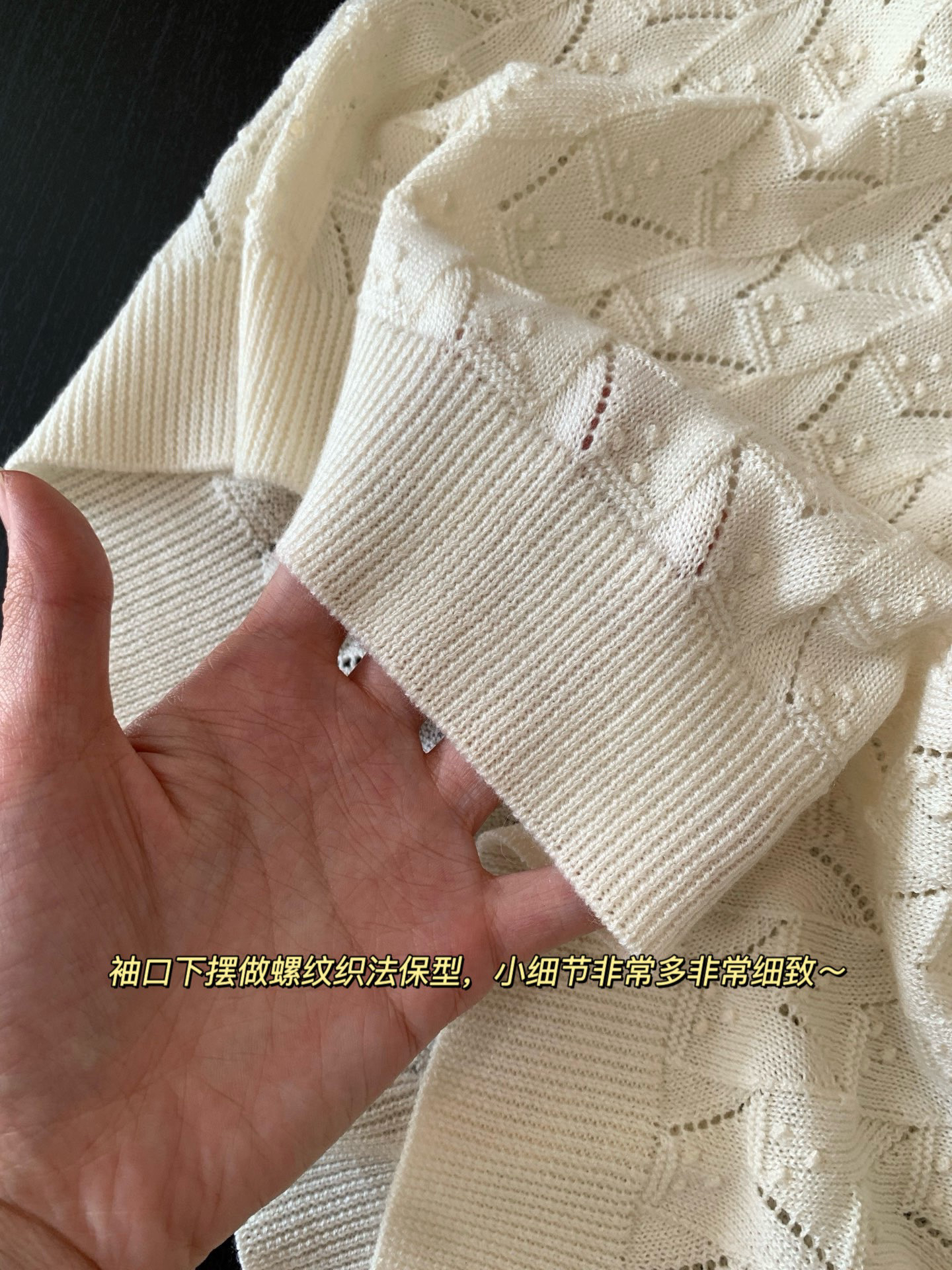 领口单独做镂空钩织,纽扣门襟做完花边钩织后手工套扣衔接,袖口下摆做螺纹织法保型,小细节非常多非常细致~