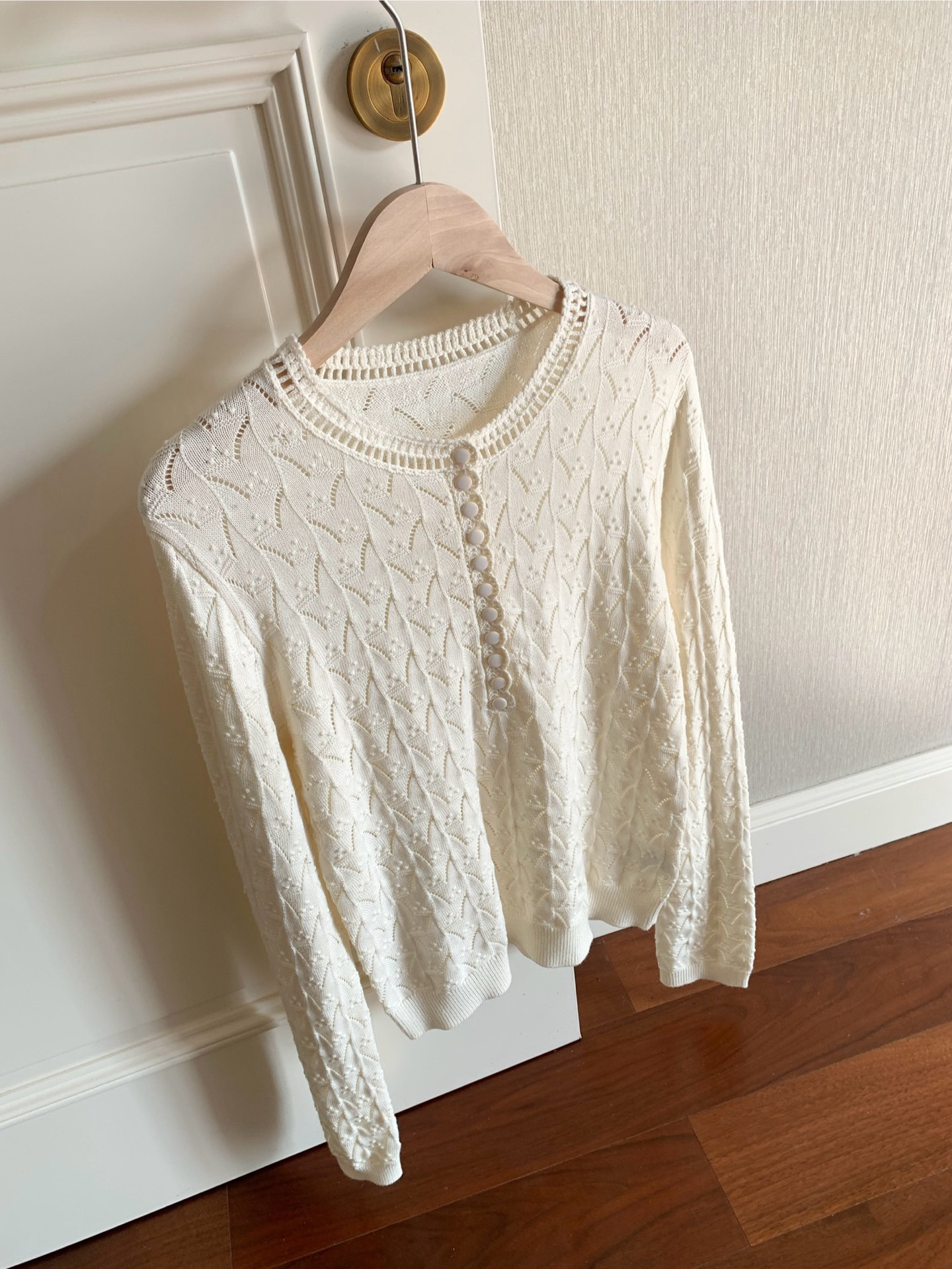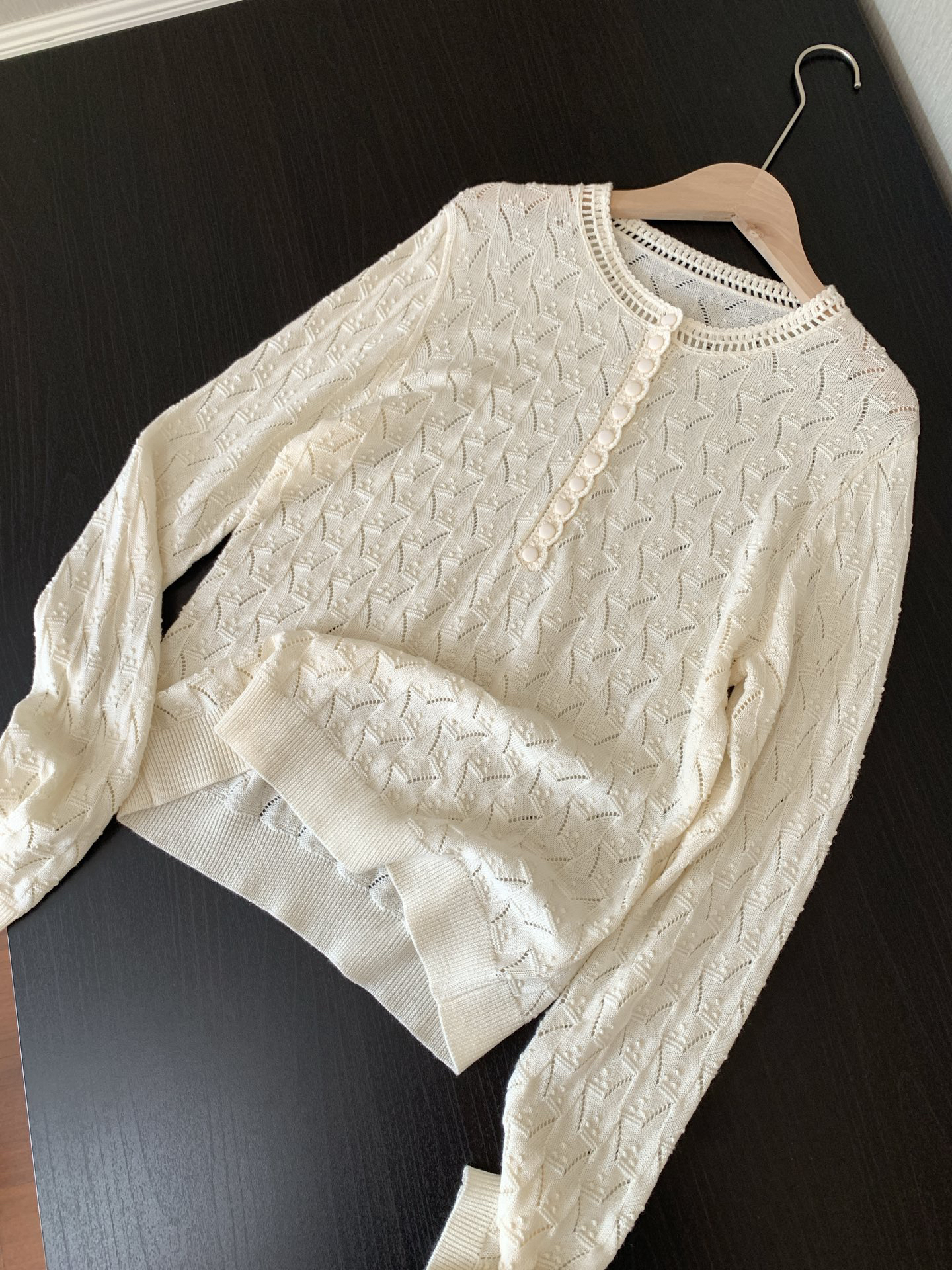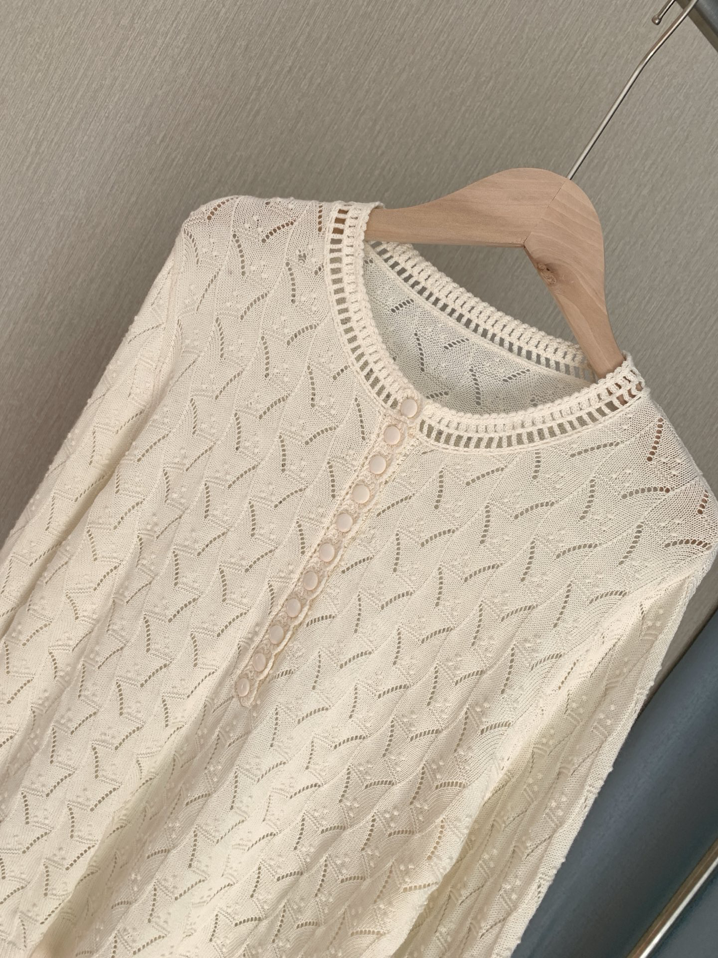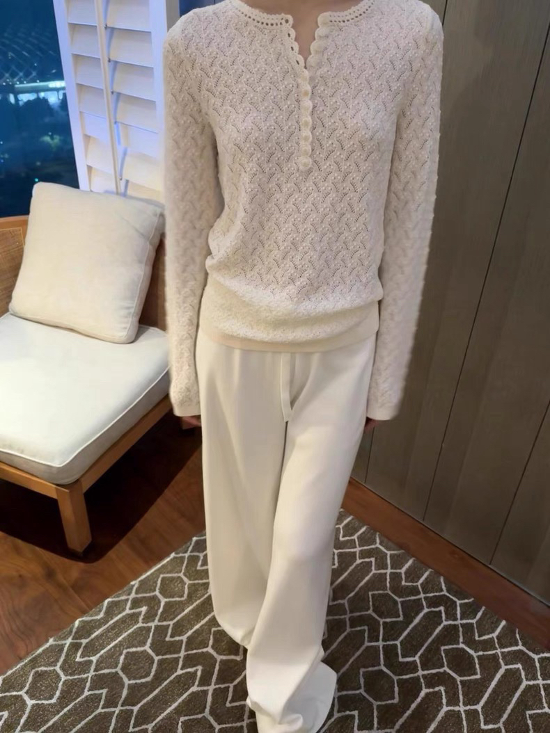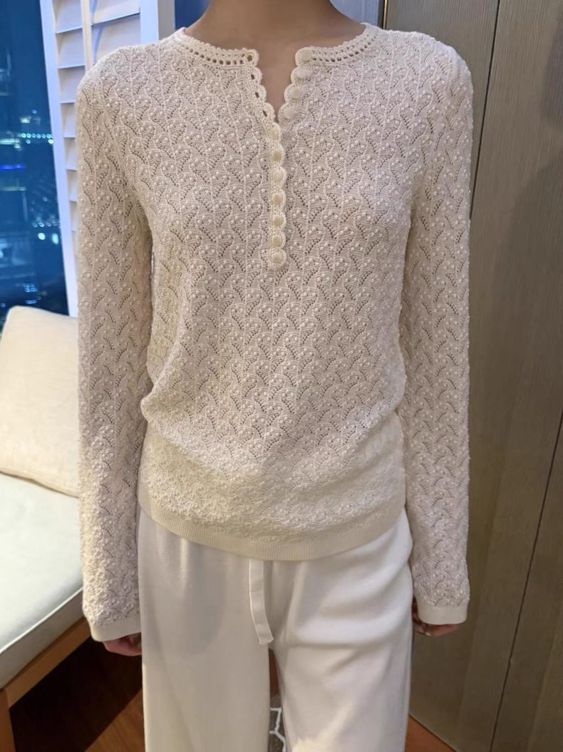镂空领边配立体花纹挑洞针织,亨利领式的纽扣花边半开襟,定制米白蘑菇扣,纽扣可以解开。