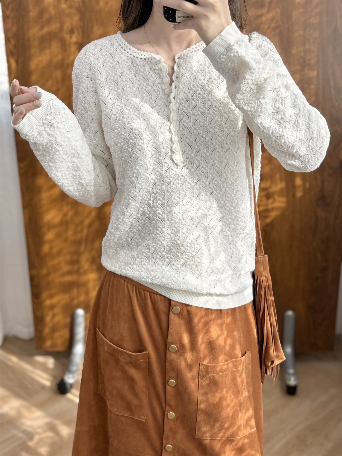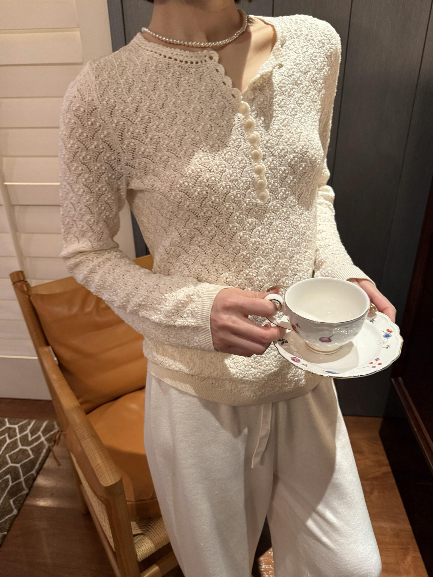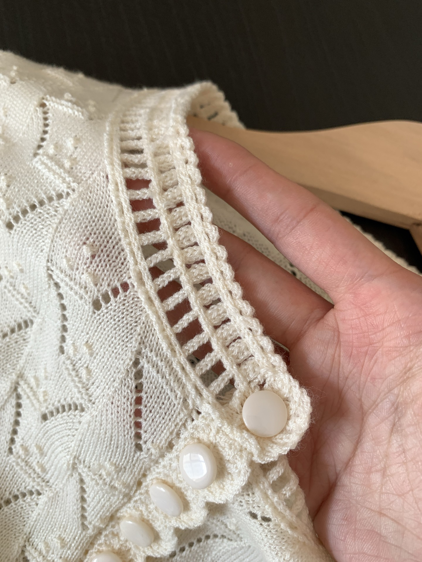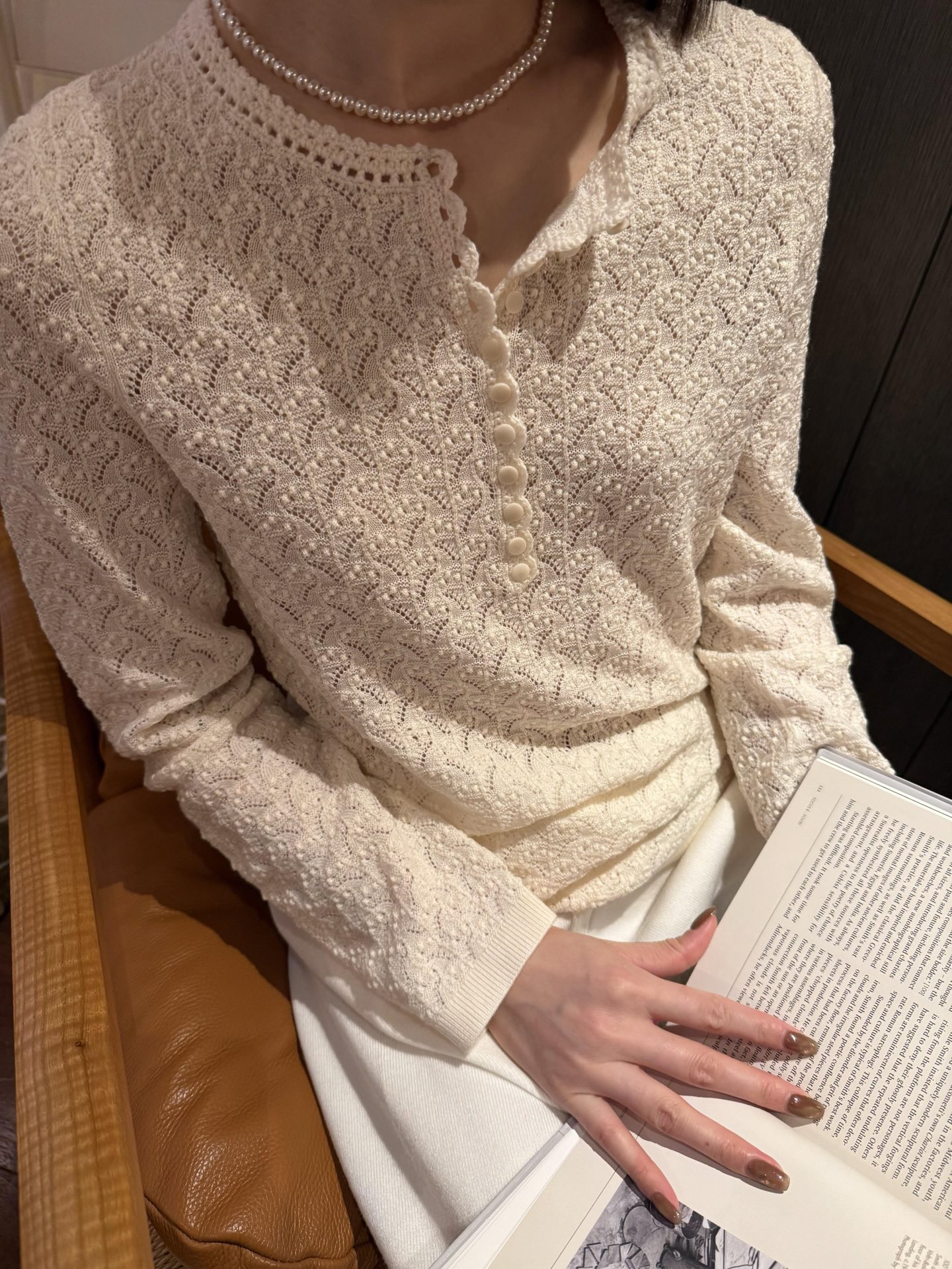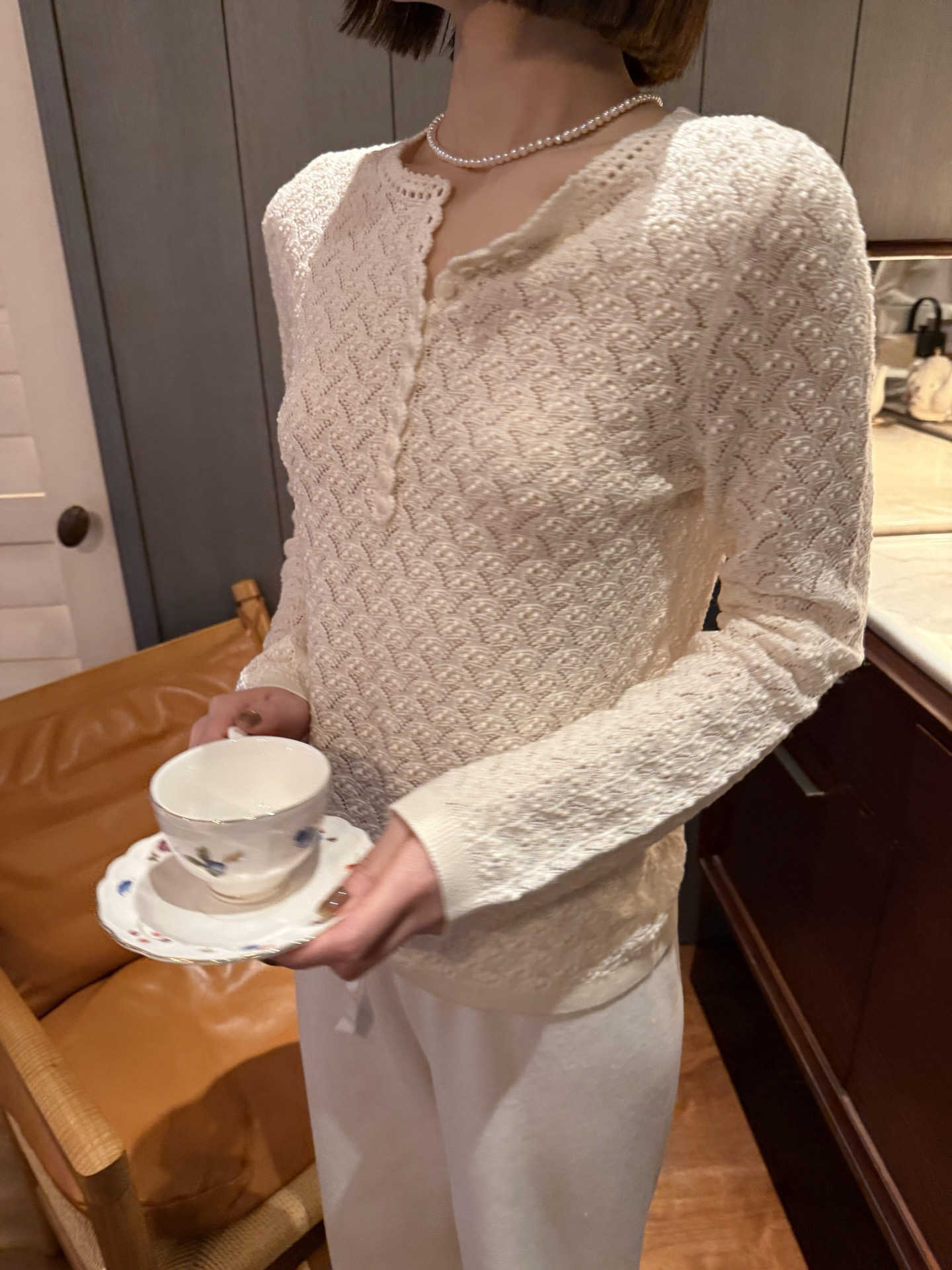 镂空领边配立体花纹挑洞针织,亨利领式的纽扣花边半开襟,定制米白蘑菇扣,纽扣可以解开。
