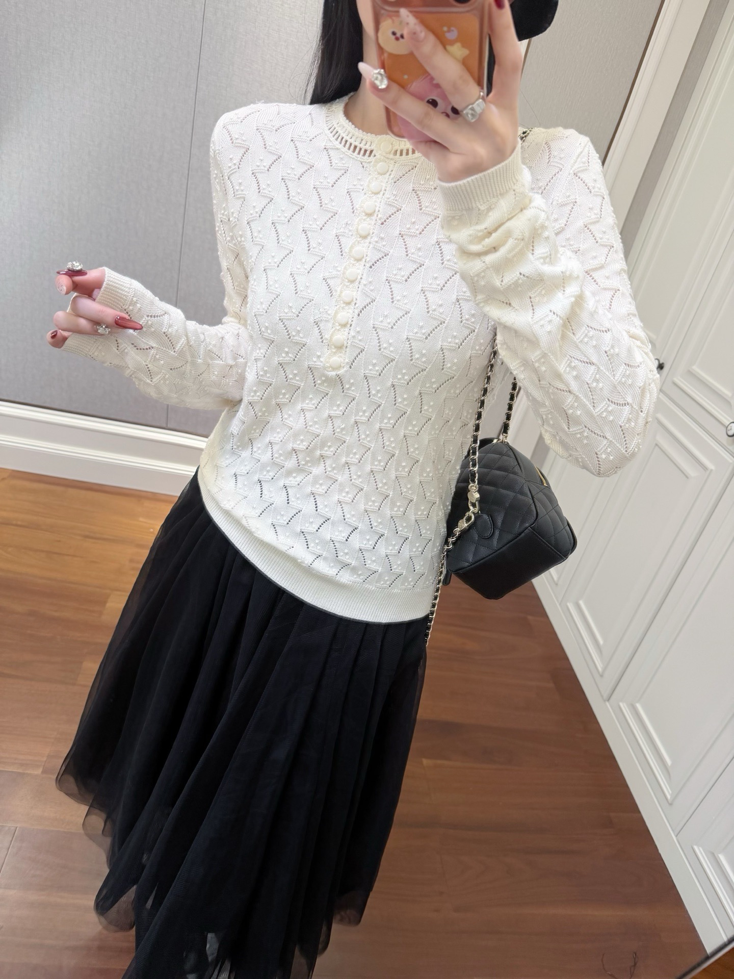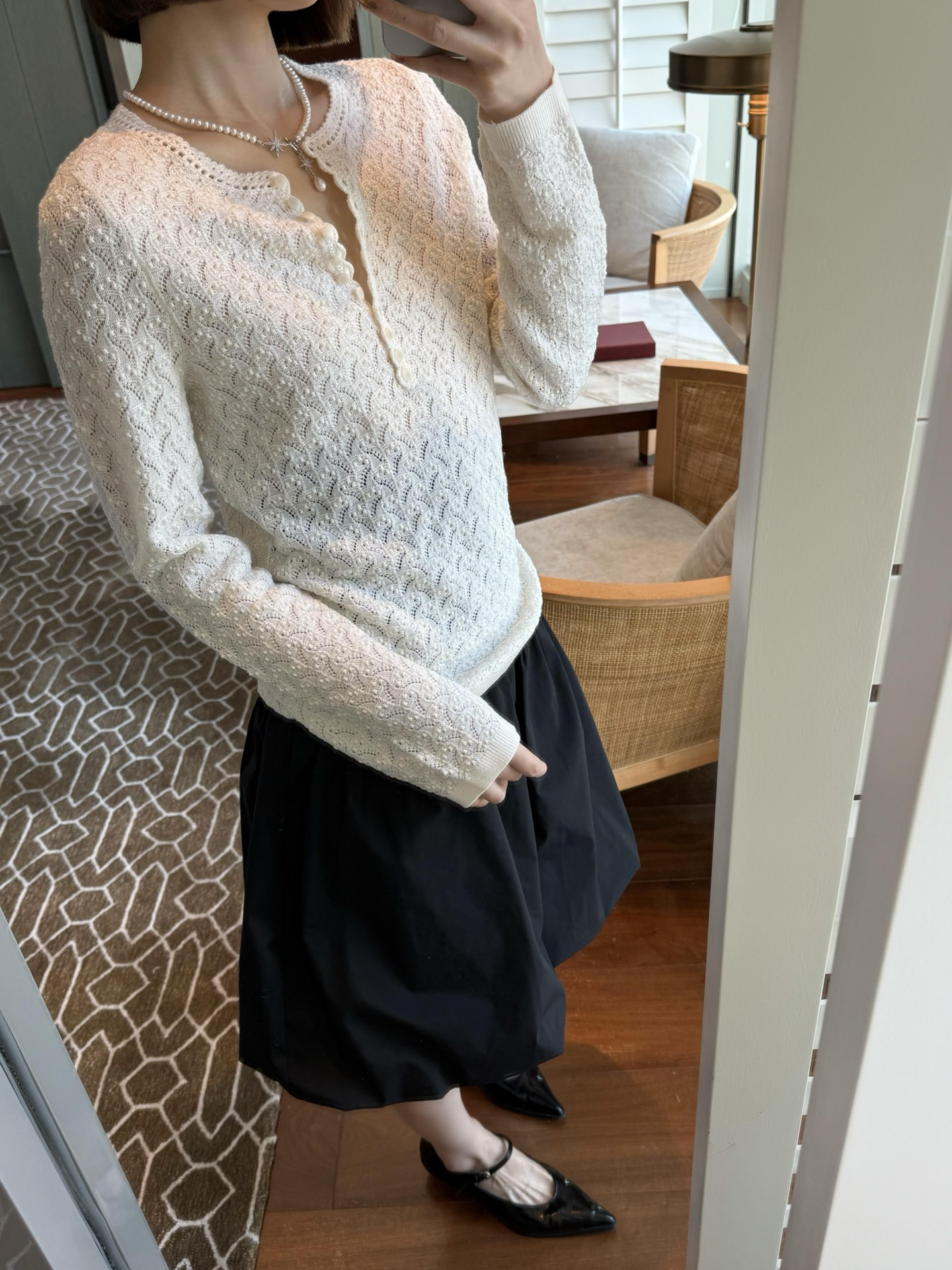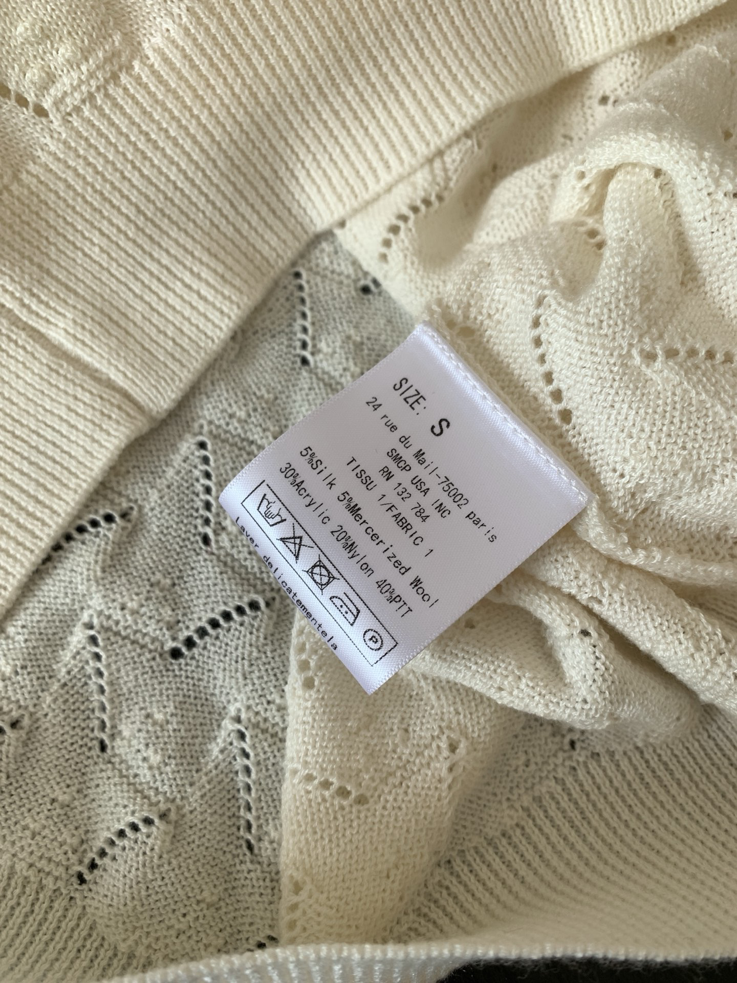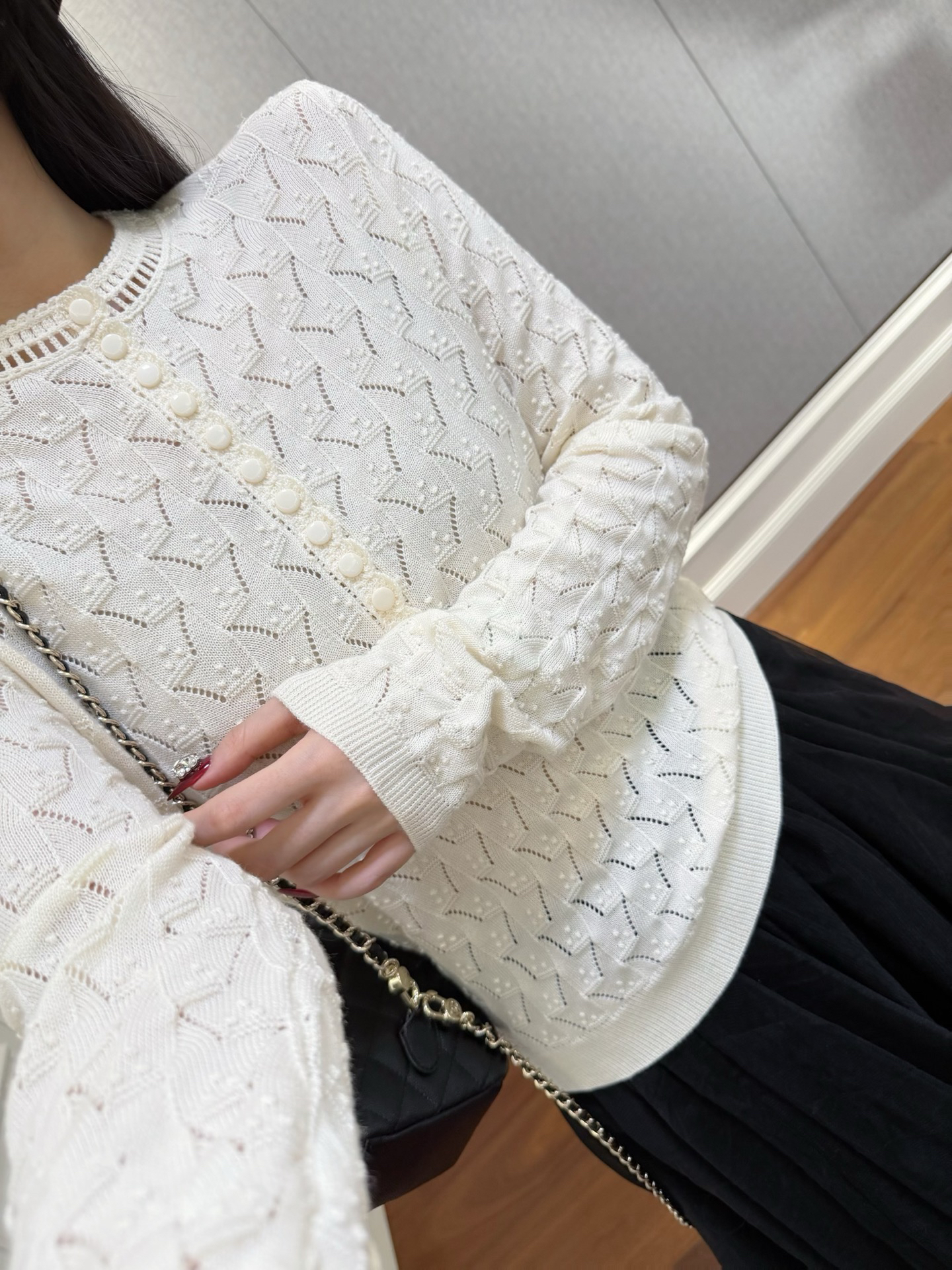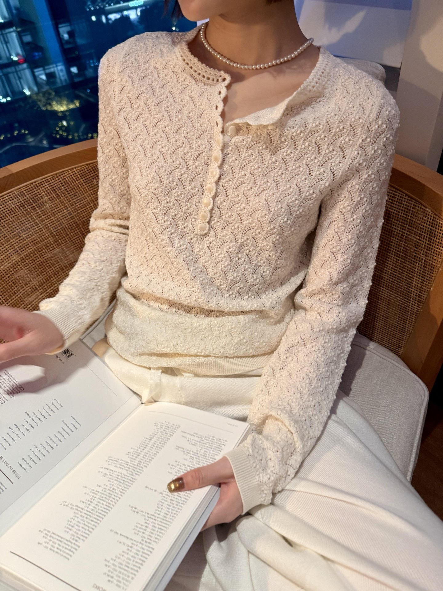 镂空领边配立体花纹挑洞针织,亨利领式的纽扣花边半开襟,定制米白蘑菇扣,纽扣可以解开。