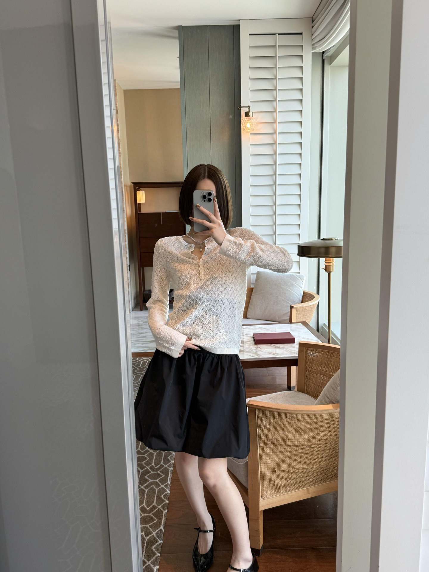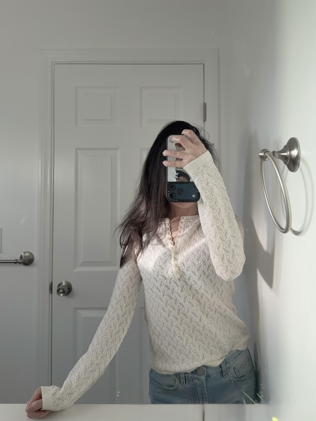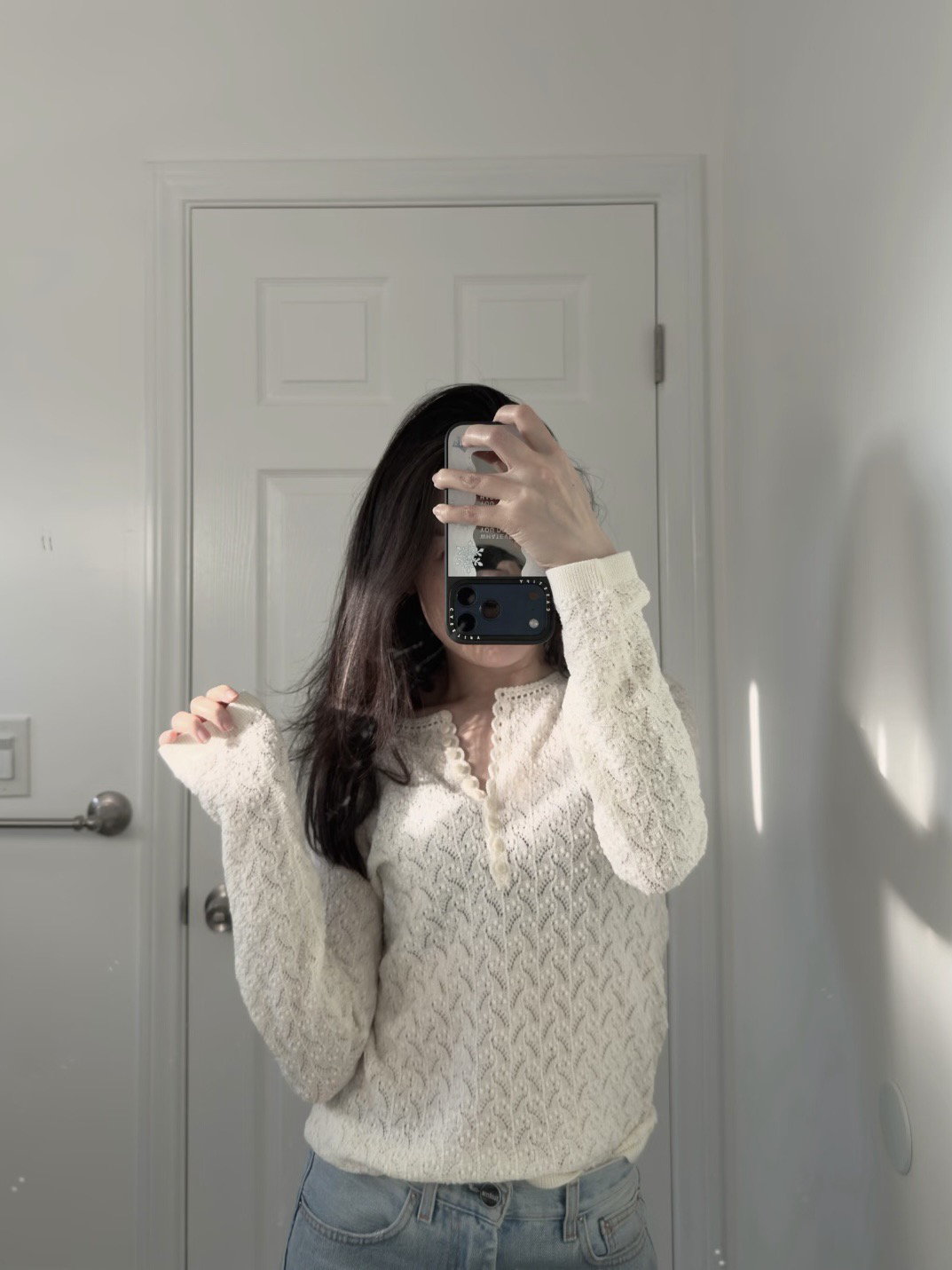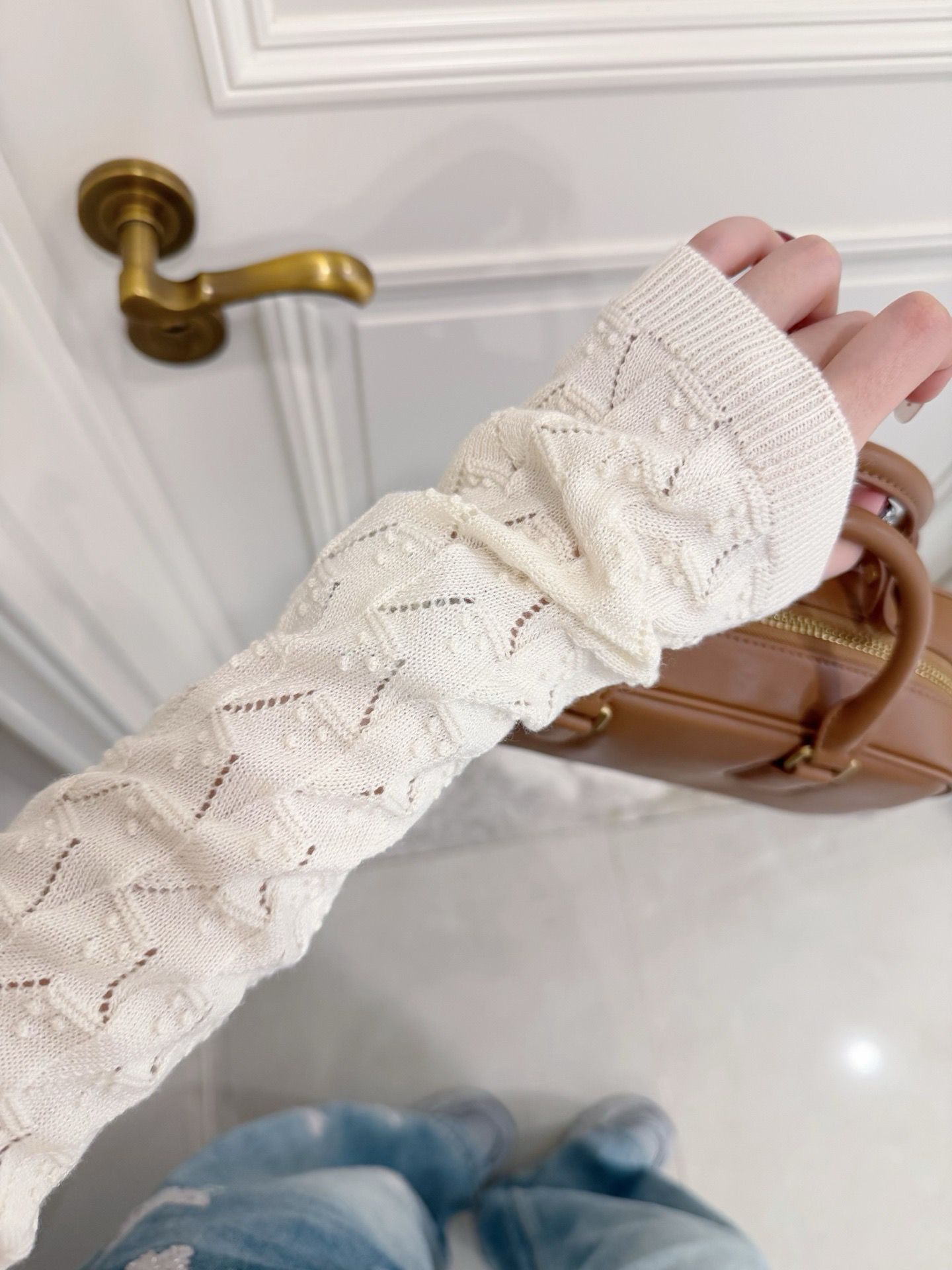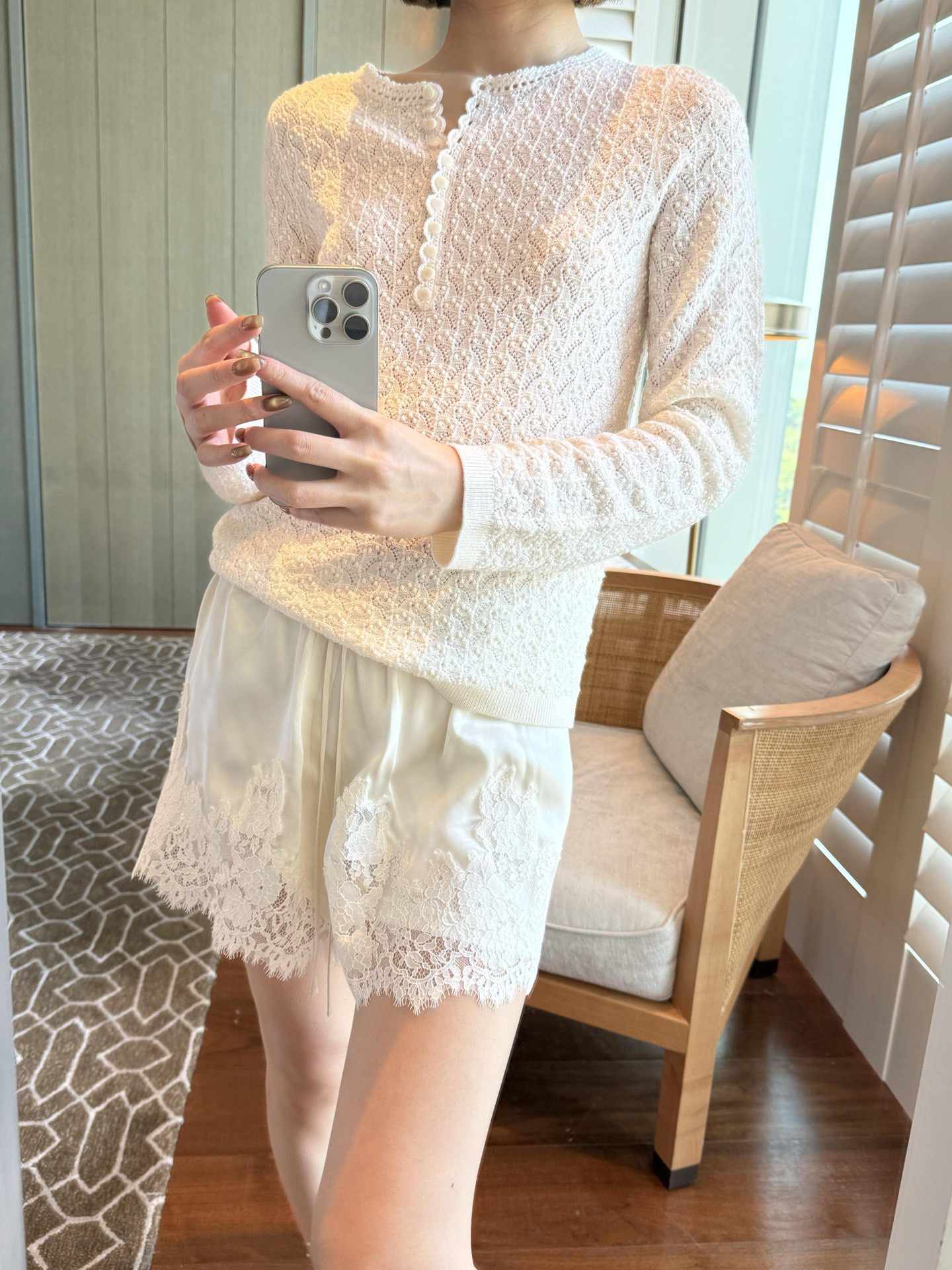 镂空领边配立体花纹挑洞针织,亨利领式的纽扣花边半开襟,定制米白蘑菇扣,纽扣可以解开。
