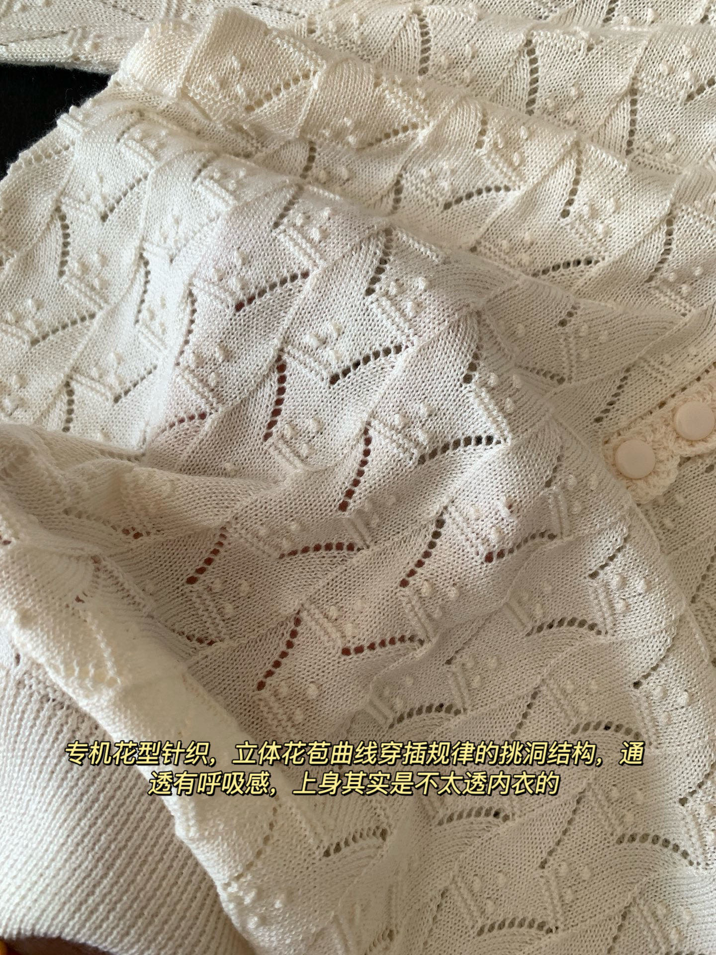 专机花型针织,立体花苞曲线穿插规律的挑洞结构,通透有呼吸感,上身其实是不太透内衣的,领口单独做镂空钩织,纽扣门襟做完花边钩织后手工套扣衔接,袖口下摆做螺纹织法保型,小细节非常多非常细致~