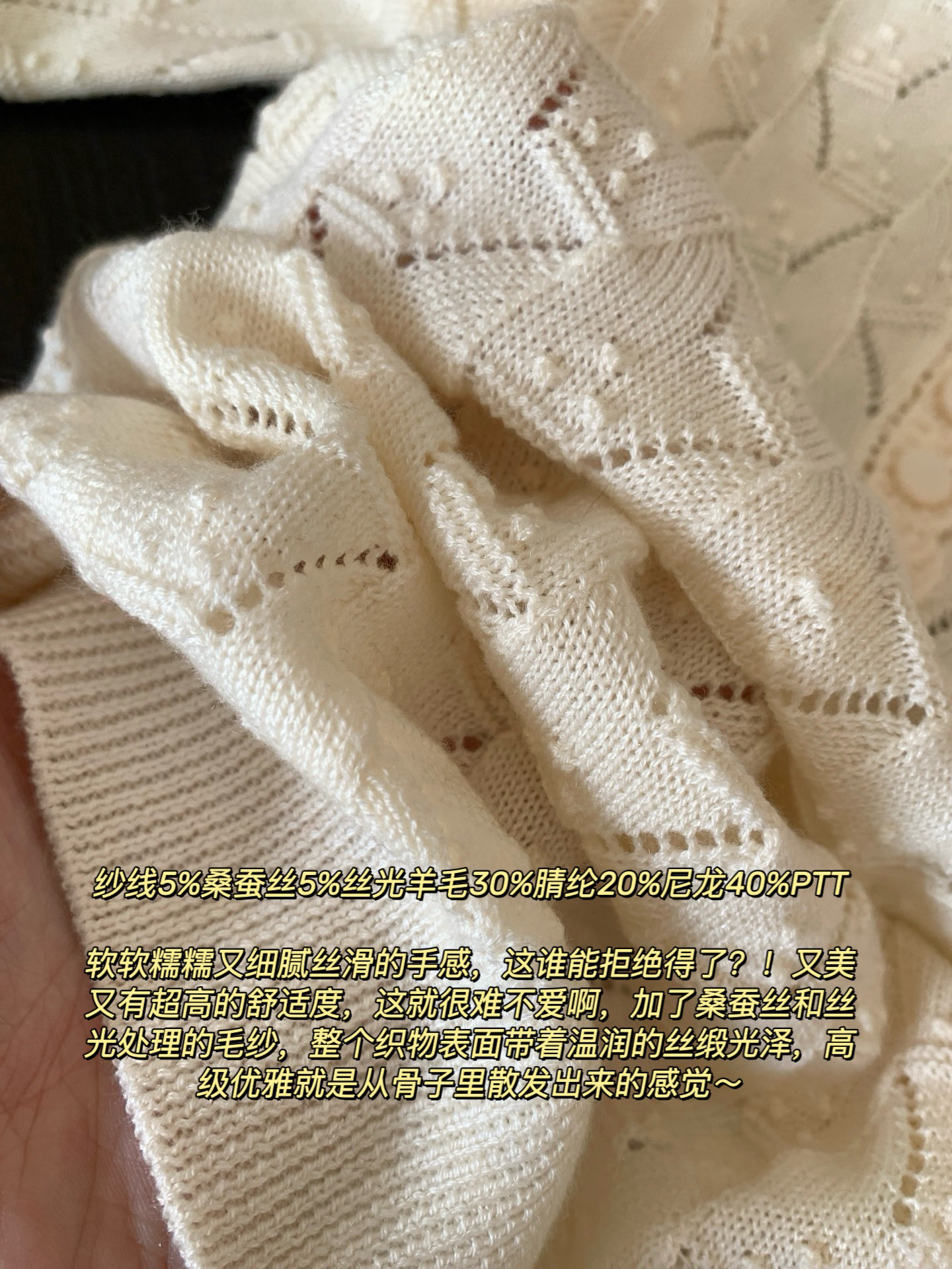纱线5%桑蚕丝5%丝光羊毛30%腈纶20%尼龙40%PTT(聚酯)软软糯糯又细腻丝滑的手感,这谁能拒绝得了?!又美又有超高的舒适度,这就很难不爱啊,加了桑蚕丝和丝光处理的毛纱,整个织物表面带着温润的丝缎光泽,高级优雅就是从骨子里散发出来的感觉~