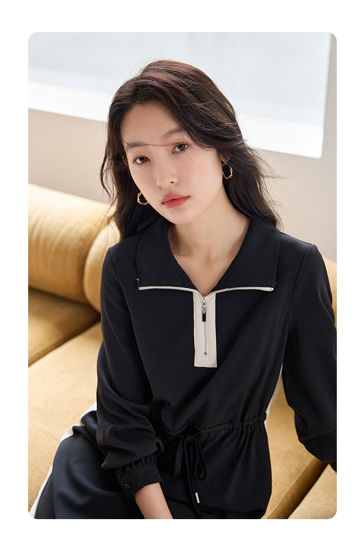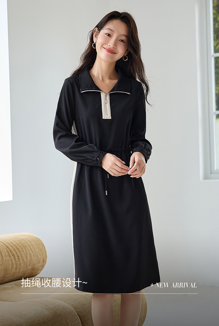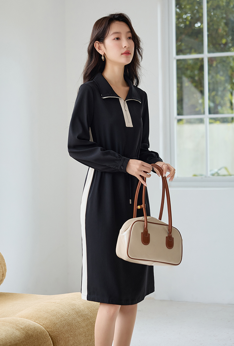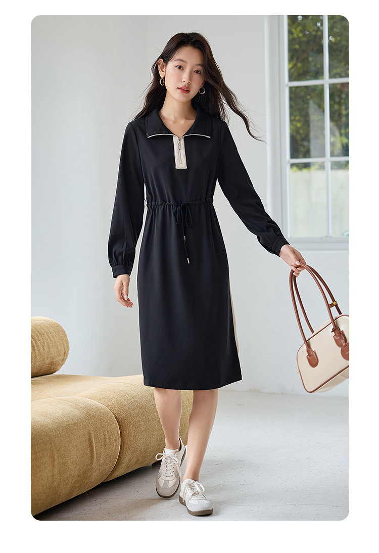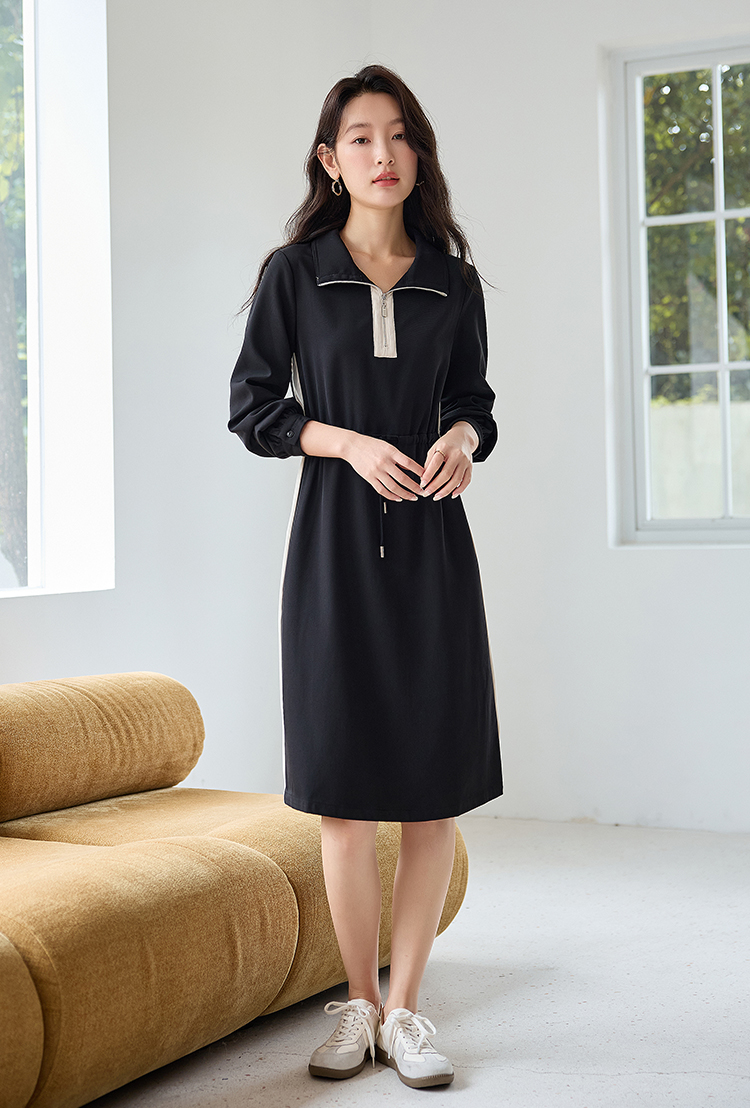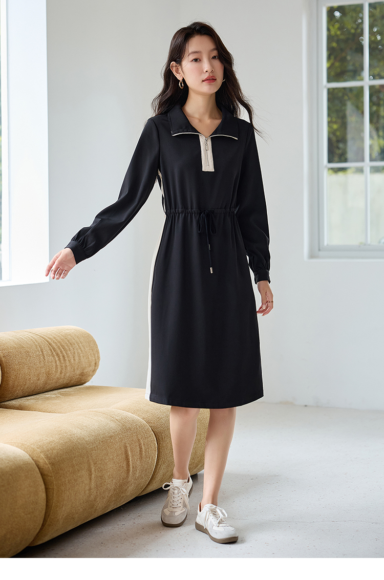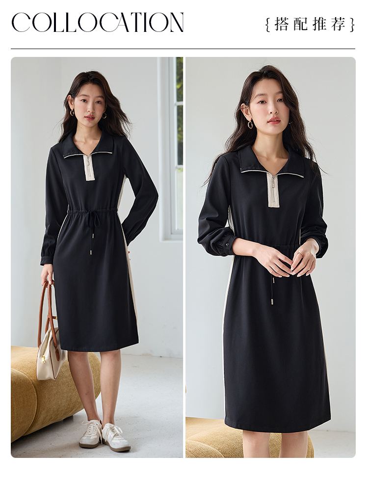 【年终特卖】熙世界休闲POLO领连衣裙2025秋季新款宽松时尚撞色拉链卫衣裙
