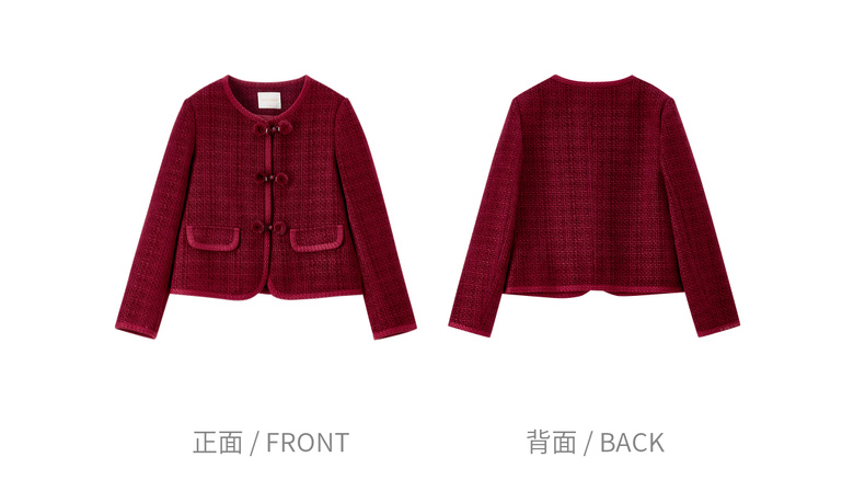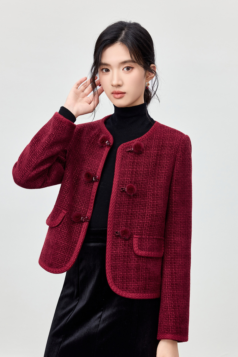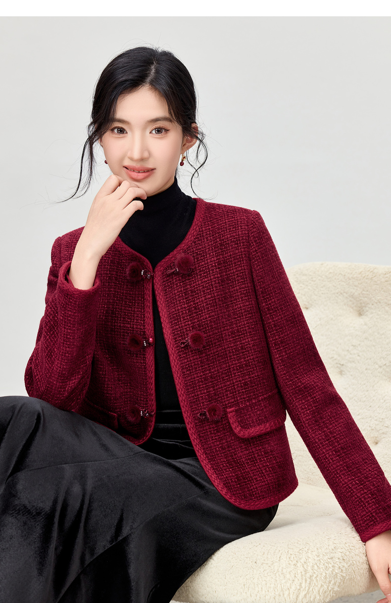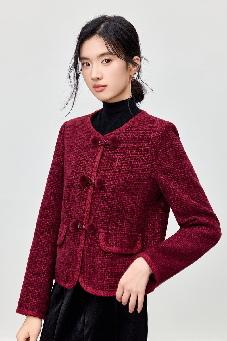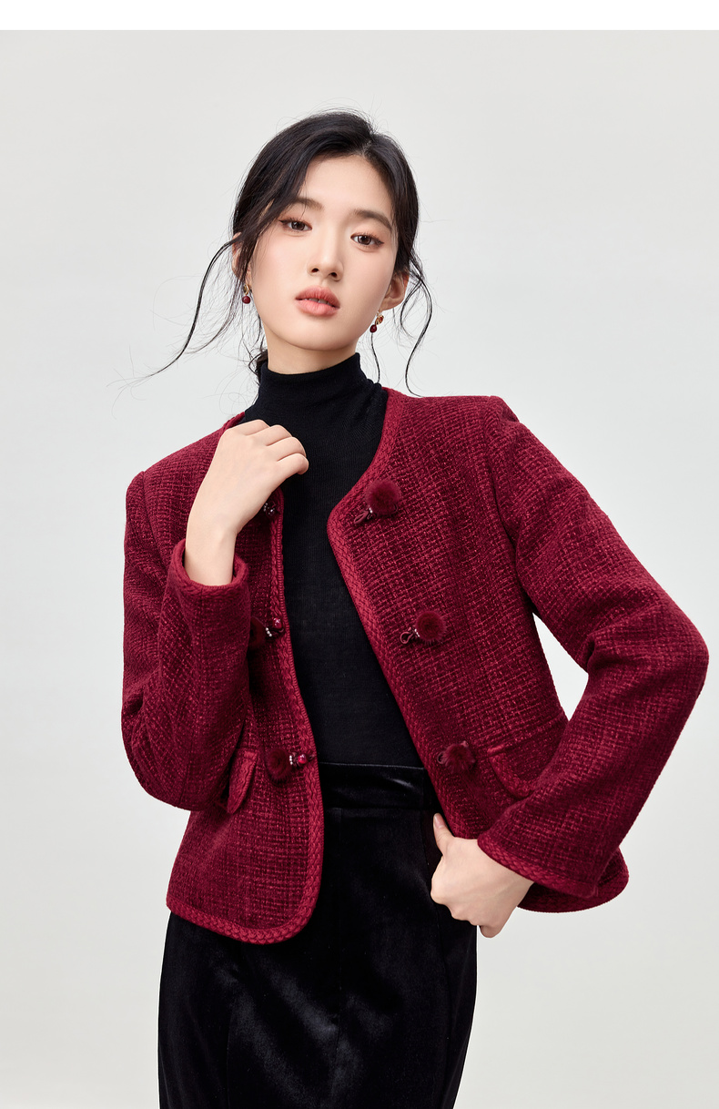 【内购】【毛绒盘扣】通勤织带圆领装饰假口袋垫肩厚保暖小香风雪尼尔外套-154WA3701