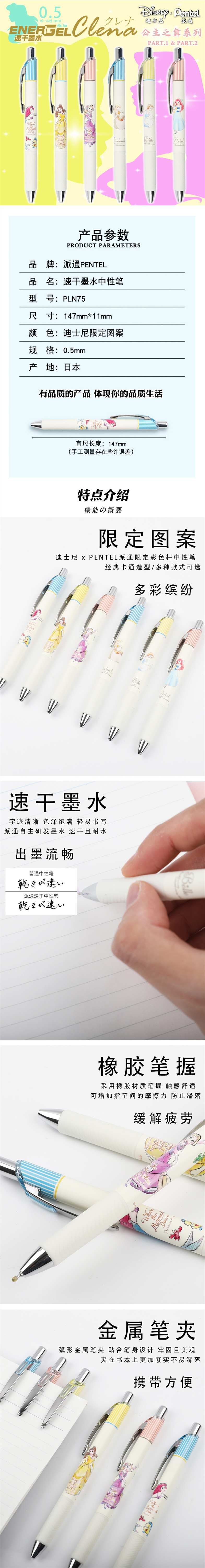 女神节快乐!日本Pentel派通迪士尼公主限定BLN75中性笔速干防水笔芯按动黑笔