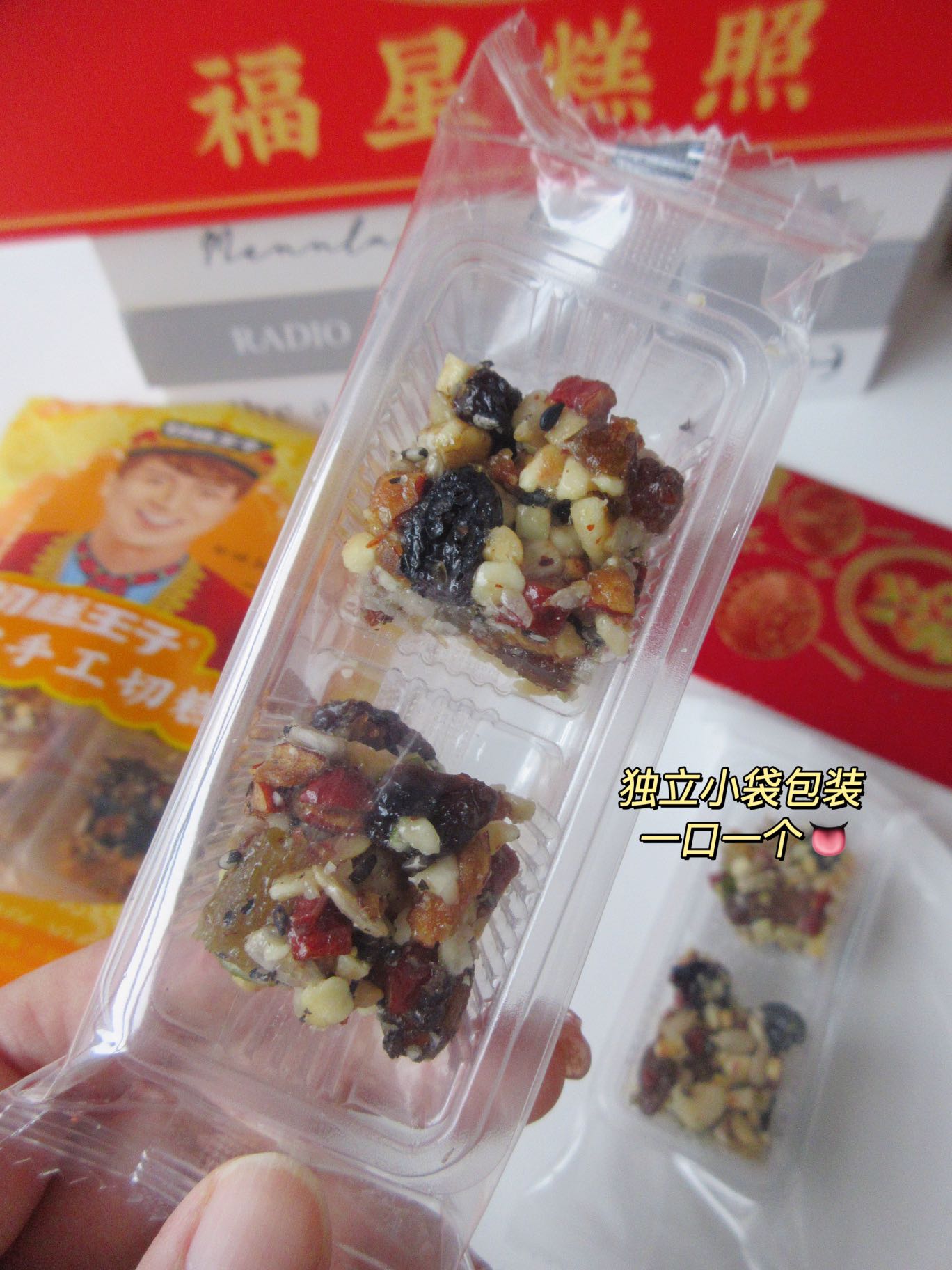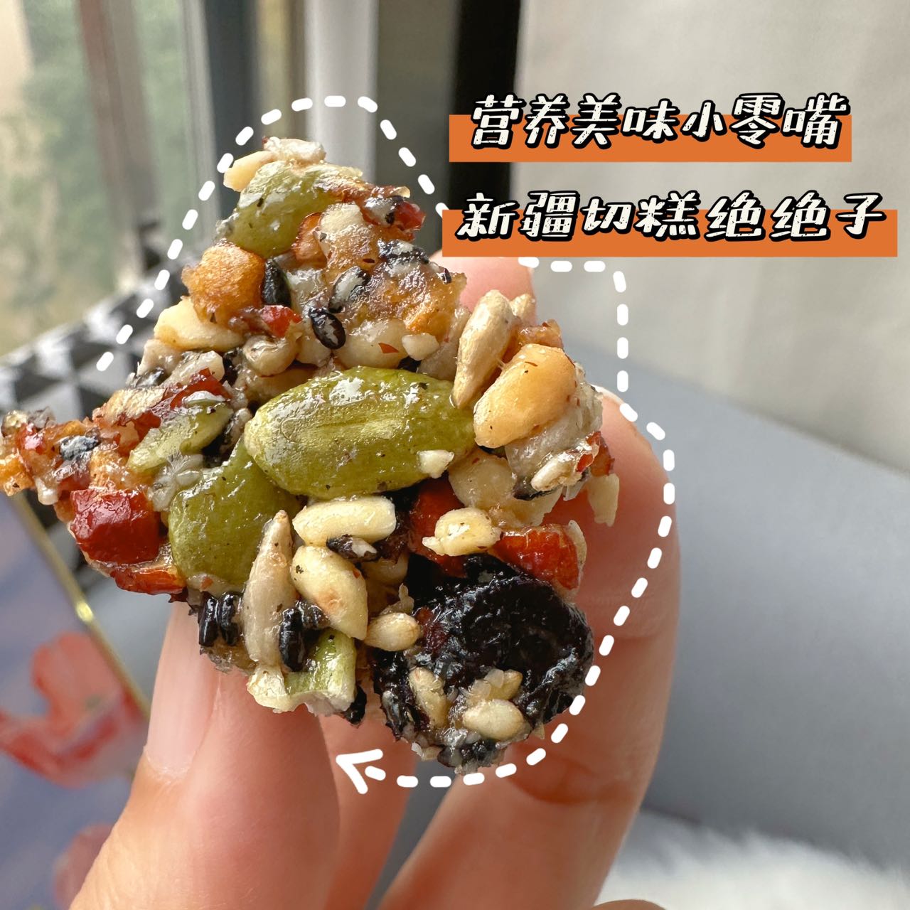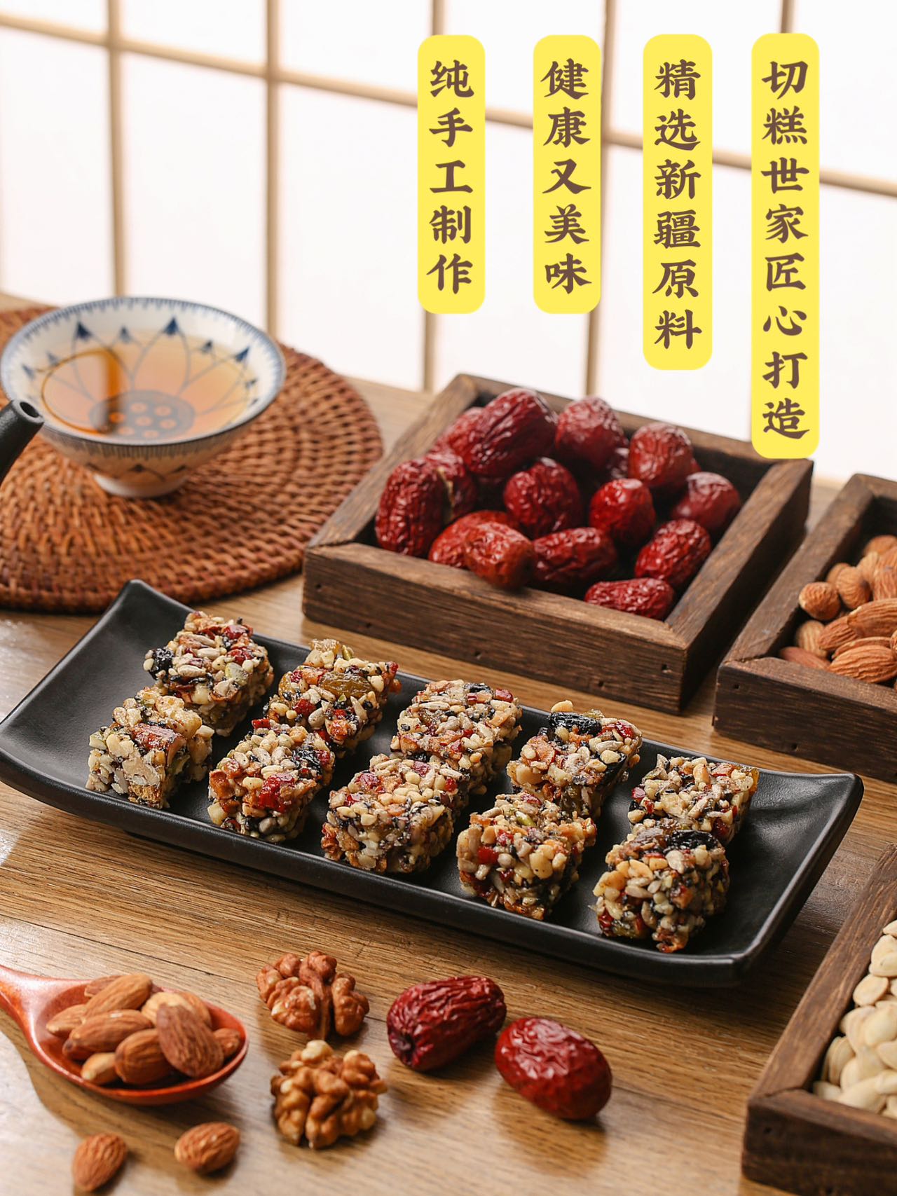 【配料】红枣丁,核桃仁,南瓜籽仁,葡萄干,花生碎,巴旦木仁,瓜籽仁,麦芽糖,新疆黑蜂蜂蜜,黑芝麻
