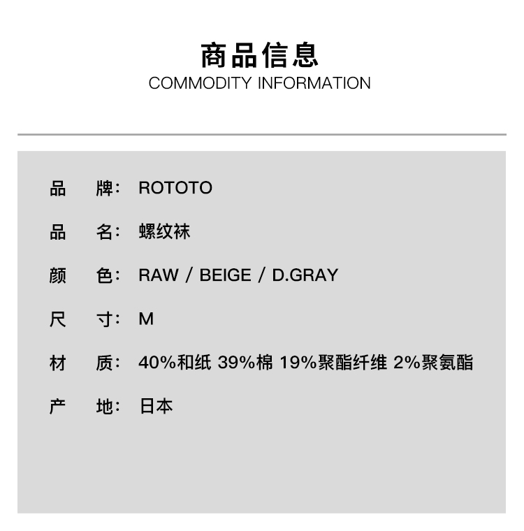 ROTOTO WASHI/RECYCLED COTTON 日本奈良制和纸纤维棉混纺螺纹袜