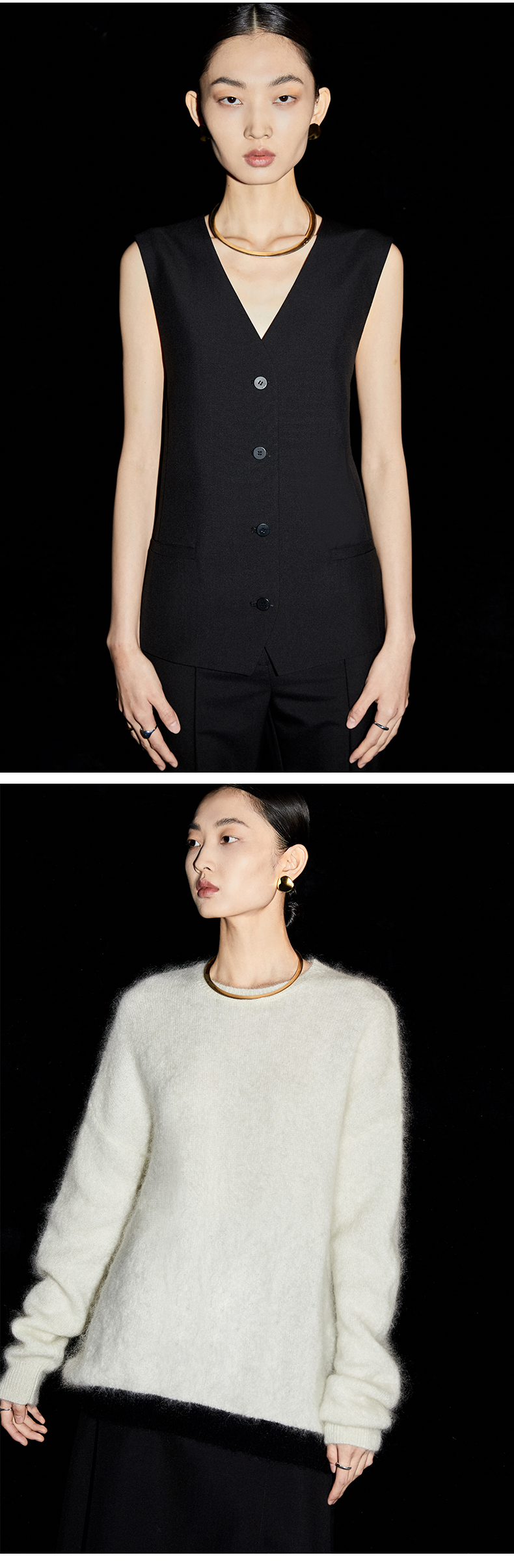 HIDEMI 美利奴羊毛绞花V领背心 原白色/藏蓝色