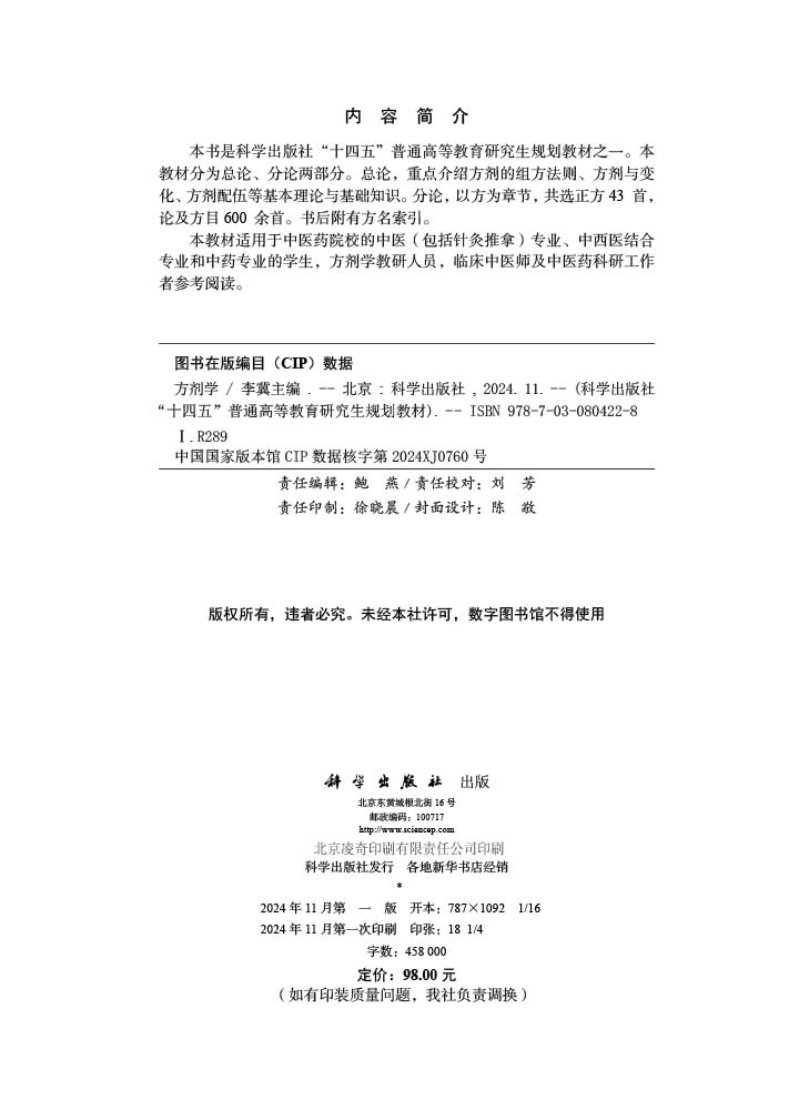 方剂学 十四五普通高等教育研究生规划教材 李冀主编 适用于中医药院校的中医包括针灸推拿等专业科研参考9787030804228科学出版社