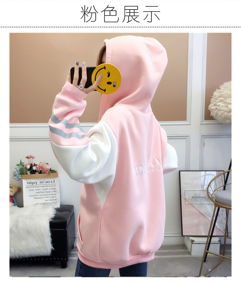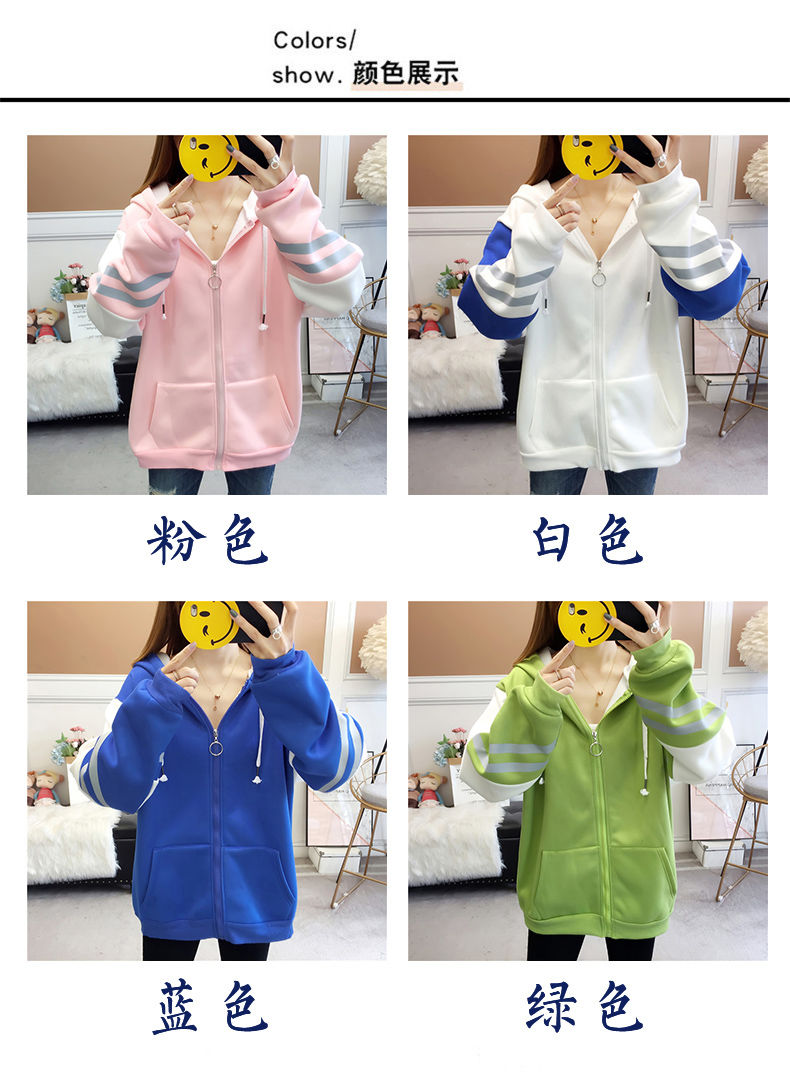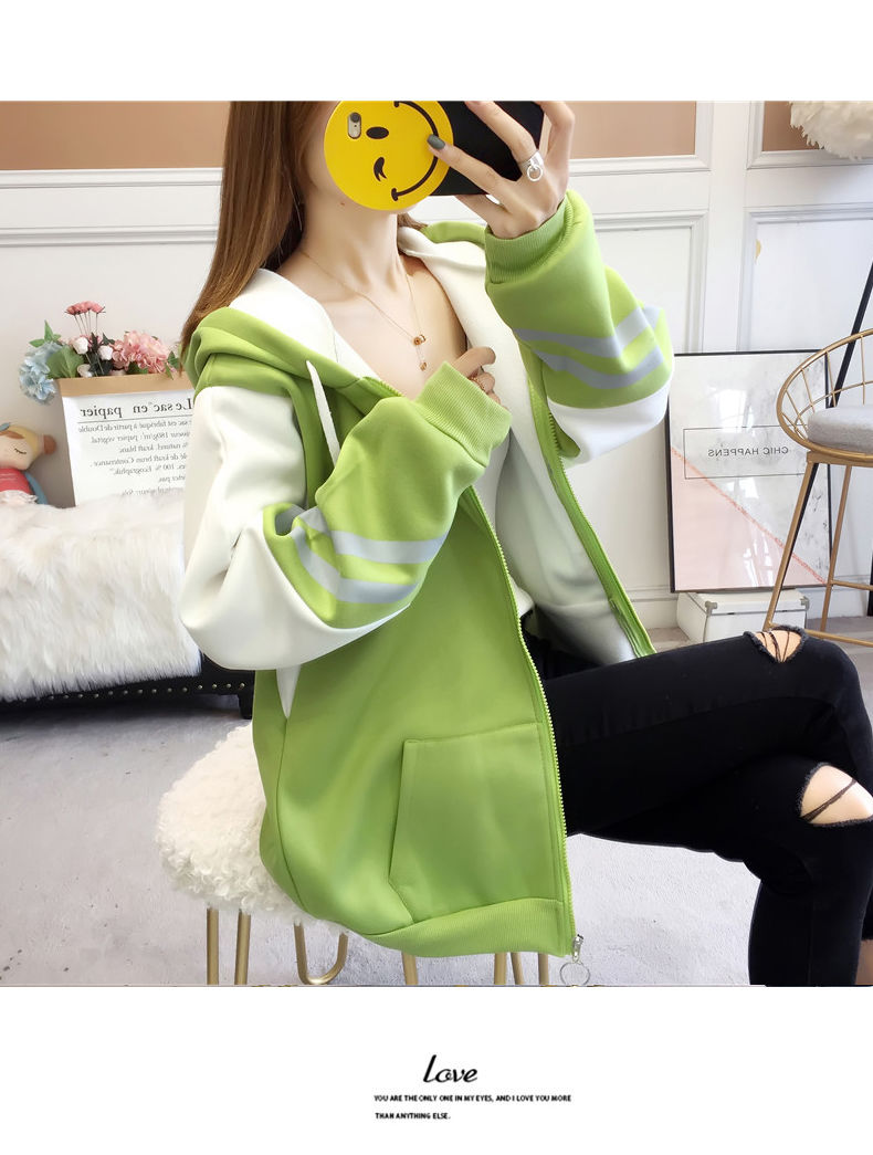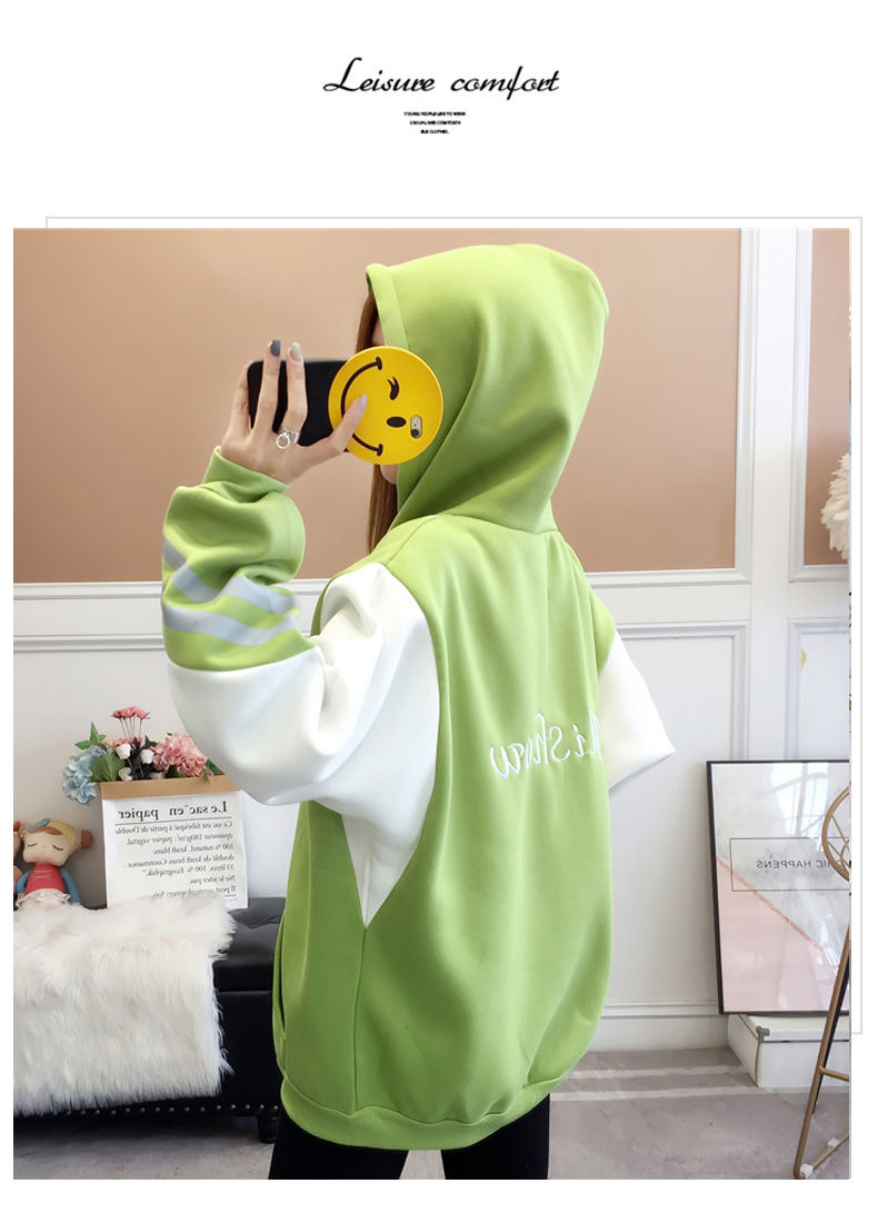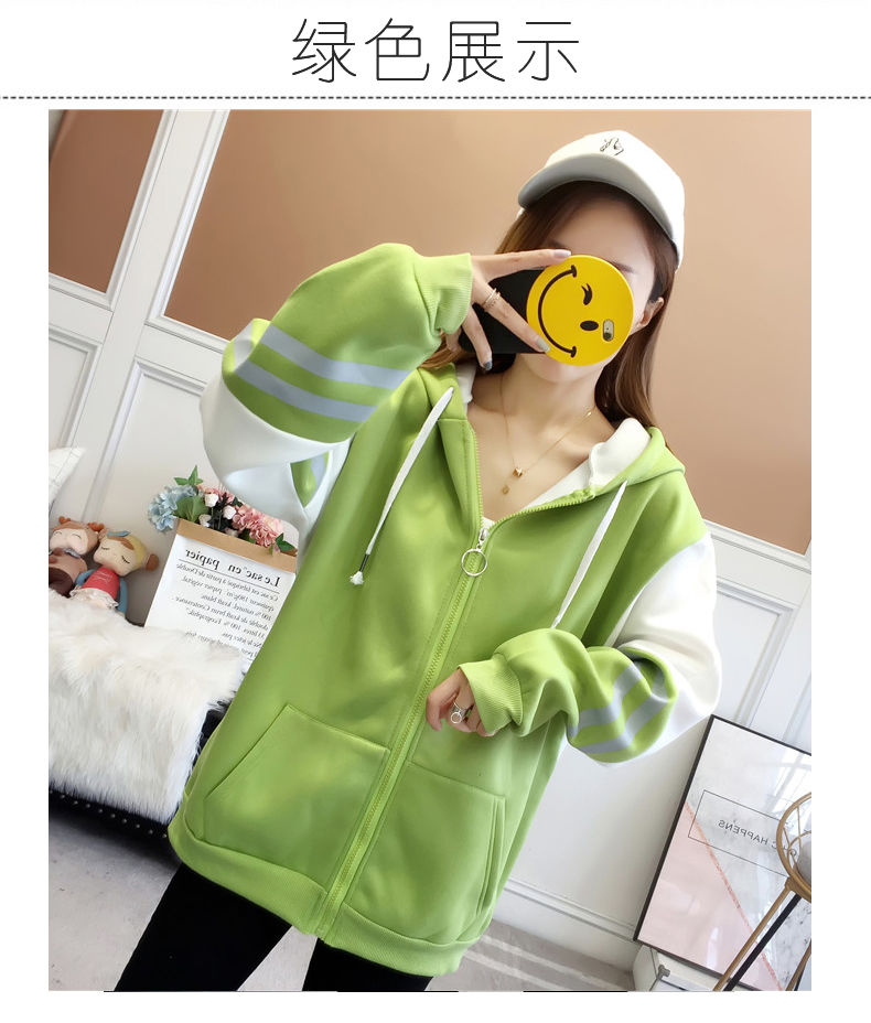 承包你整个秋冬的时髦~韩版大码连帽卫衣女牛油果绿学生加绒加厚宽松拉链拼色外套