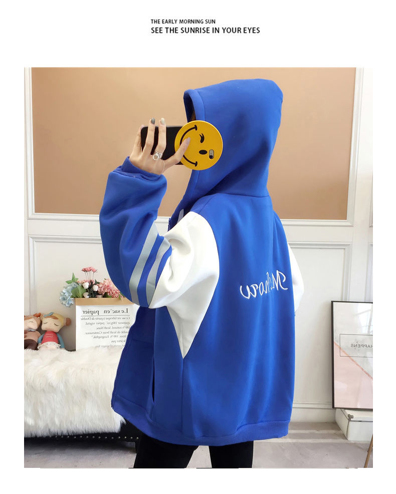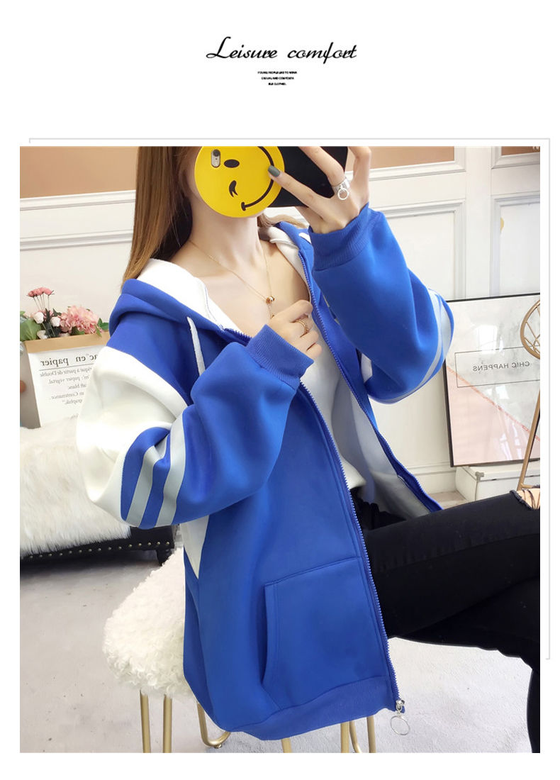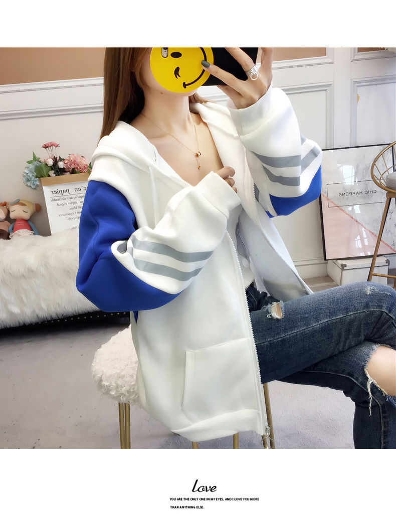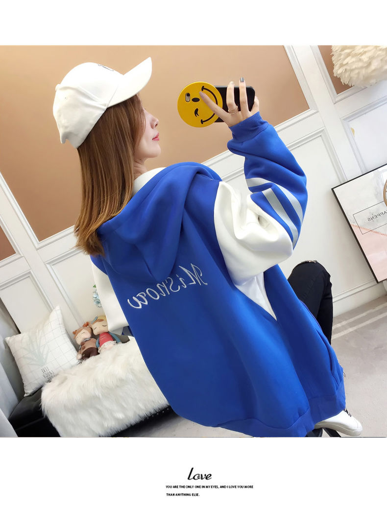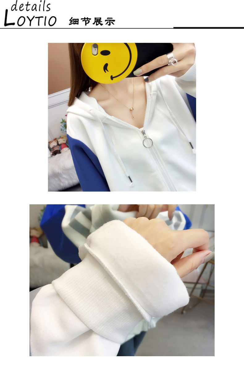 承包你整个秋冬的时髦~韩版大码连帽卫衣女牛油果绿学生加绒加厚宽松拉链拼色外套