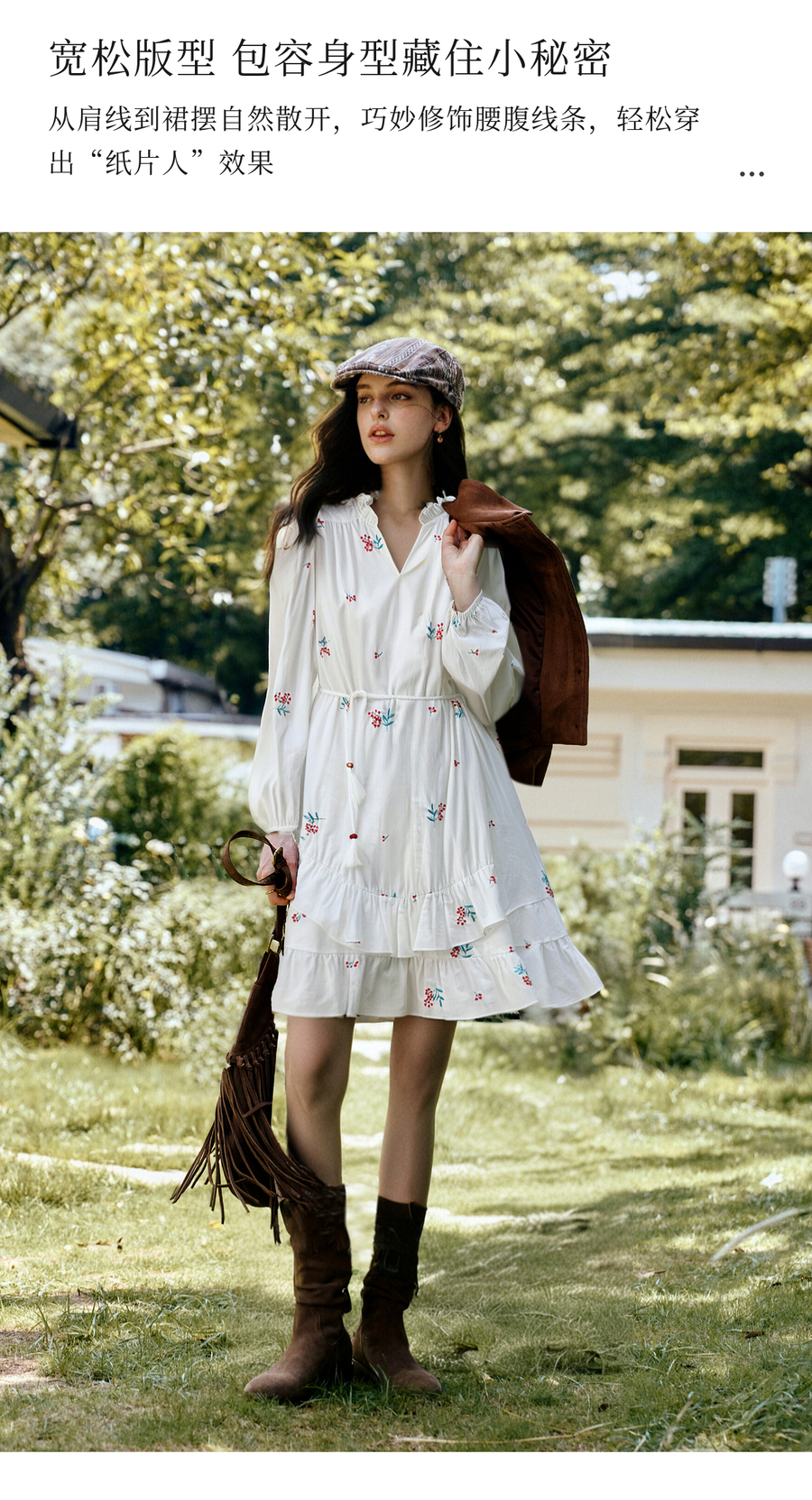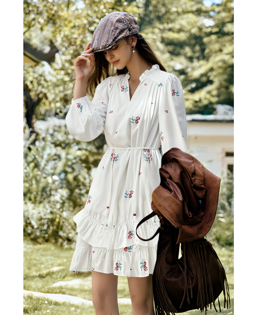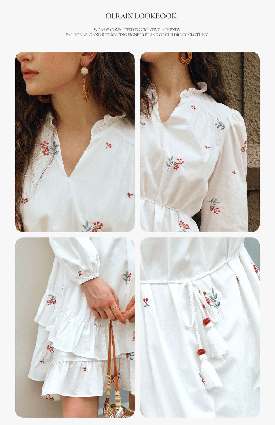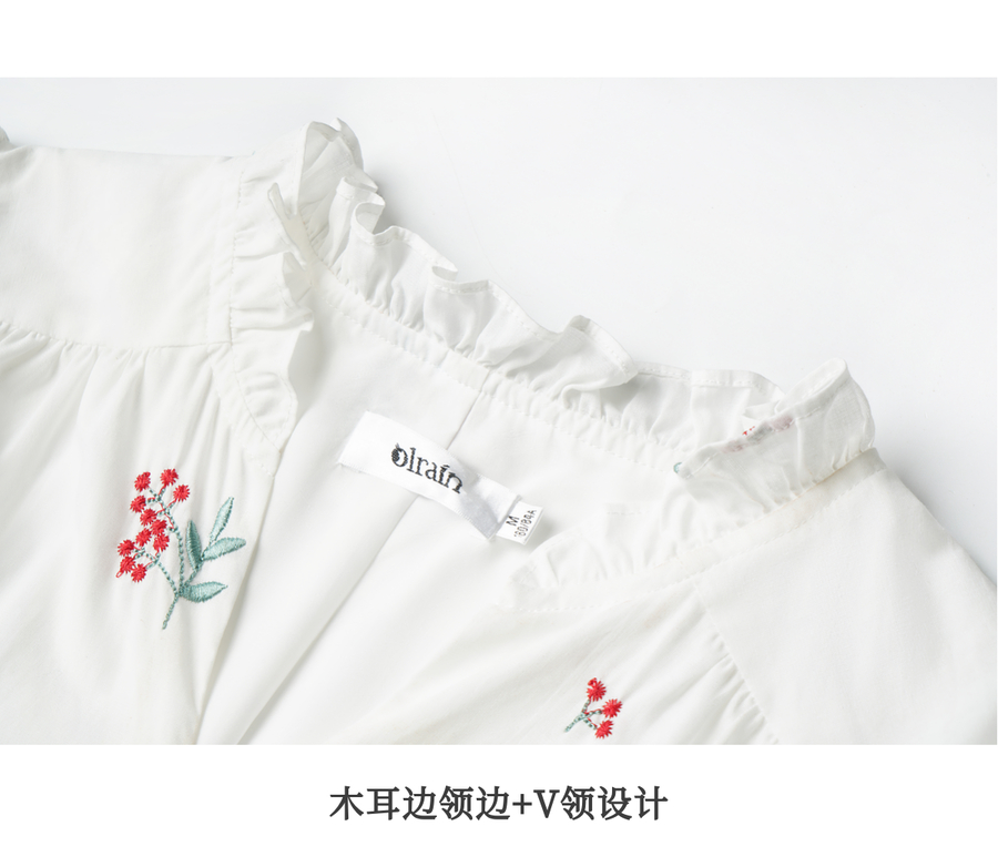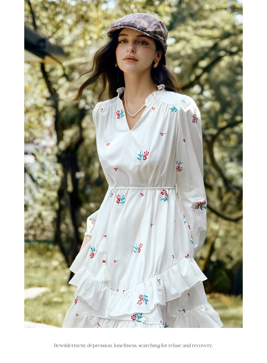OLrain欧芮儿2025新款女秋季绣花白色法式度假连衣裙流苏绑带长裙