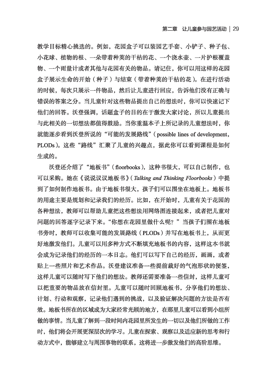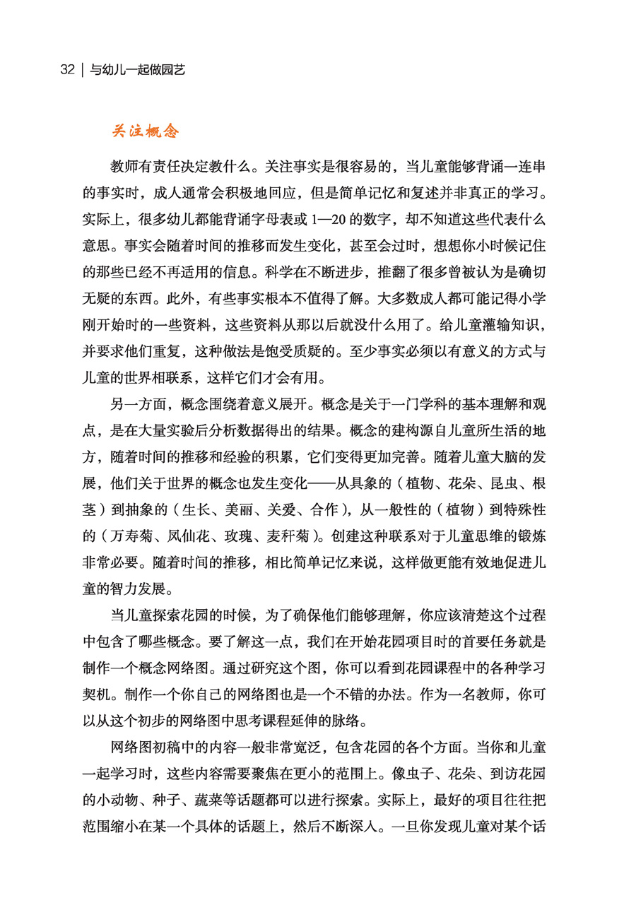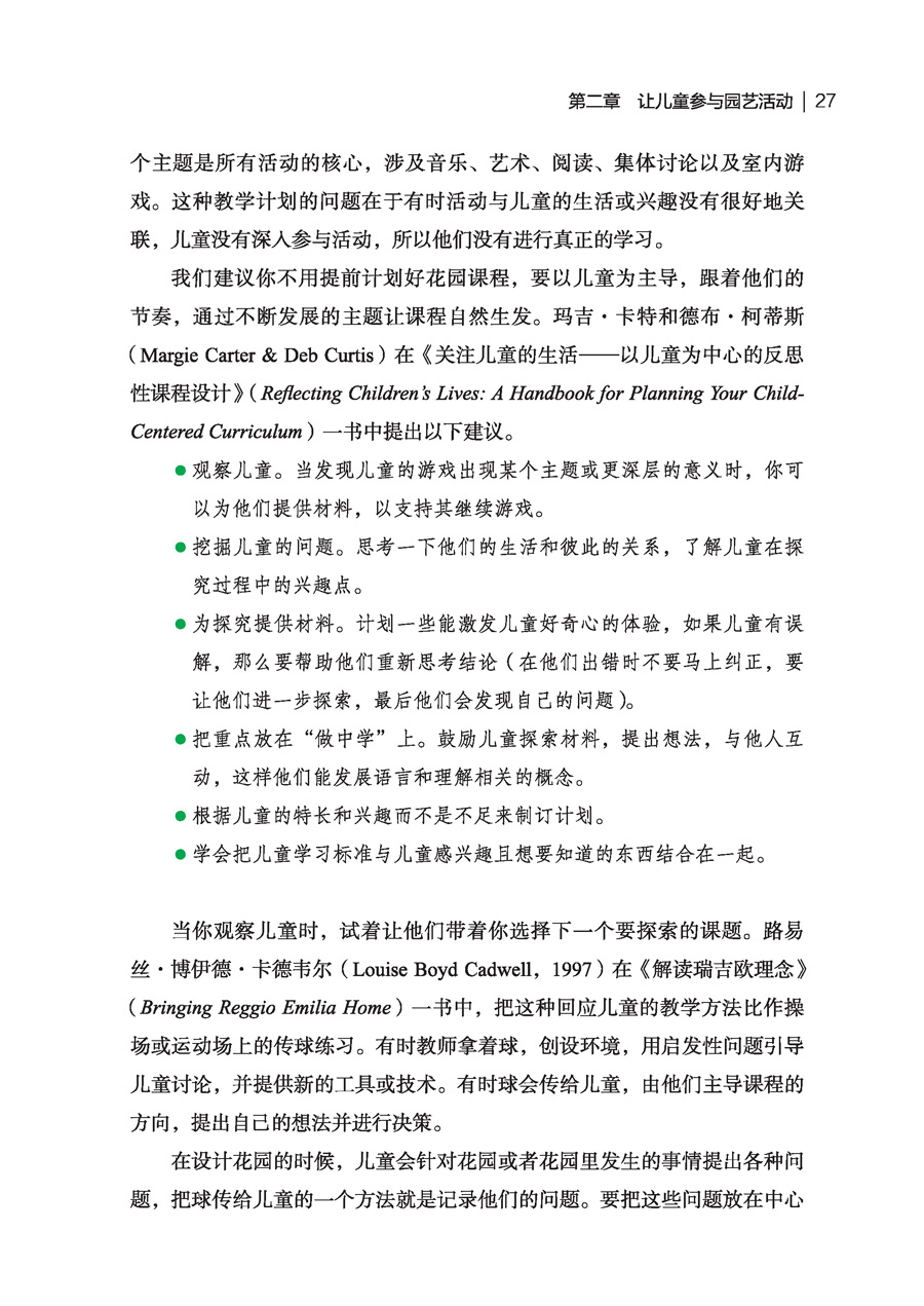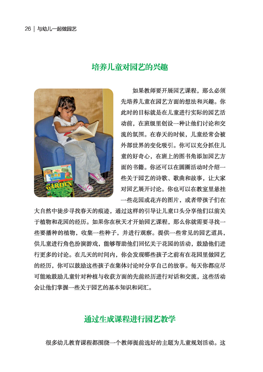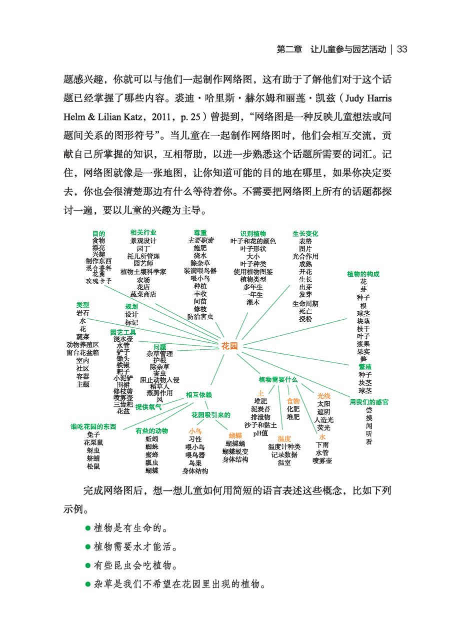 本书作者通过扎实的理论功底和丰富的实践经历,为我们讲述了为什么走进户外自然那么重要,如何利用园艺活动带领0—8岁儿童接触自然并进行有意义的教学活动,如何基于儿童的兴趣点建构花园课程,以及如何将项目教学法应用到花园课程中。同时,她们通过各种案例,为我们展示了如何根据自身实际情况在室内和户外建设不同类型的花园,如何与儿童一起种植和维护花园,并针对采摘、品尝和烹饪活动提出了具体的建议。
