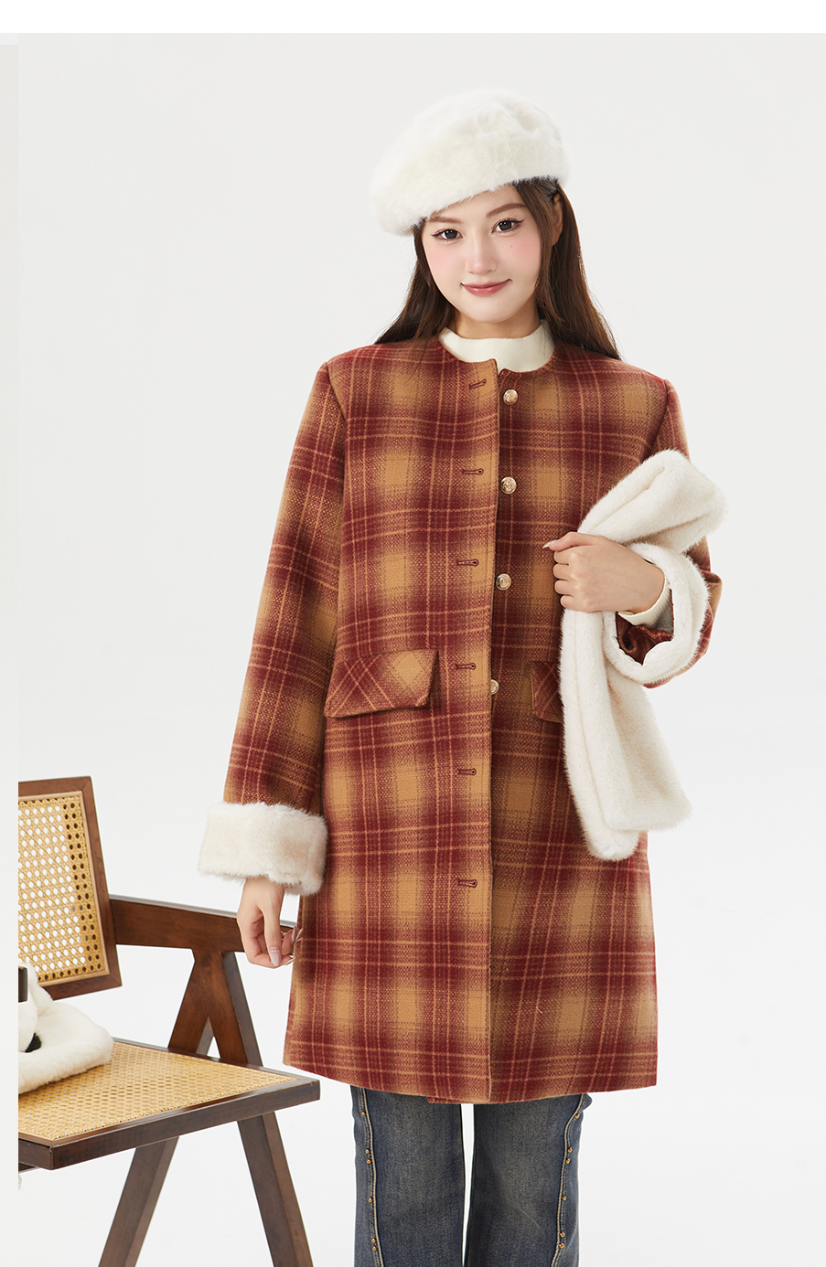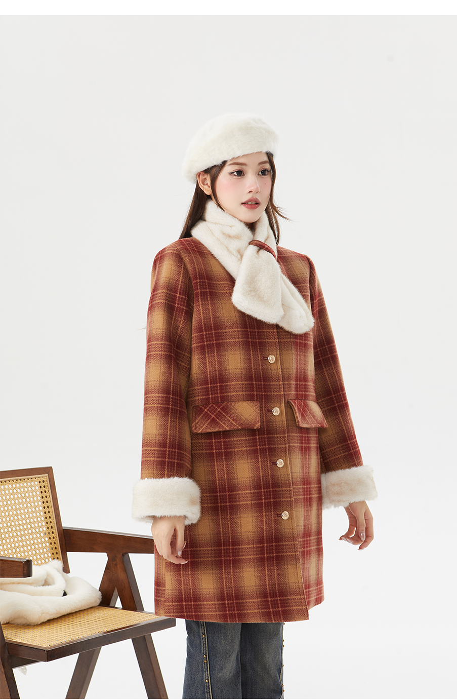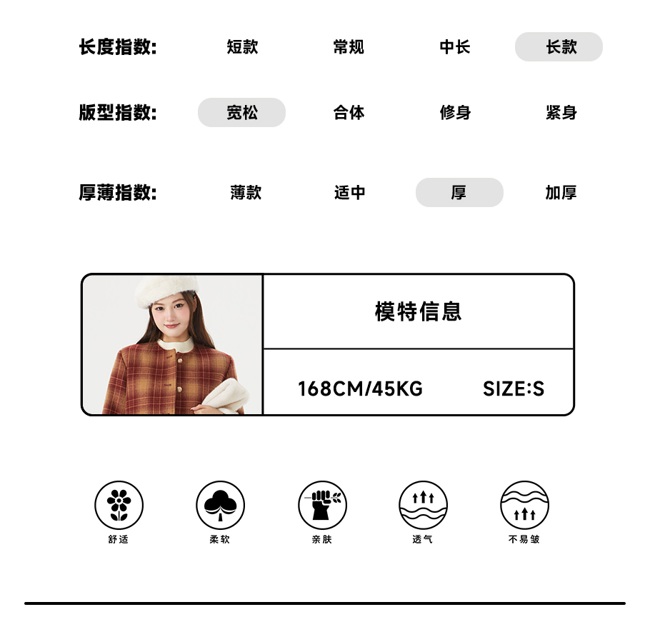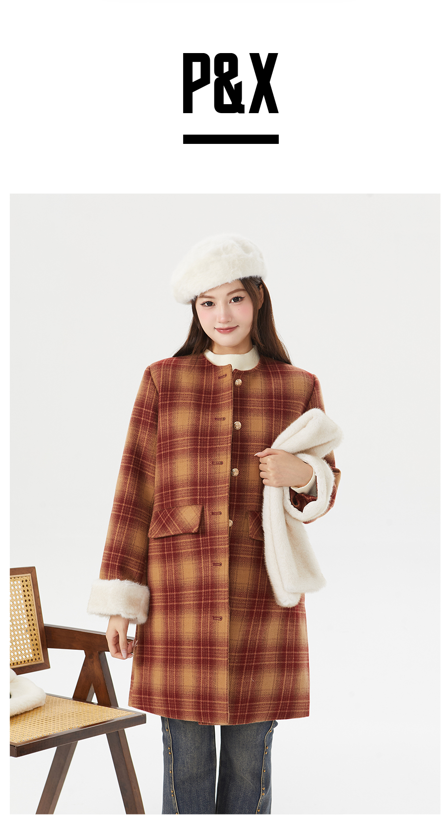 P&X设计师女装冬季格子休闲毛呢呢料中长款外套 824413195 红格