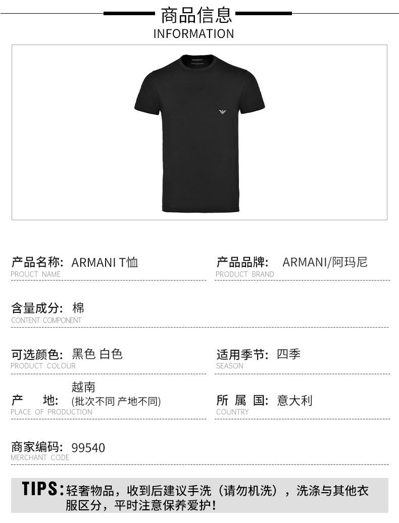 【特惠秒】EMPORIO ARMANI 阿玛尼 男士精品单盒装 舒适休闲 飞鹰logo 打底弹棉T恤 99540